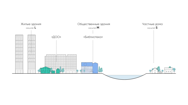 Образ объектов – синергия деревни, города и природы. Общественные здания насыщают среду человеческим масштабом в очень контрастной разномасштабной среде пригорода, где соседствуют монстры многоэтажки и малоэтажные частные домики. Градостроительно общественные здания формируют каркас публичных пространств, создавая систему из трех площадей – городской, детской и водной, формируя место для любых возрастов и активностей.