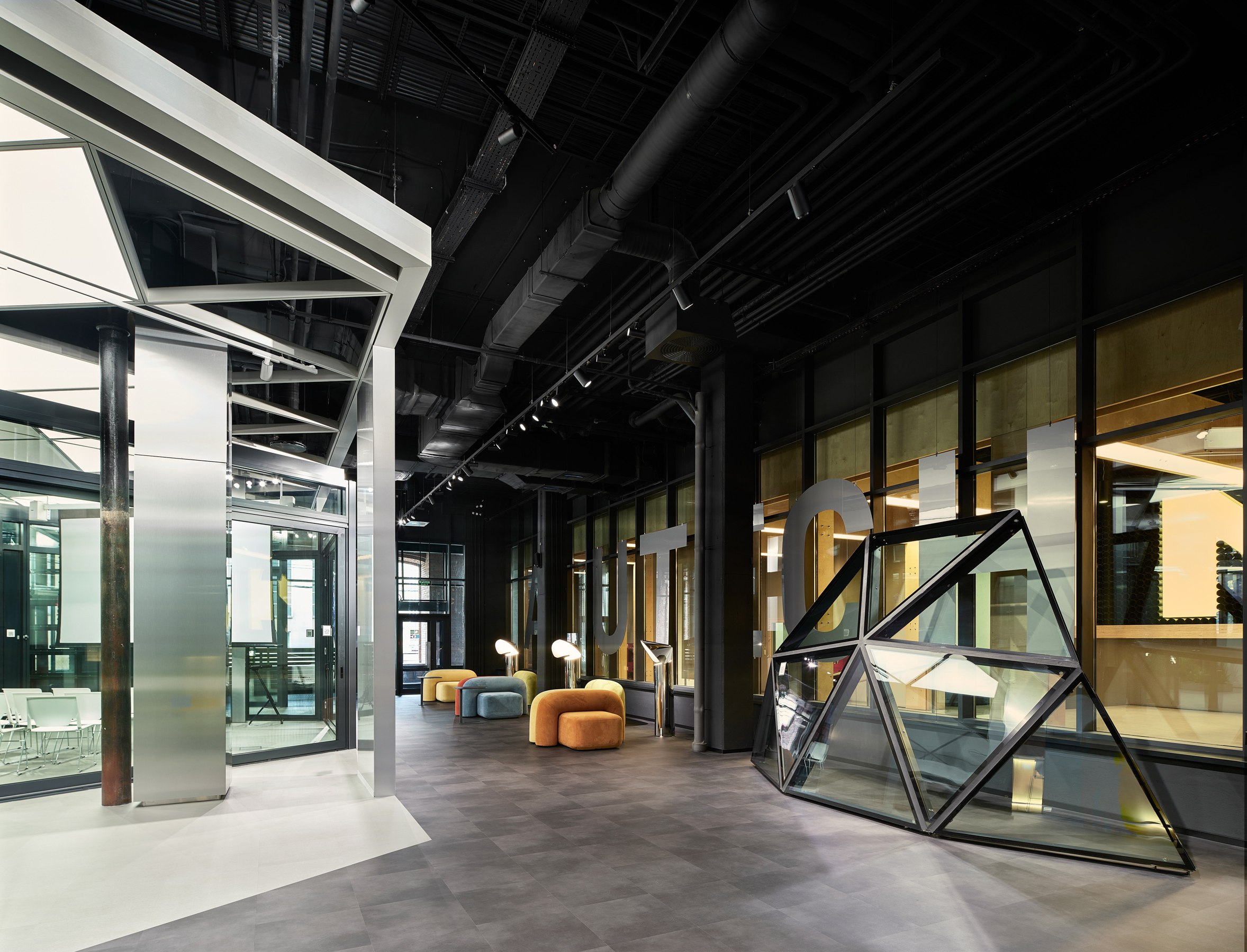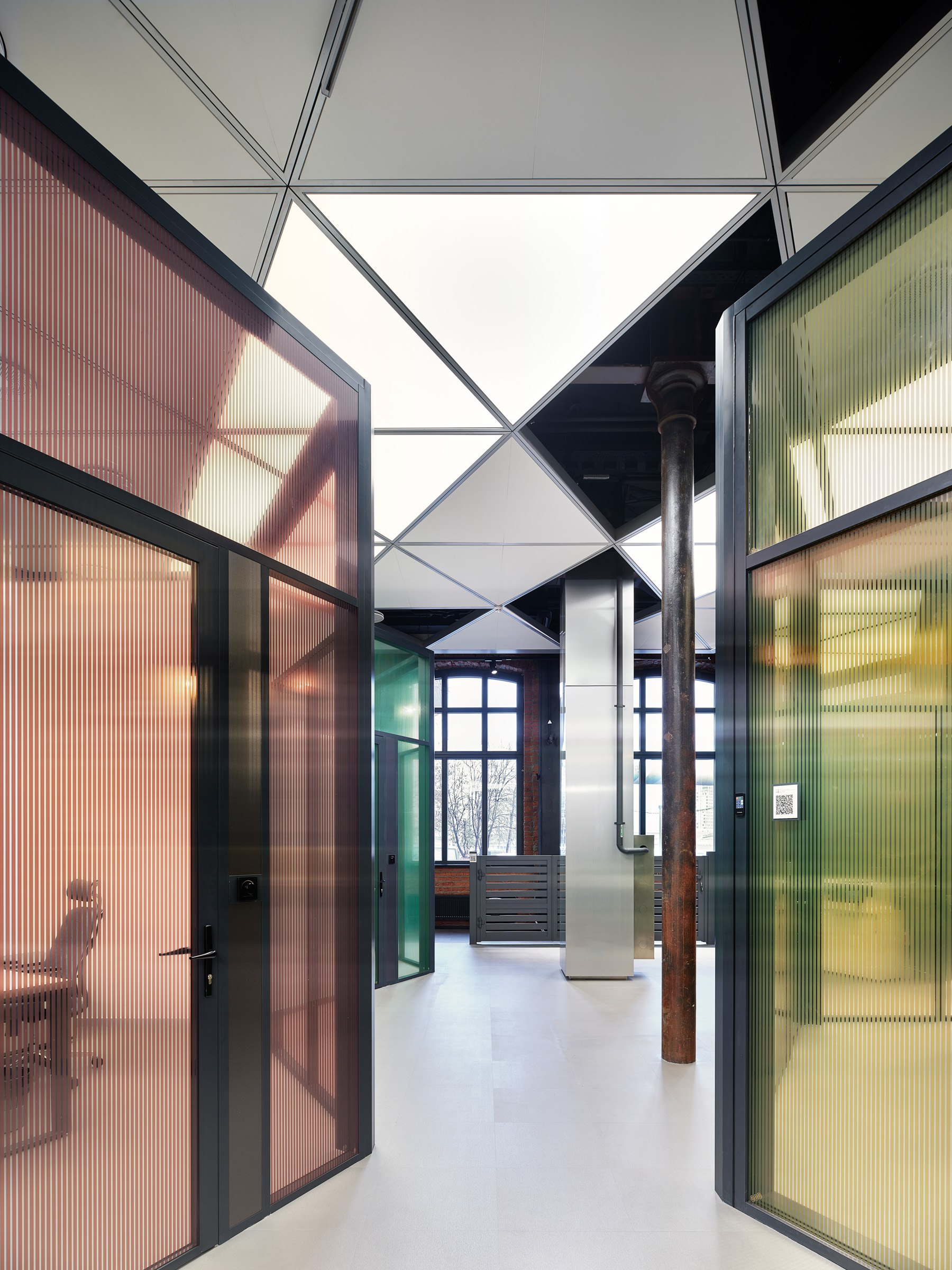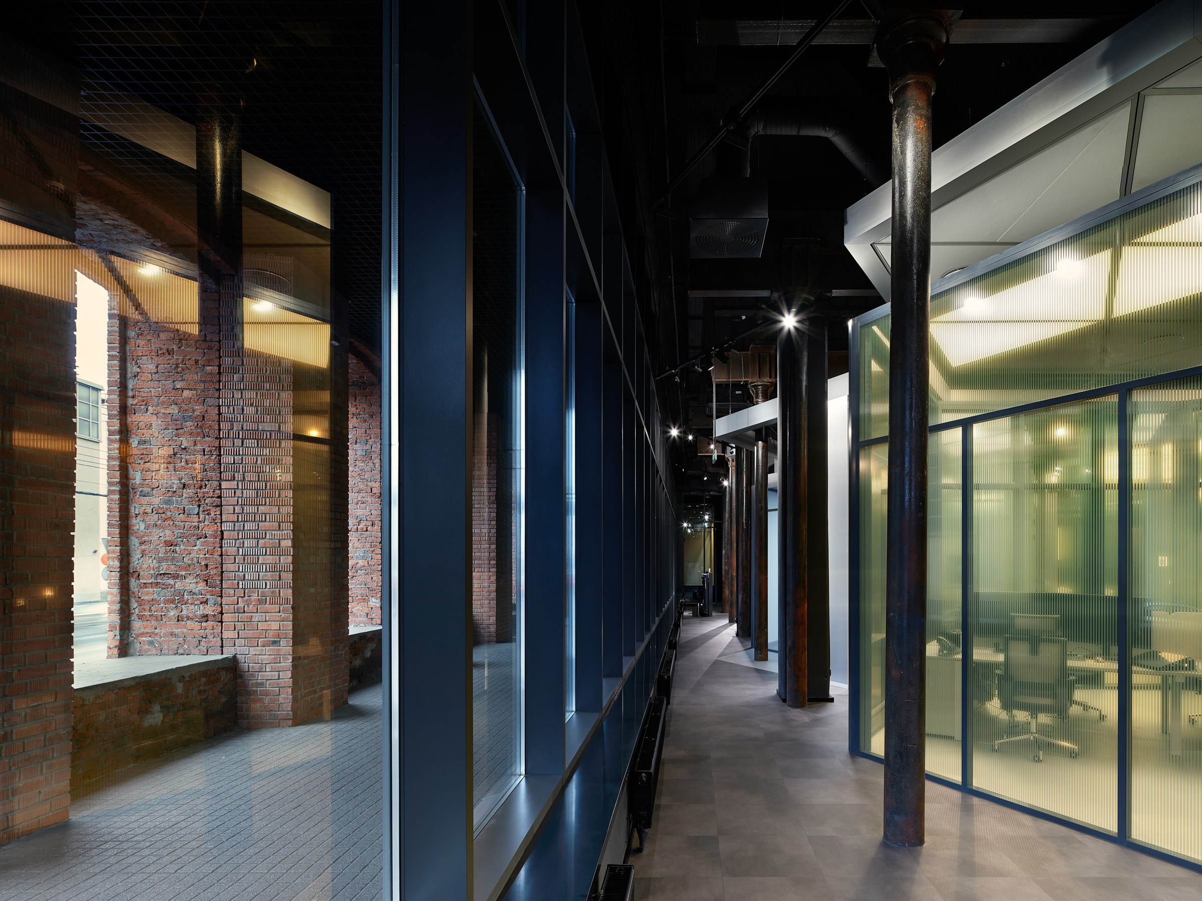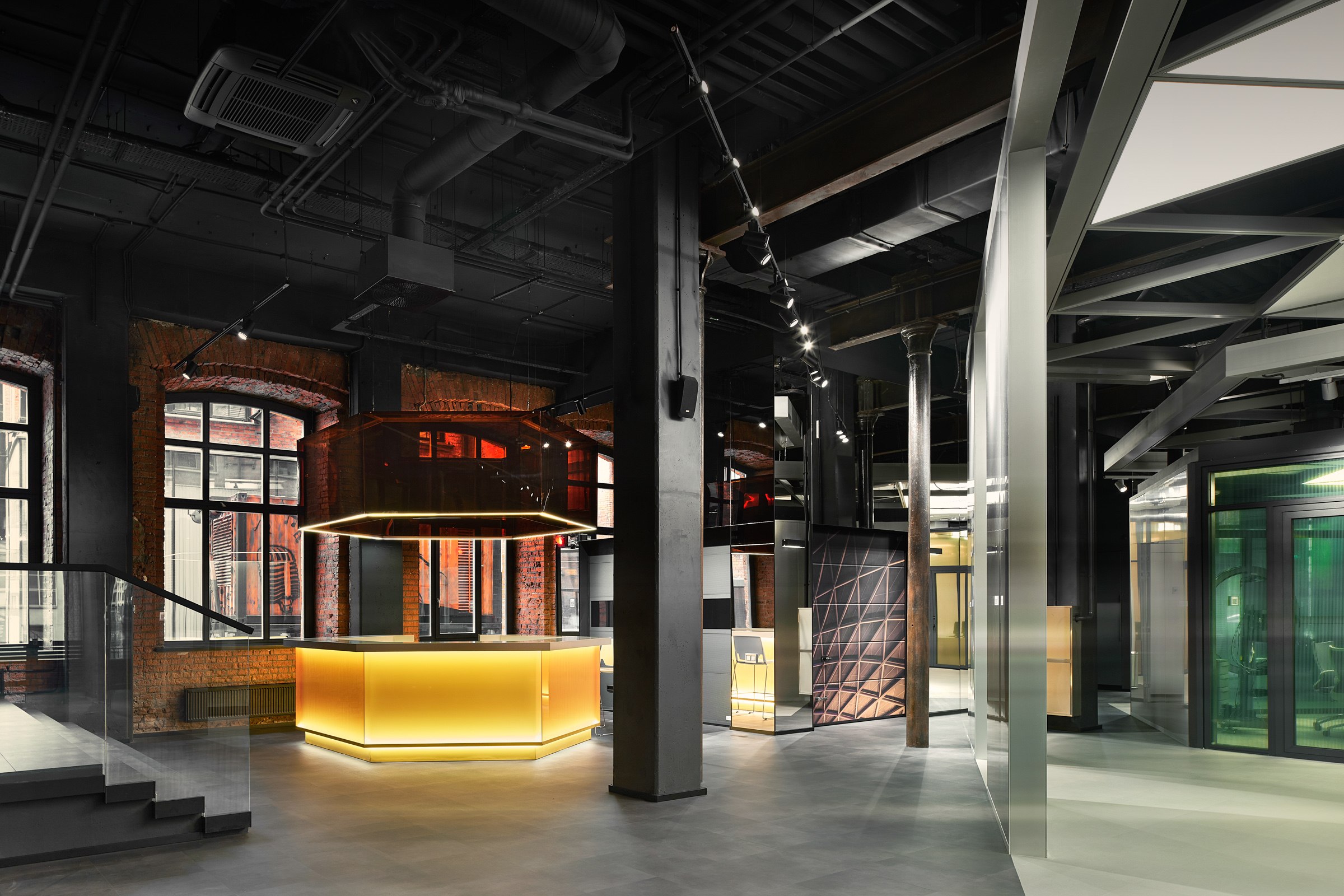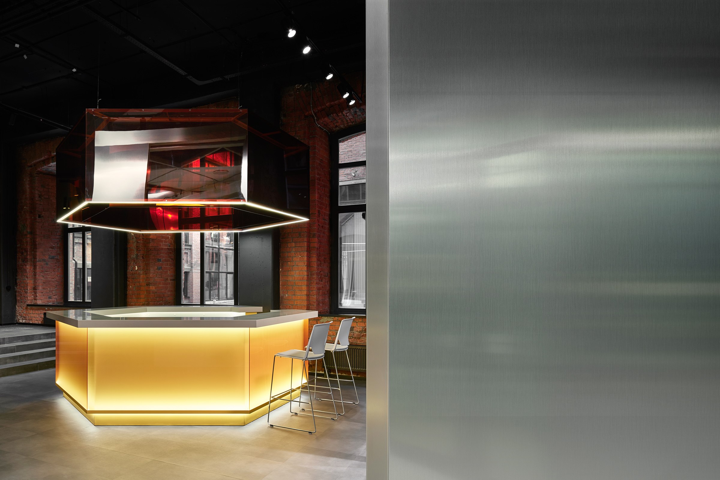 Гексагональная структура стала универсальным планировочным и пространственным решением. Оно структурировало образ «алюминиевого леса» и оживило изначально темное и статичное кирпичное пространство.