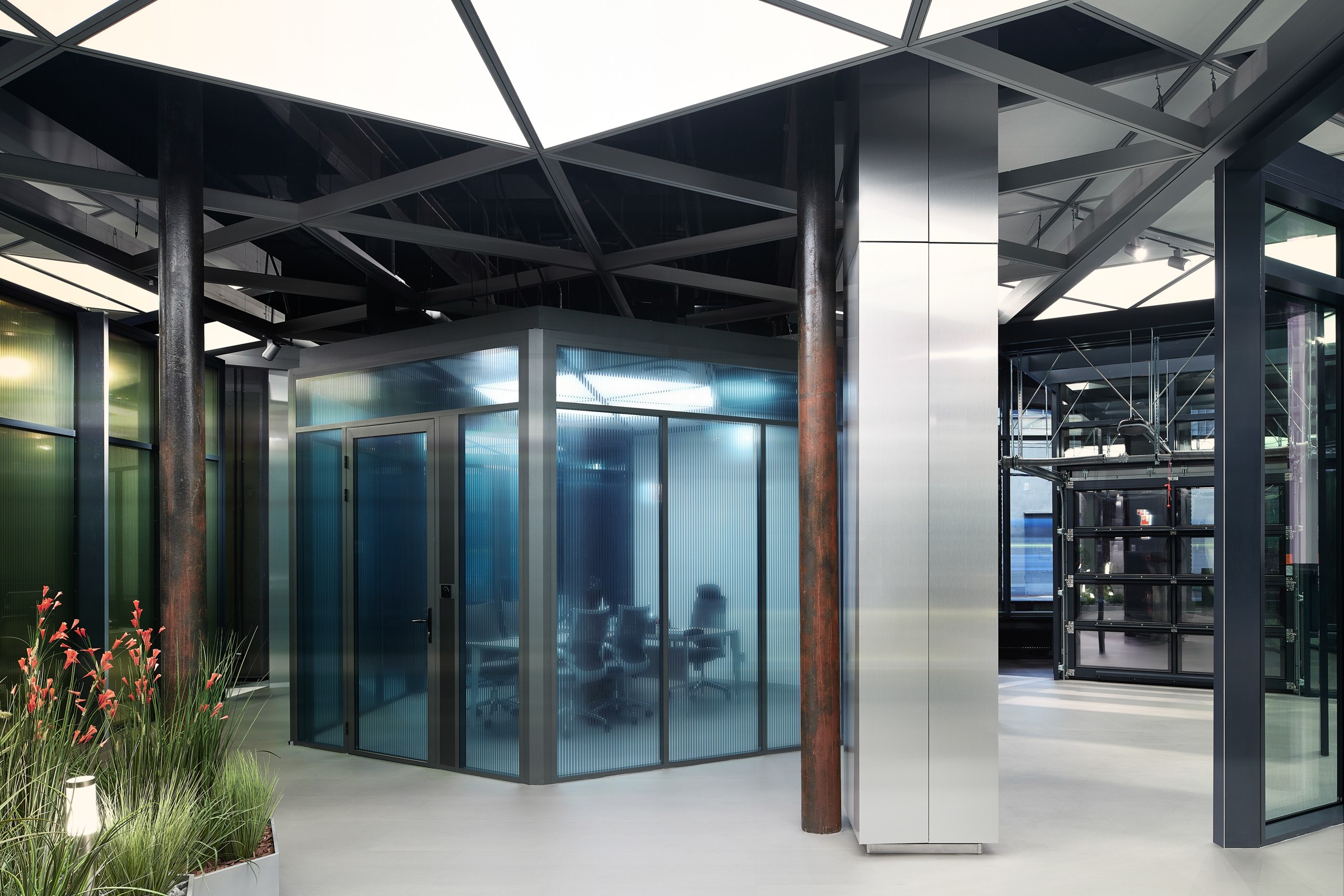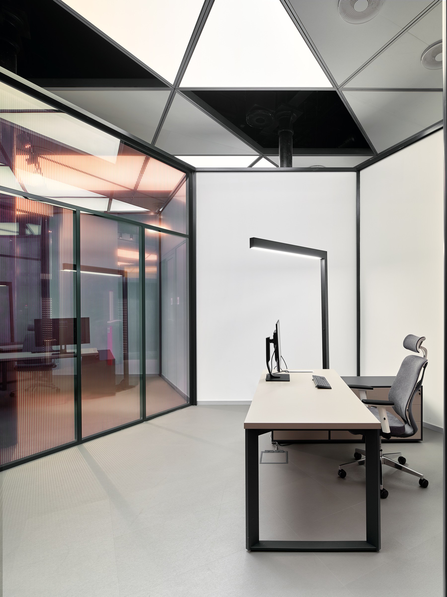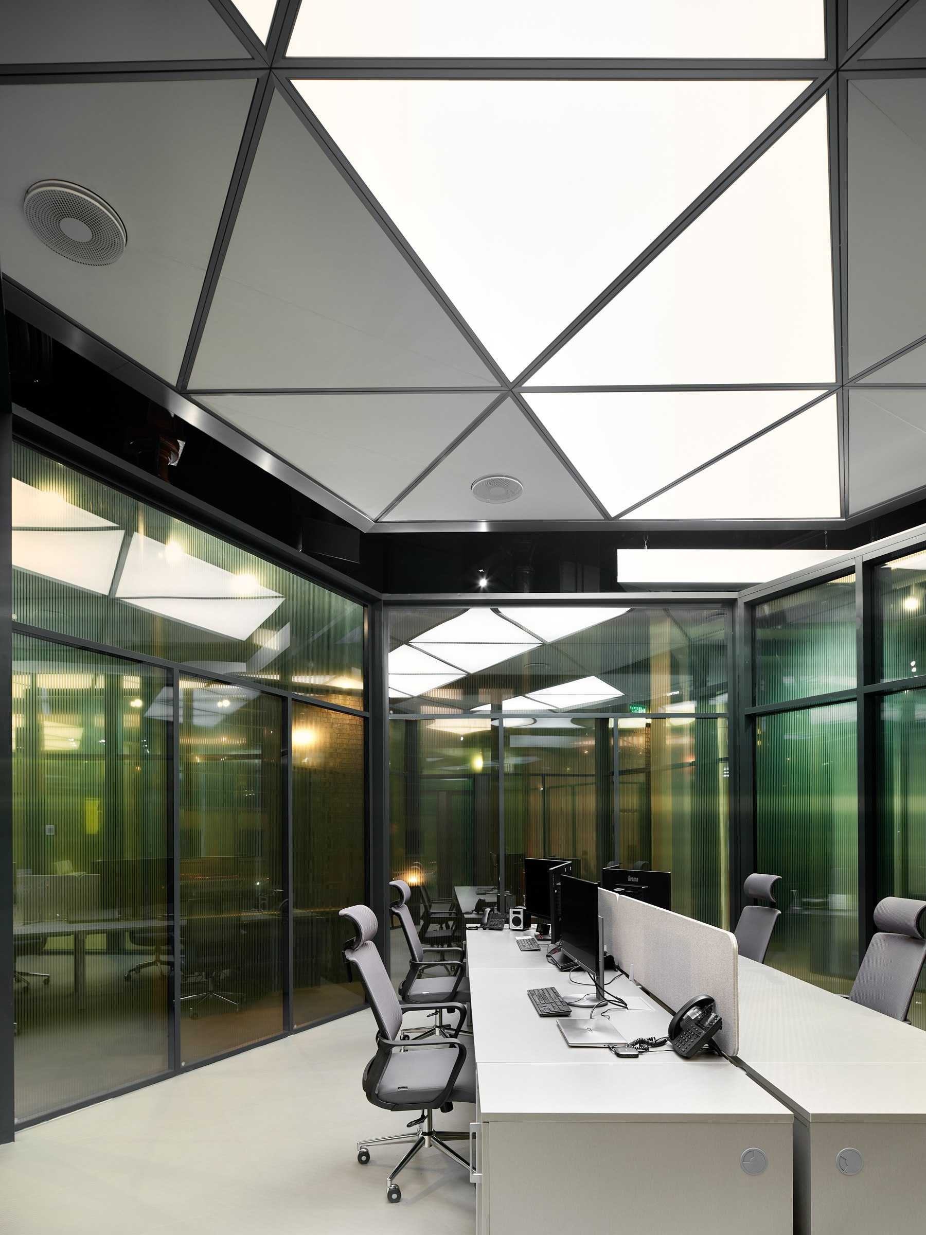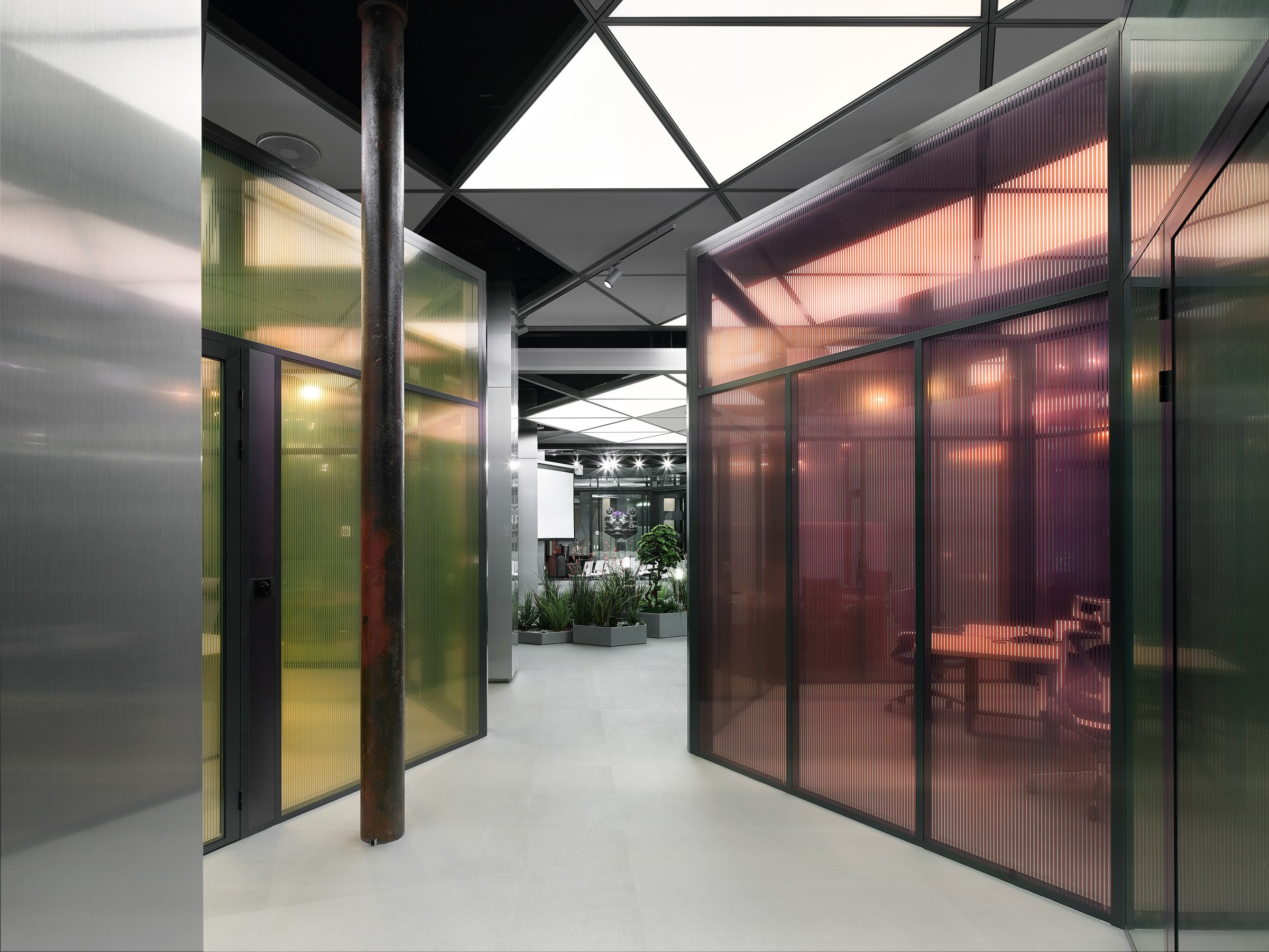 Регулярная сетка колонн стала основой для пространственной профильной структуры. Она приняла форму гексагона, шестиугольной кристаллической решетки оксида алюминия, которым покрываются готовые профили. В результате совмещения двух пространственных матриц проявилась гибкая схема плана. Архитекторы также учли в ней распределение потоков энергии естественного света и траекторию движения от входа в глубину офиса.
