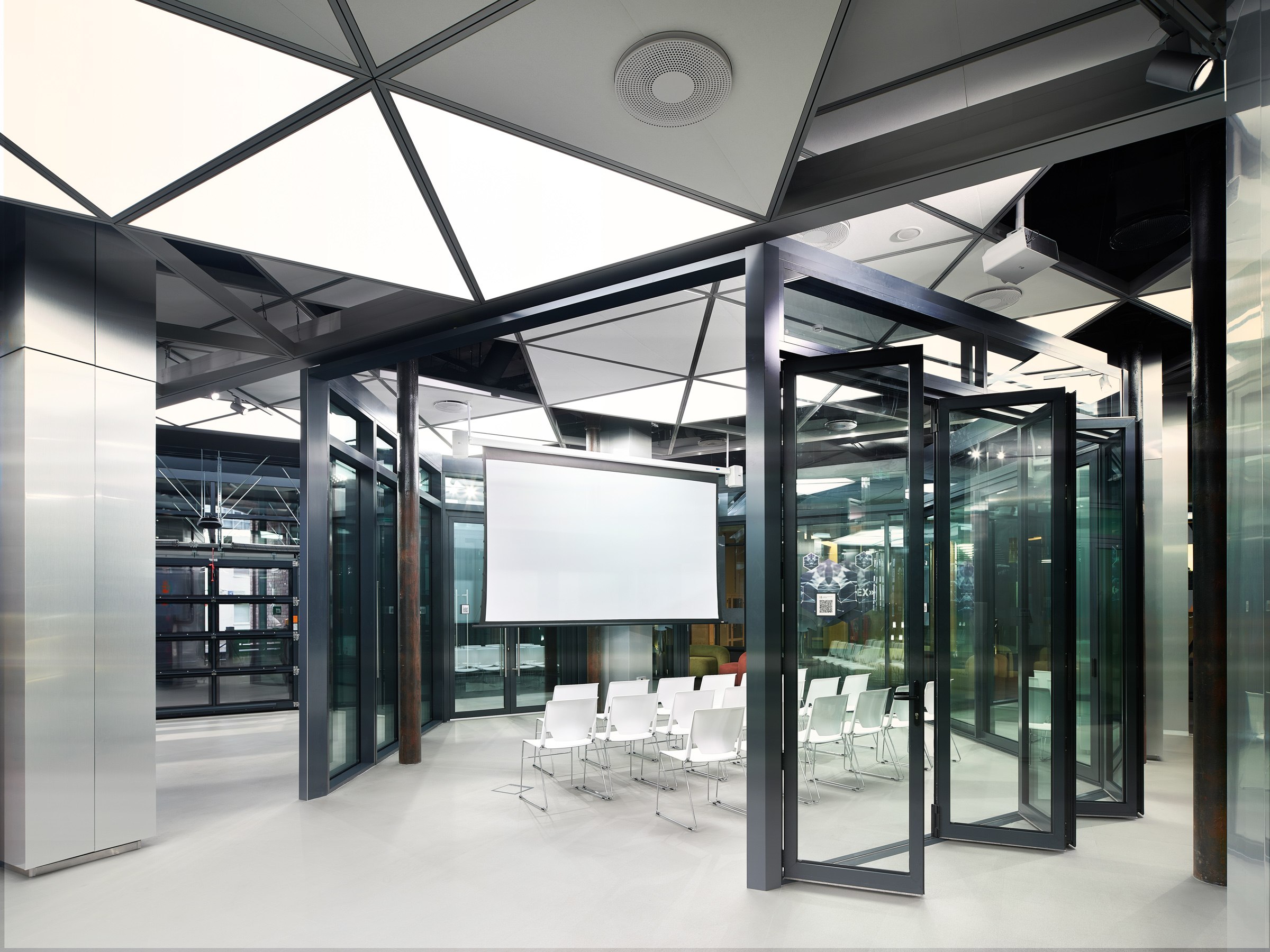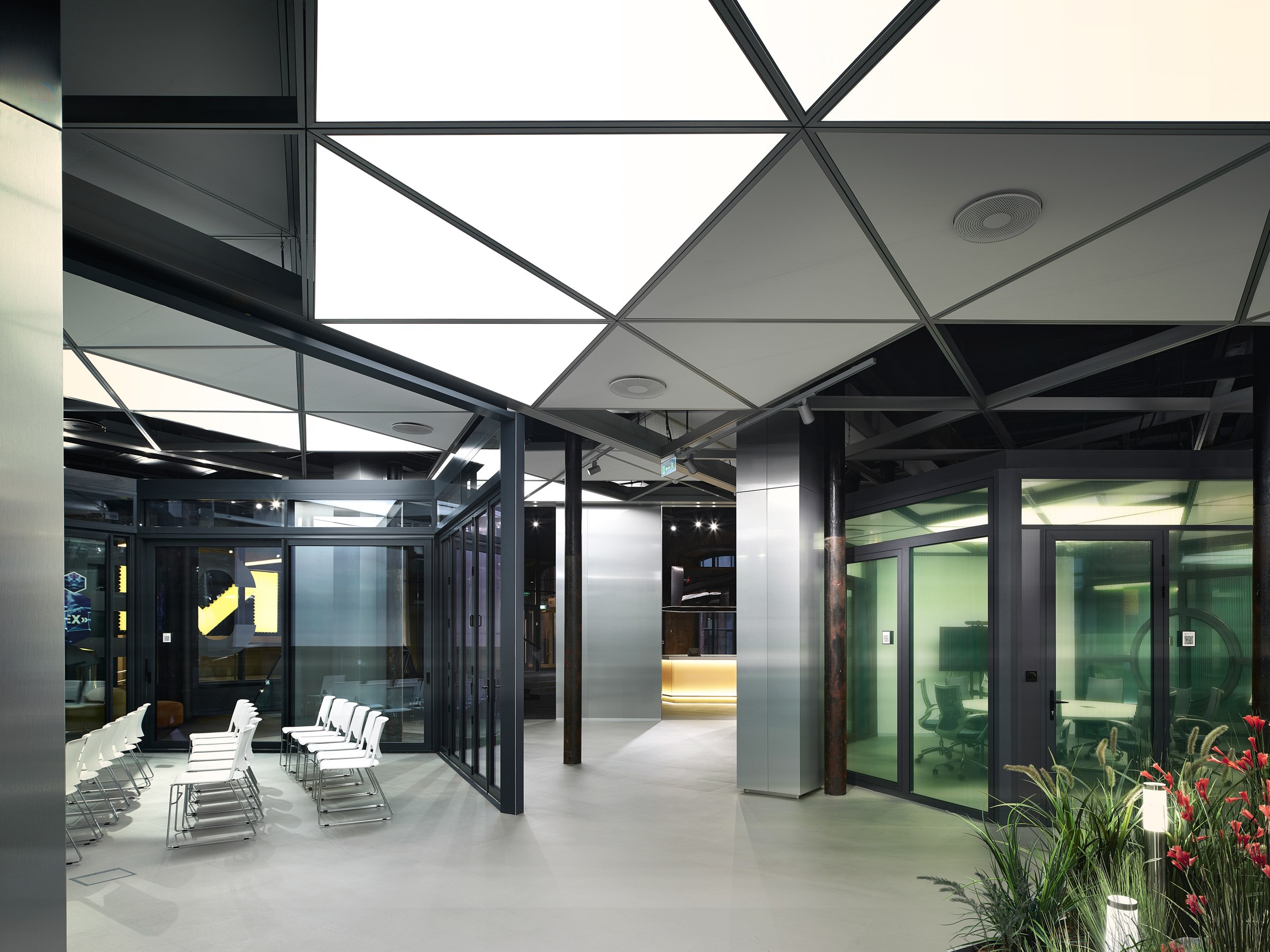 Шестигранна и центральная структура из светло-серебристого алюминия. Нижняя грань этого объема – фальшпол из виниловых панелей, имитирующих металл, а верхняя – потолок, разработанный на основе эскизов VOX Architects из алюминиевого профиля, который традиционно используется для фасадов. Потолочная система собирается из треугольных модулей: основная часть заполнена звукопоглощающим материалом Ecophon, а часть – транслюцентным материалом, который рассеивает свет и абсорбирует звук. Треугольные сегменты создают «небо» над секторами гексагона и объединяют их в пространстве. Уникальный потолок необходим функционально – он обеспечивает шумоизоляцию и скрывает вентиляционные и коммуникационные системы.