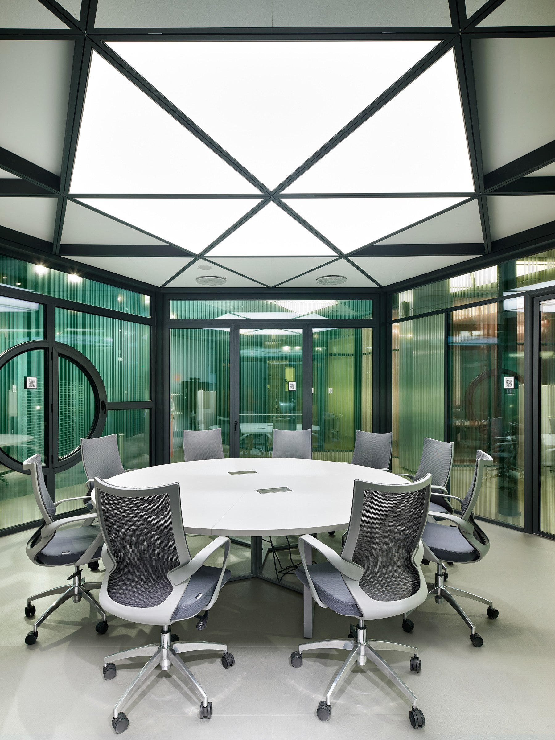 Все ключевые функциональные зоны офисного маршрута шестиугольны: конференц-зал, стеклянные боксы переговорных, максимально удаленные от входа кабинеты руководителей и сотрудников.