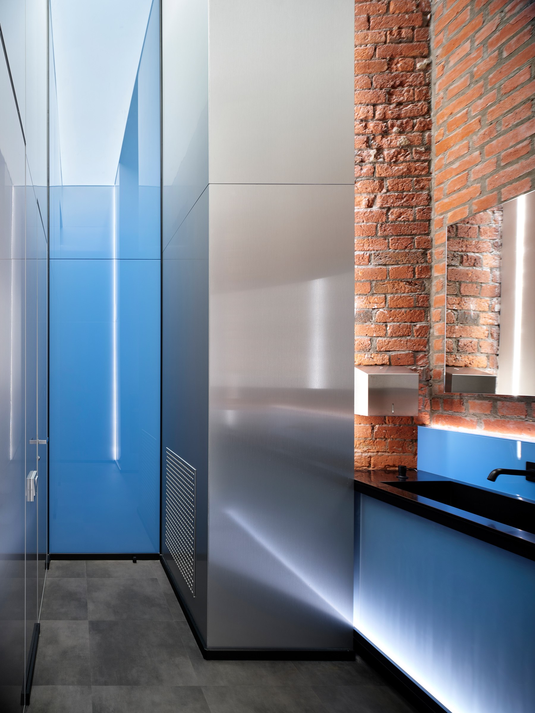 В техническом блоке недалеко от входа размещены гардеробные, санузлы, вентиляционная камера, кофе-пойнт, а также комната для хранения и демонстрации гостям образцов алюминиевых профилей и механизмов, роллетных систем и гаражных ворот. Этот внушительный объем растворяют в пространстве зеркальные облицовочные панели.