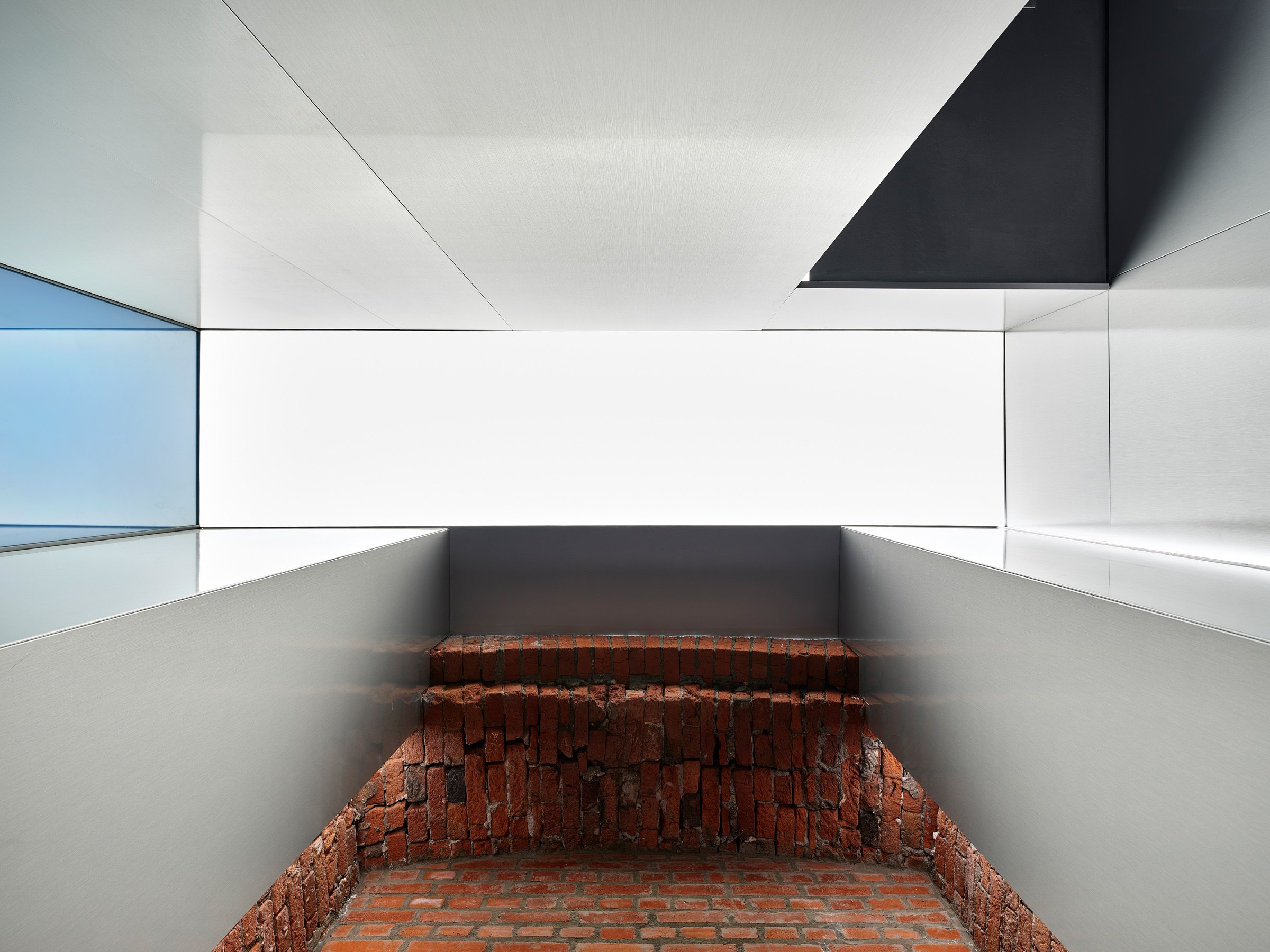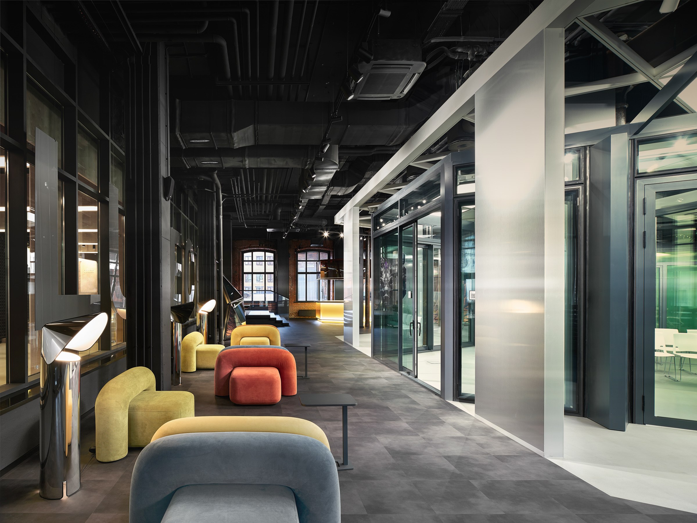 Сияние экспозиционной площадки, где демонстрируются инновационные системы «алюминиевого леса», поддерживает продуманный световой сценарий – периметр вдоль кирпичных стен исторического фасада наоборот сознательно затемнен и погружен в антрацитовые тона.