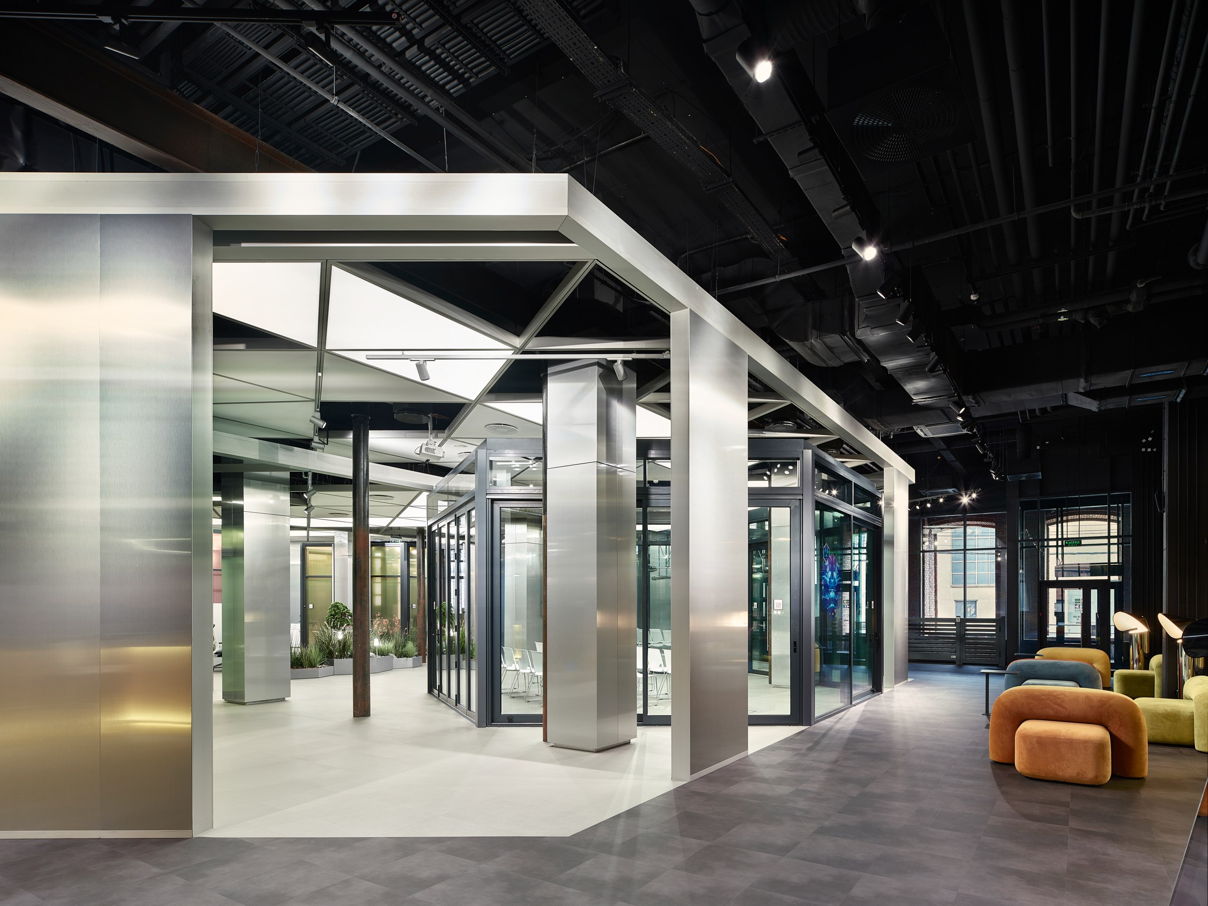 Архитекторы представили концепцию офиса как «алюминиевый лес», вырастающий из высокотехнологичных металлических конструкций. Роллетные системы, гаражные ворота, профили, изготовленные по сложнейшим матрицам, – главный строительный материал этого многоуровневого экспозиционного пространства. Прием «архитектура в интерьере», который VOX Architects практикуют в своих проектах, обеспечил реализацию всех поставленных заказчиком целей.