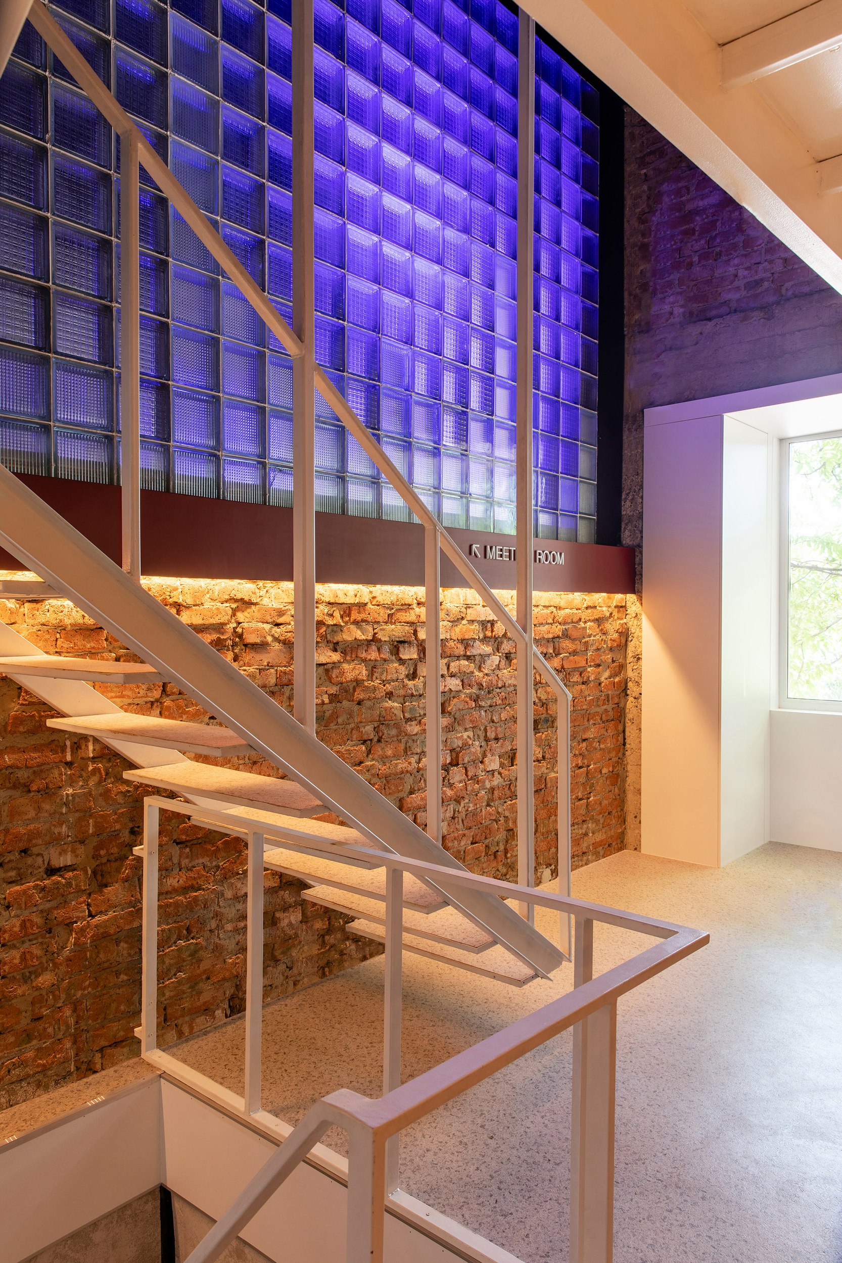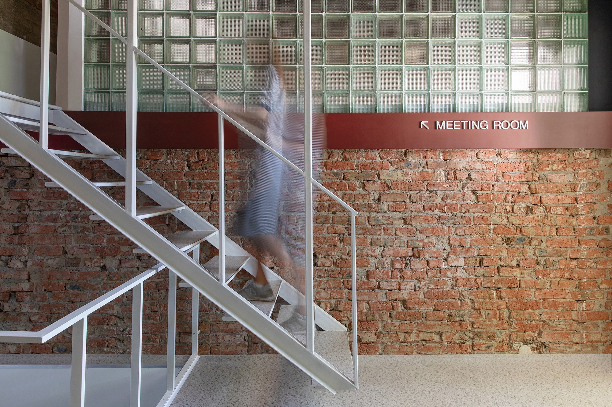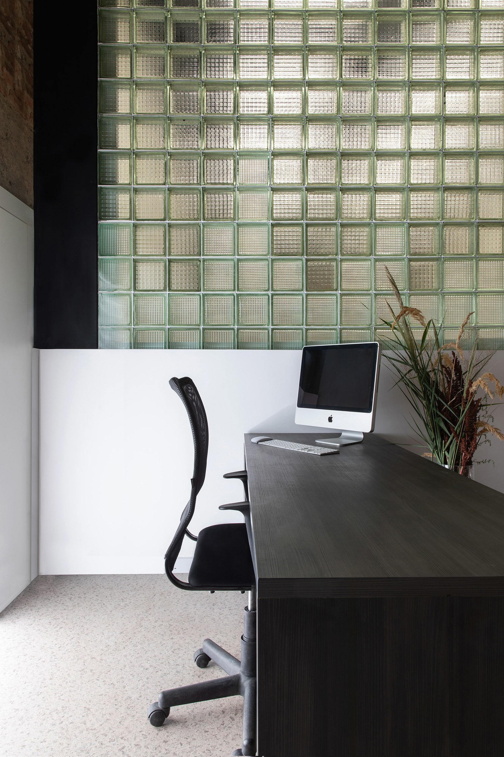 У заказчика был скромный бюджет, основная часть которого пошла на оборудование второго уровня, поэтому архитектор максимально сохранил имеющиеся на стройке материалы и использовал их повторно. Например не было возможности сделать дорогую штукатурку и стены были очищены до кирпича, чтобы проявить его богатую текстуру. Также в помещении были перегородки из советского стеклоблока с разным узором, они были разобраны, тщательно очищены и уложены заново так, чтобы образовать рисунок эквалайзера, который напоминает о деятельности компании. Новые конструкции выполнены из белых и гладких материалов, чтобы на контрасте выделить достоинства старых покрытий.