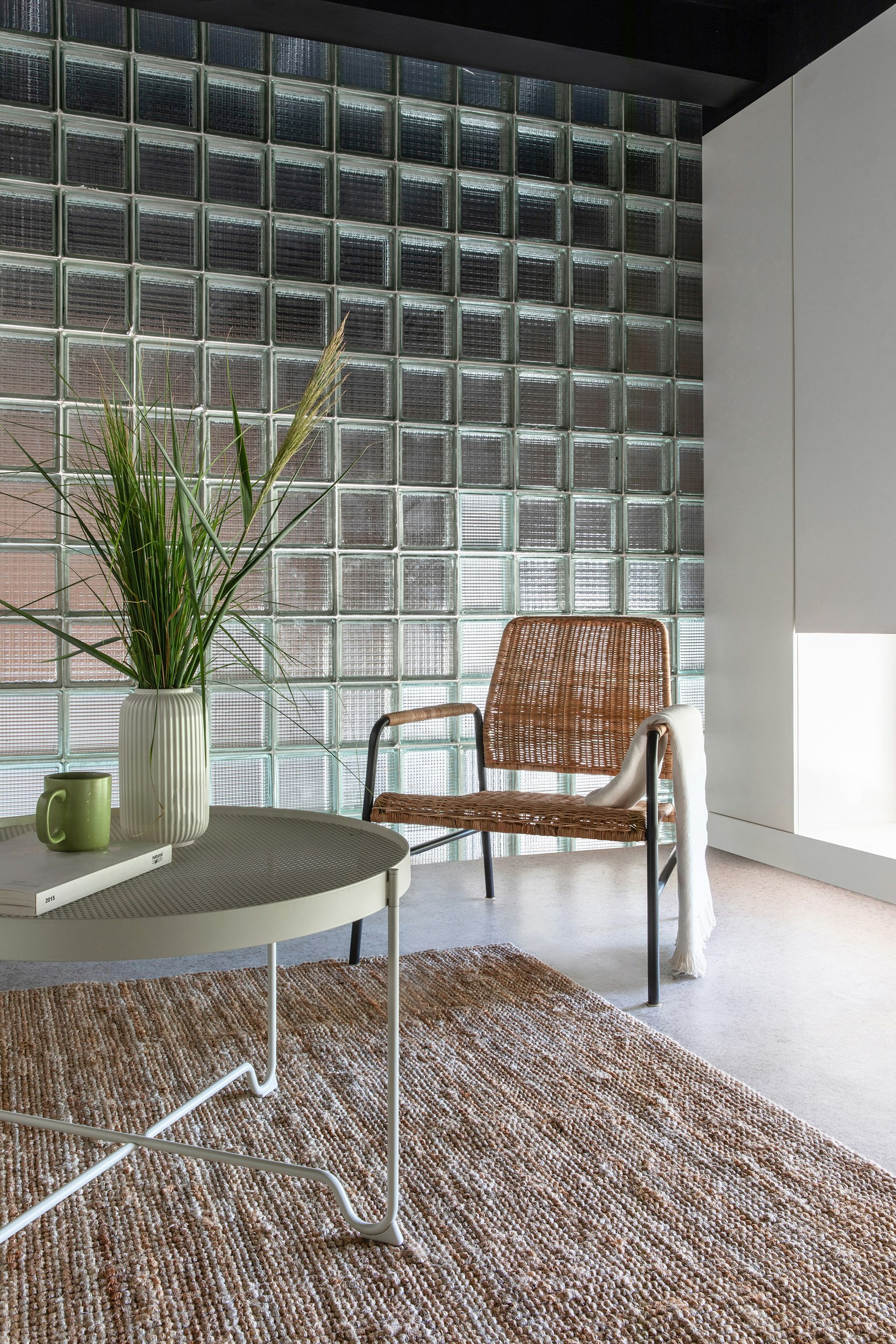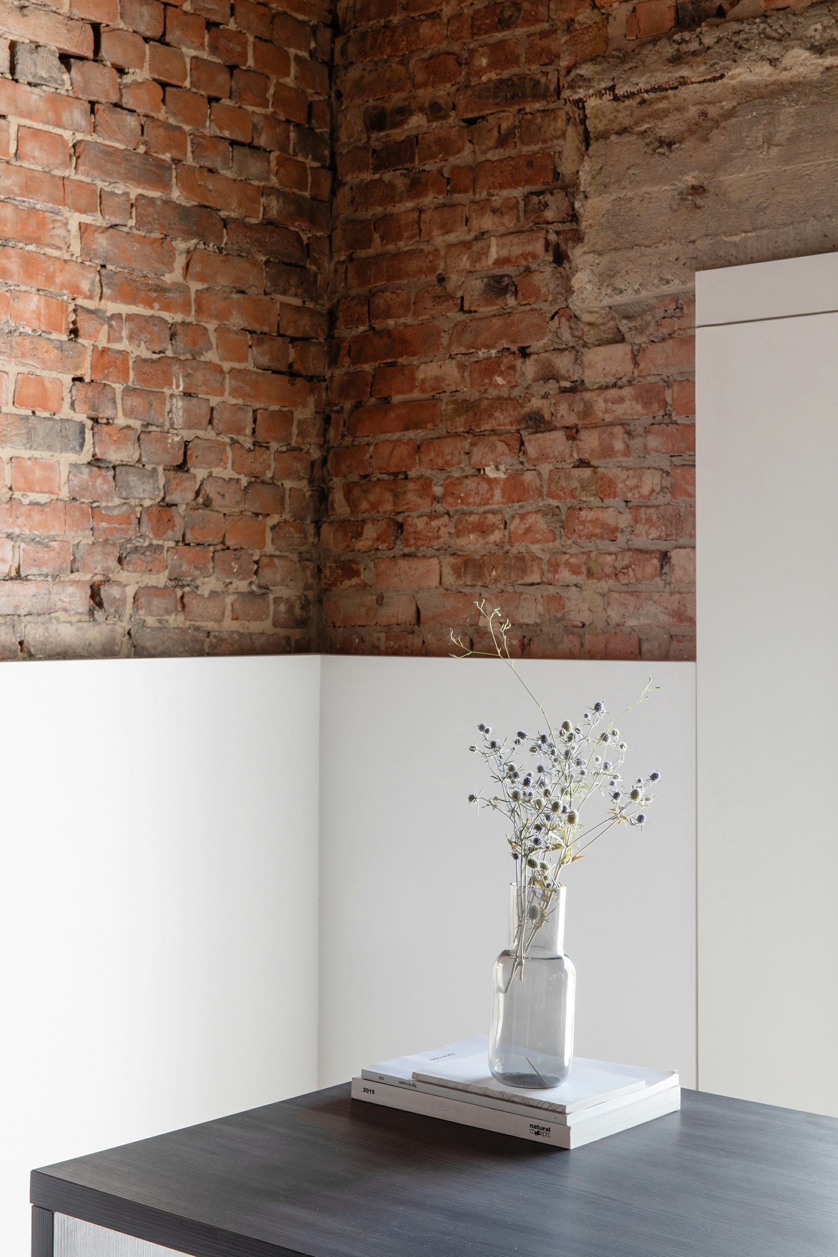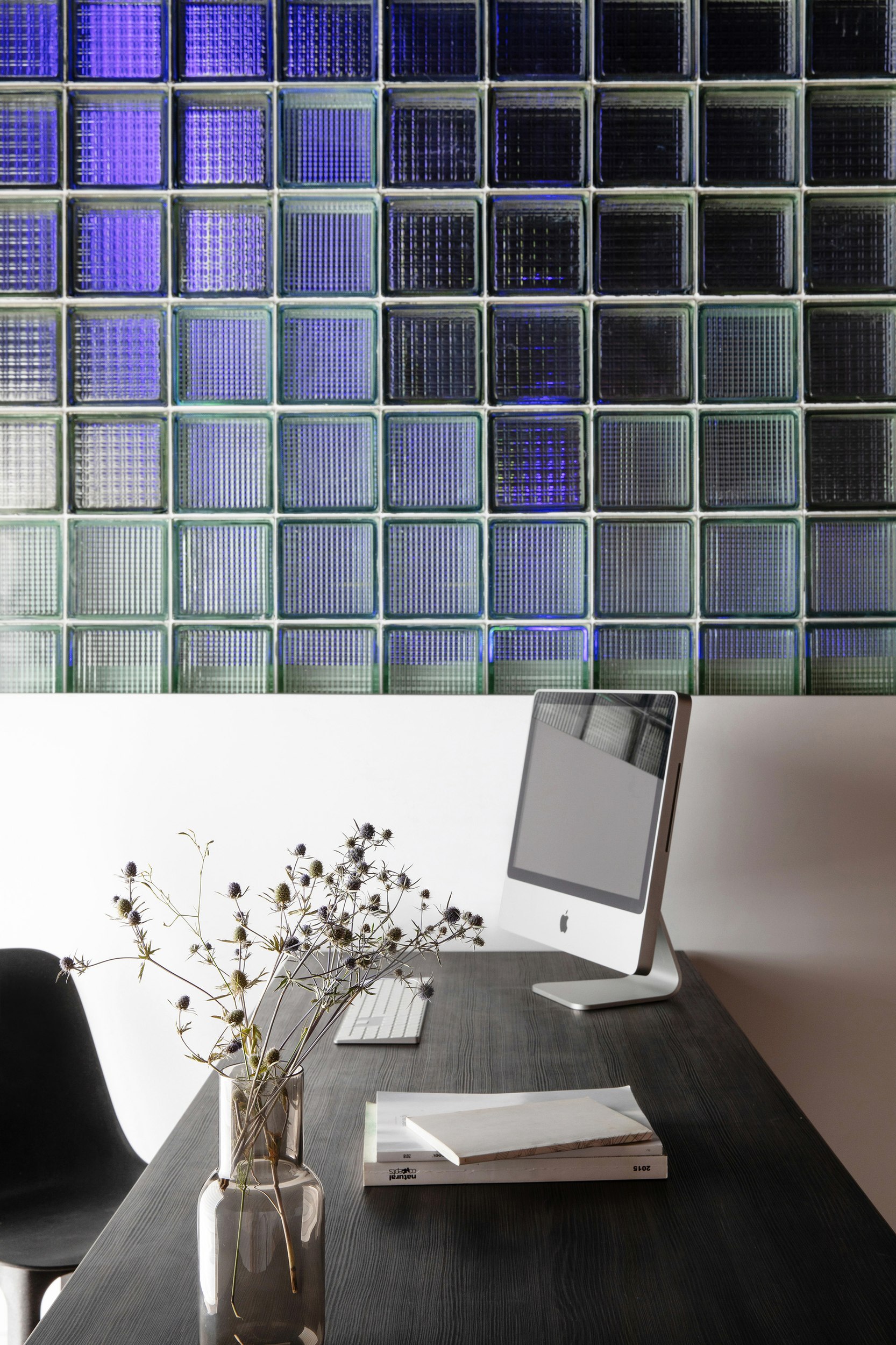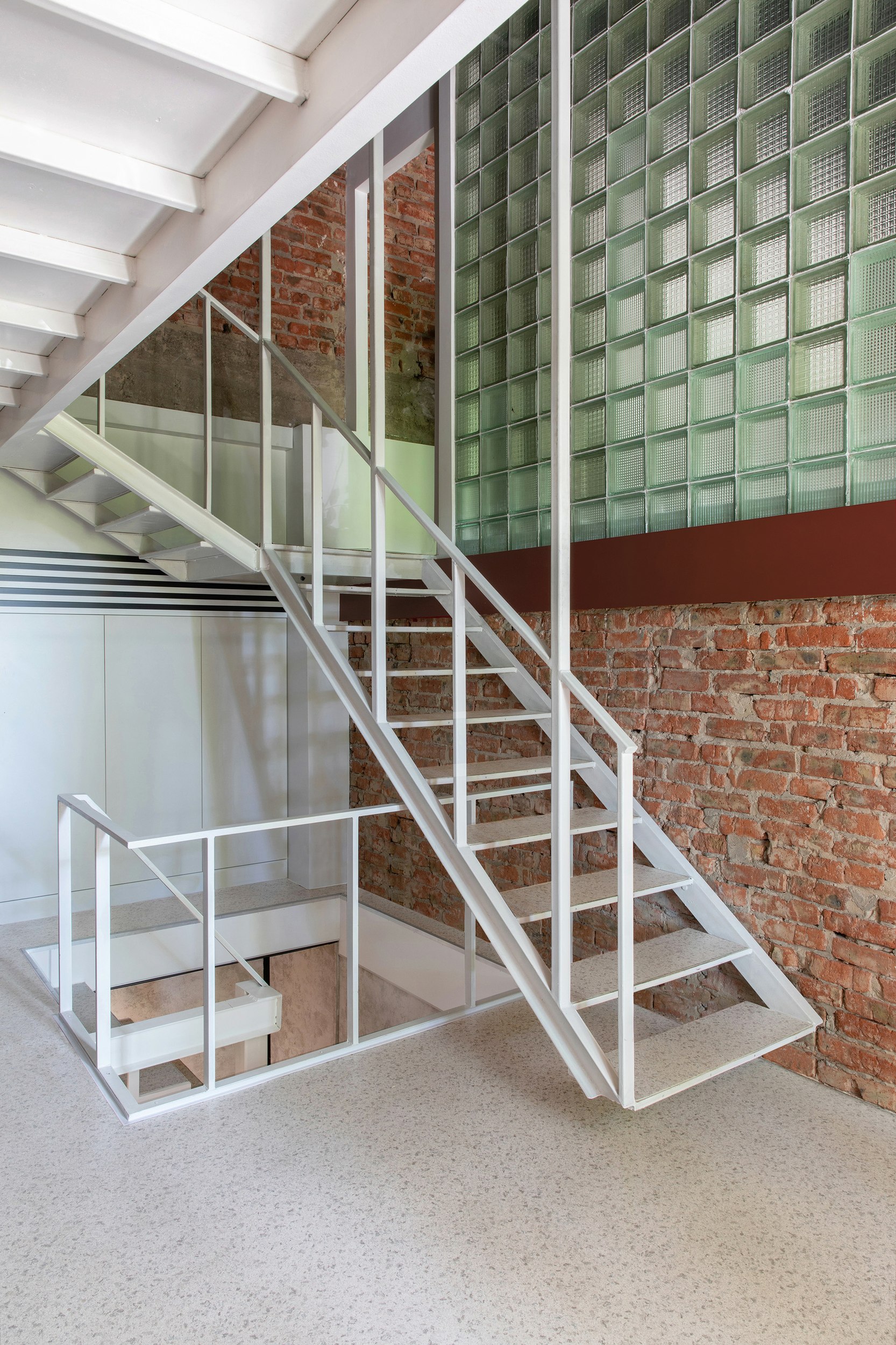 У заказчика был скромный бюджет, основная часть которого пошла на оборудование второго уровня, поэтому архитектор максимально сохранил имеющиеся на стройке материалы и использовал их повторно. Например не было возможности сделать дорогую штукатурку и стены были очищены до кирпича, чтобы проявить его богатую текстуру. Также в помещении были перегородки из советского стеклоблока с разным узором, они были разобраны, тщательно очищены и уложены заново так, чтобы образовать рисунок эквалайзера, который напоминает о деятельности компании. Новые конструкции выполнены из белых и гладких материалов, чтобы на контрасте выделить достоинства старых покрытий.