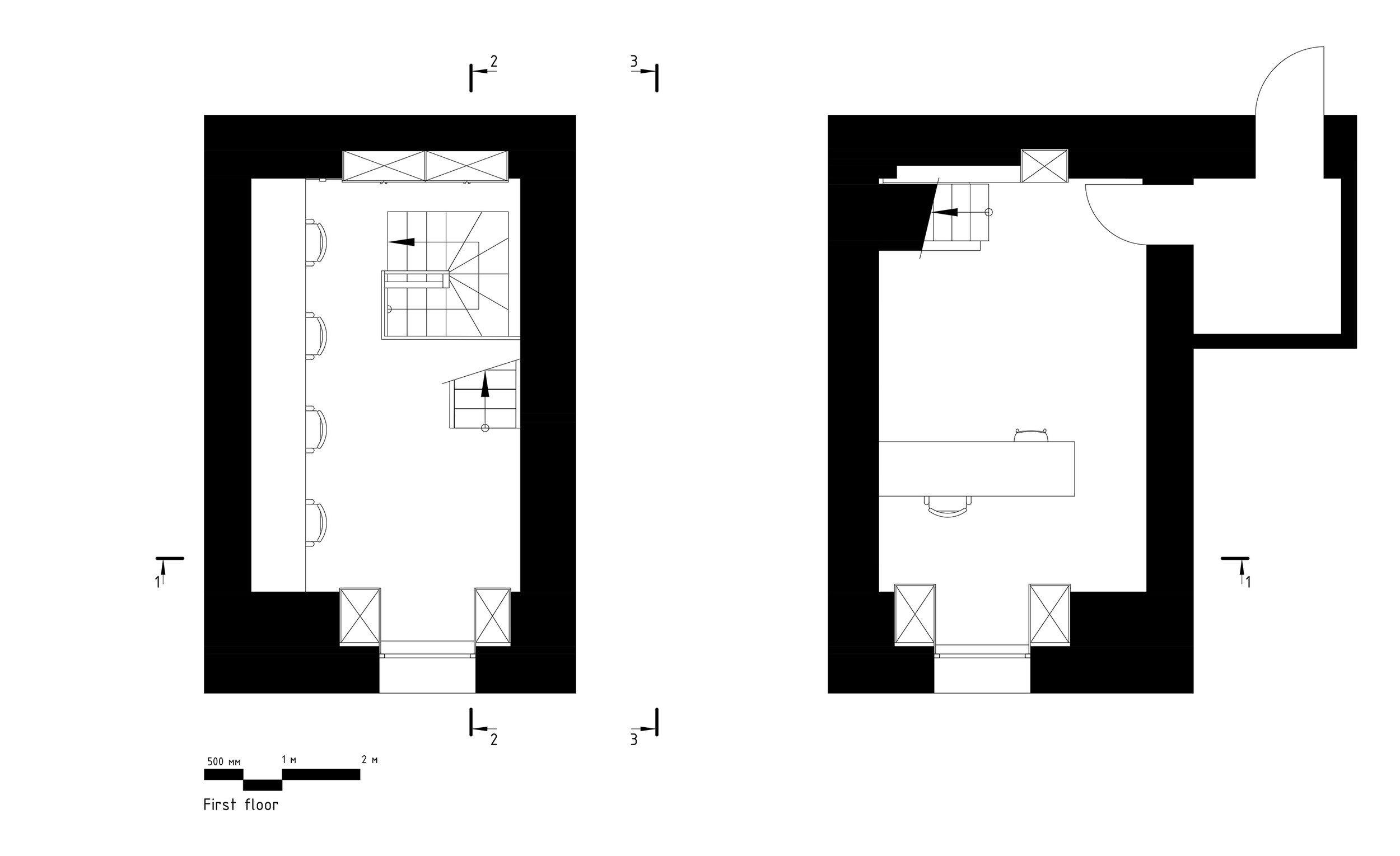 Помещение состоит из трех комнат расположенных вокруг сквозного проезда, при этом за годы эксплуатации они много раз перестраивались и в результате архитектор получил комнаты с тонкими деревянными полами на разных уровнях.