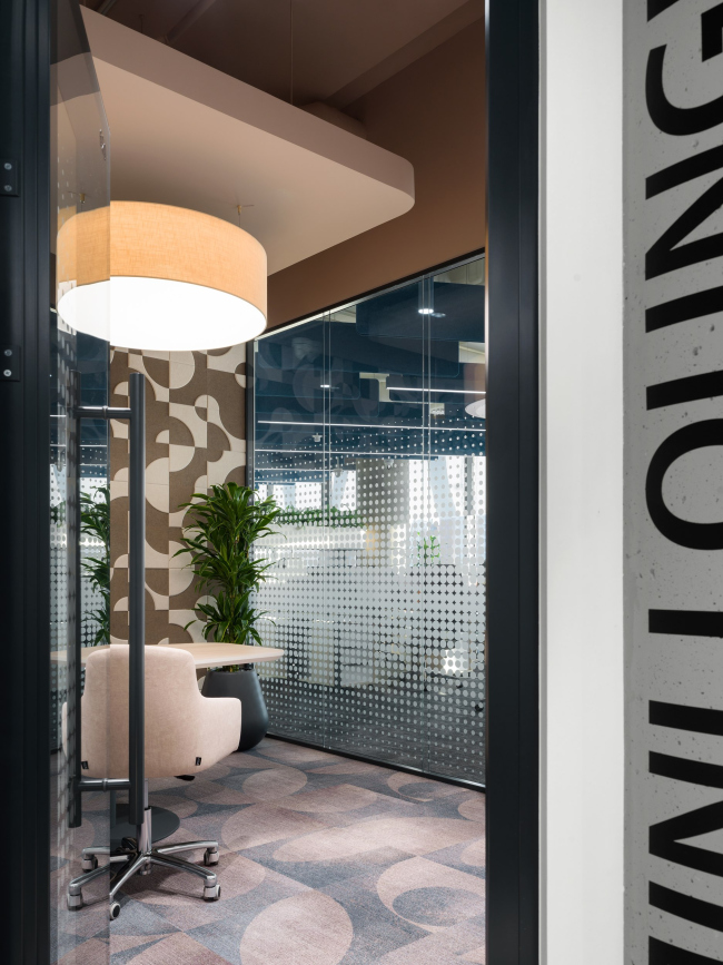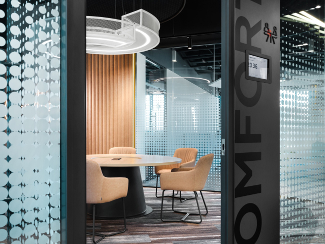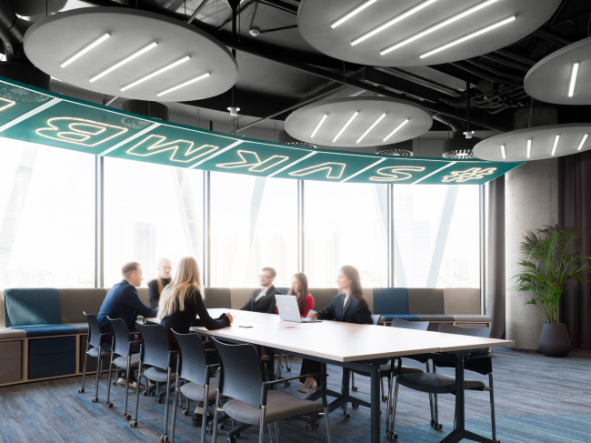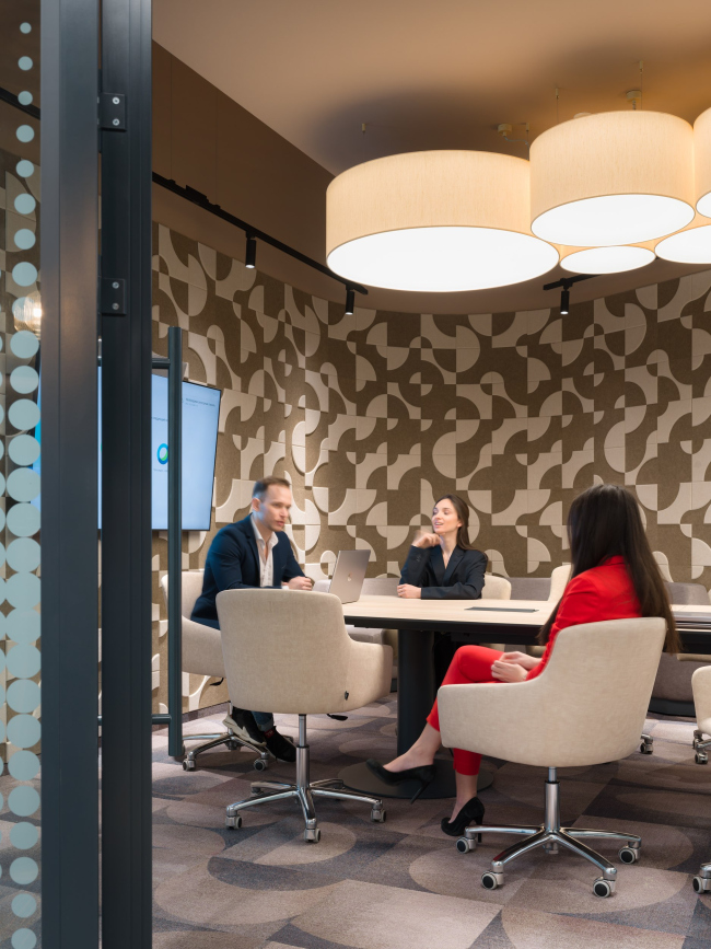 Командная работа является важной частью всех корпоративных процессов банка, а ее поддержка требует гибких решений и возможности выбора подходящего формата для решения поставленных задач. Поэтому переговорные зоны организованы в качестве основных точек притяжения в офисе. Такой принцип реализован через оборудование мульти форматных переговорных пространств. Каждая рабочая группа офиса может подобрать и забронировать себе переговорную в зависимости от цели совещания, состава участников и характера встречи.