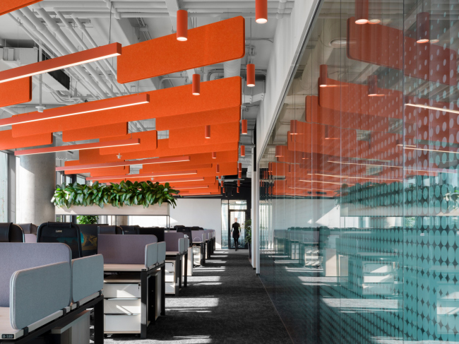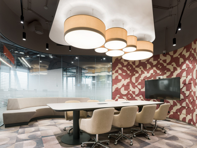 В офисах с открытой планировкой одна из основных задач – формирование комфортной акустической среды. Для решения этой задачи архитекторы применили на основных поверхностях (пол, потолок, стены) решения, обеспечивающие акустический комфорт и одновременно выполняющие важную декоративную функцию. При этом дизайн каждого такого элемента проработан индивидуально и в проекте нет ни одной типовой позиции.