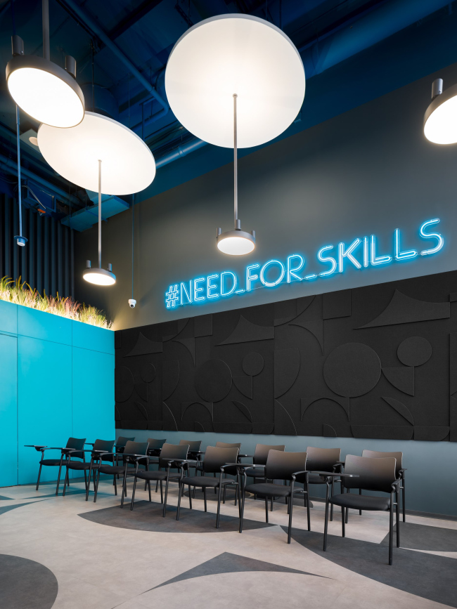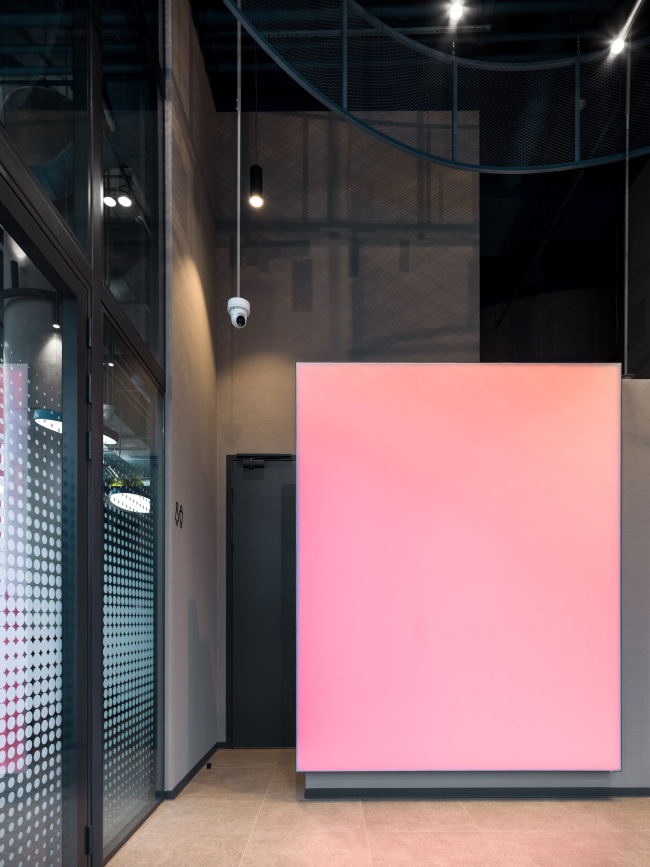Один из основных цветовых акцентов – яркие фетровые баффлы, играющие на контрасте со строгими рядами рабочих бенчей и придающие динамику интерьеру. Колористическое решение поддерживается дизайном телефонных будок и sky room, выполненных сходном цвете.