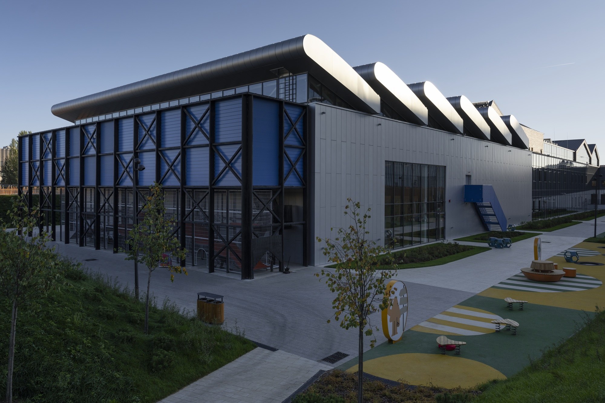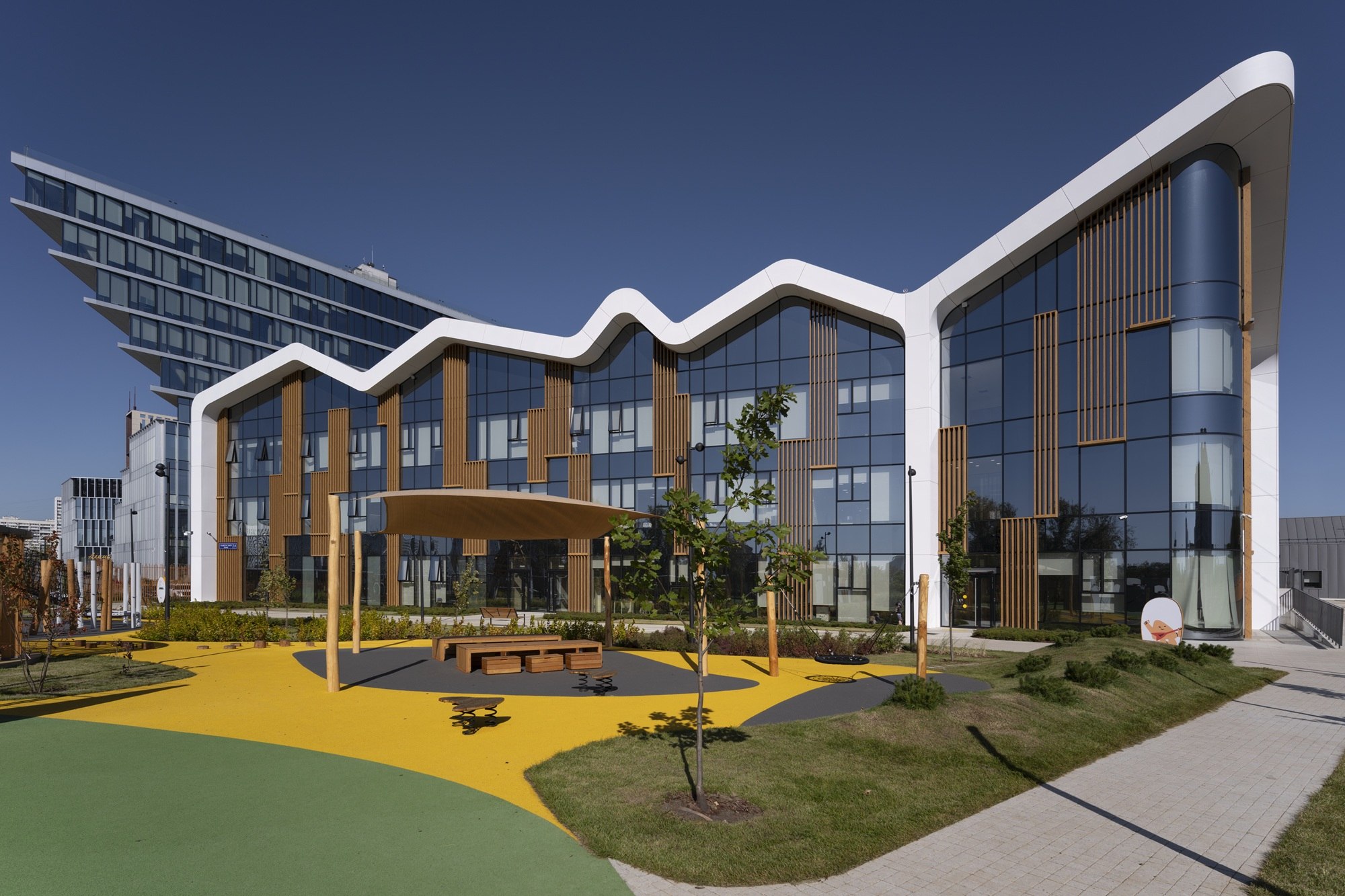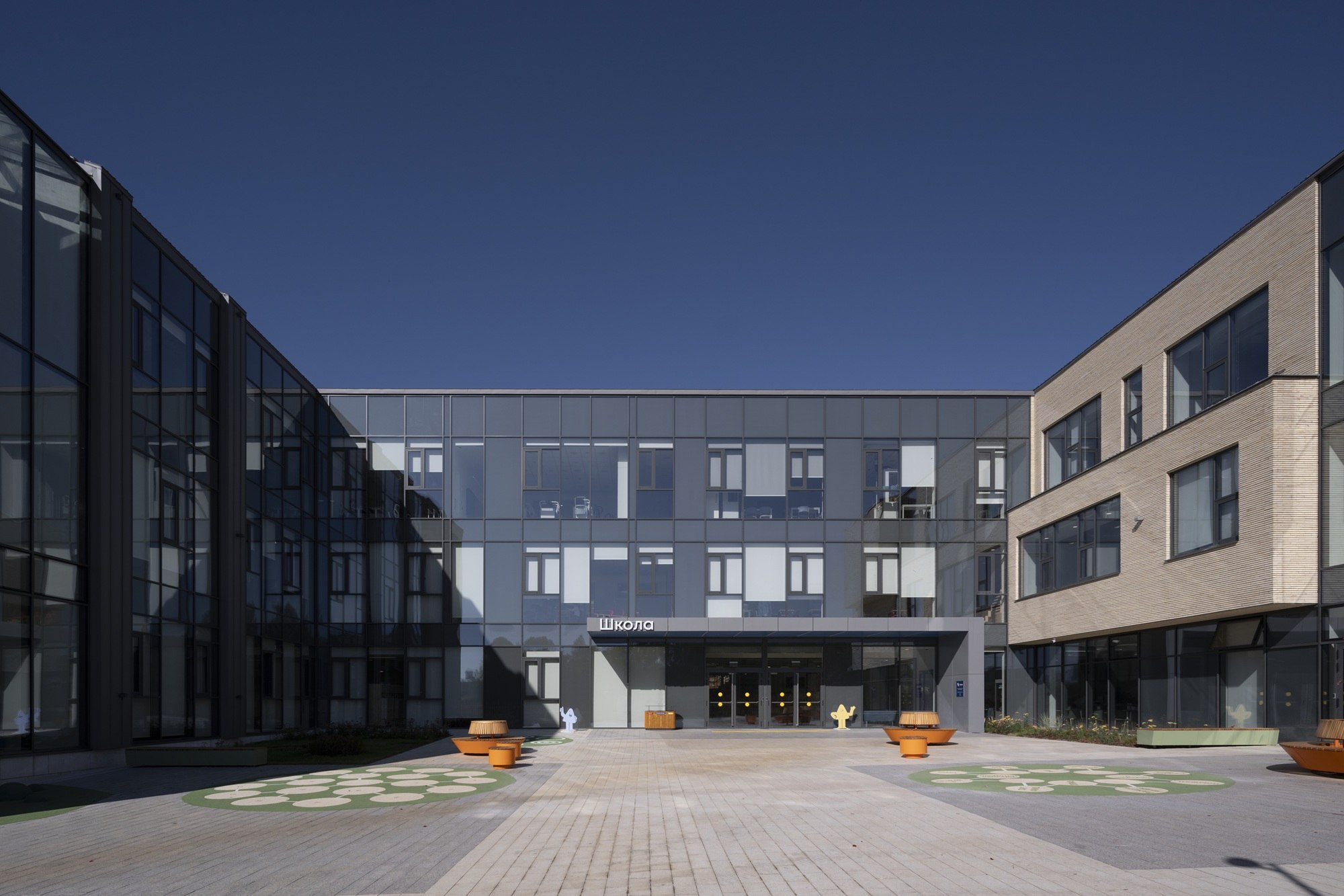 Школа решается не как цельное здание, а как детский городок. Каждый блок представляет собой отдельный «квартал» с общественными пространствами между ними, объединенные между собой нарочито нейтральной горизонтальной связью. Первый квартал – это уютный городок для детей младшего возраста, второй квартал для начальных классов принял облик оранжереи, третий – технологический хаб в виде конструктора из блоков для учеников средней школы, спортзал же отсылает нас в промышленной архитектуре, это своеобразная «фабрика спорта».