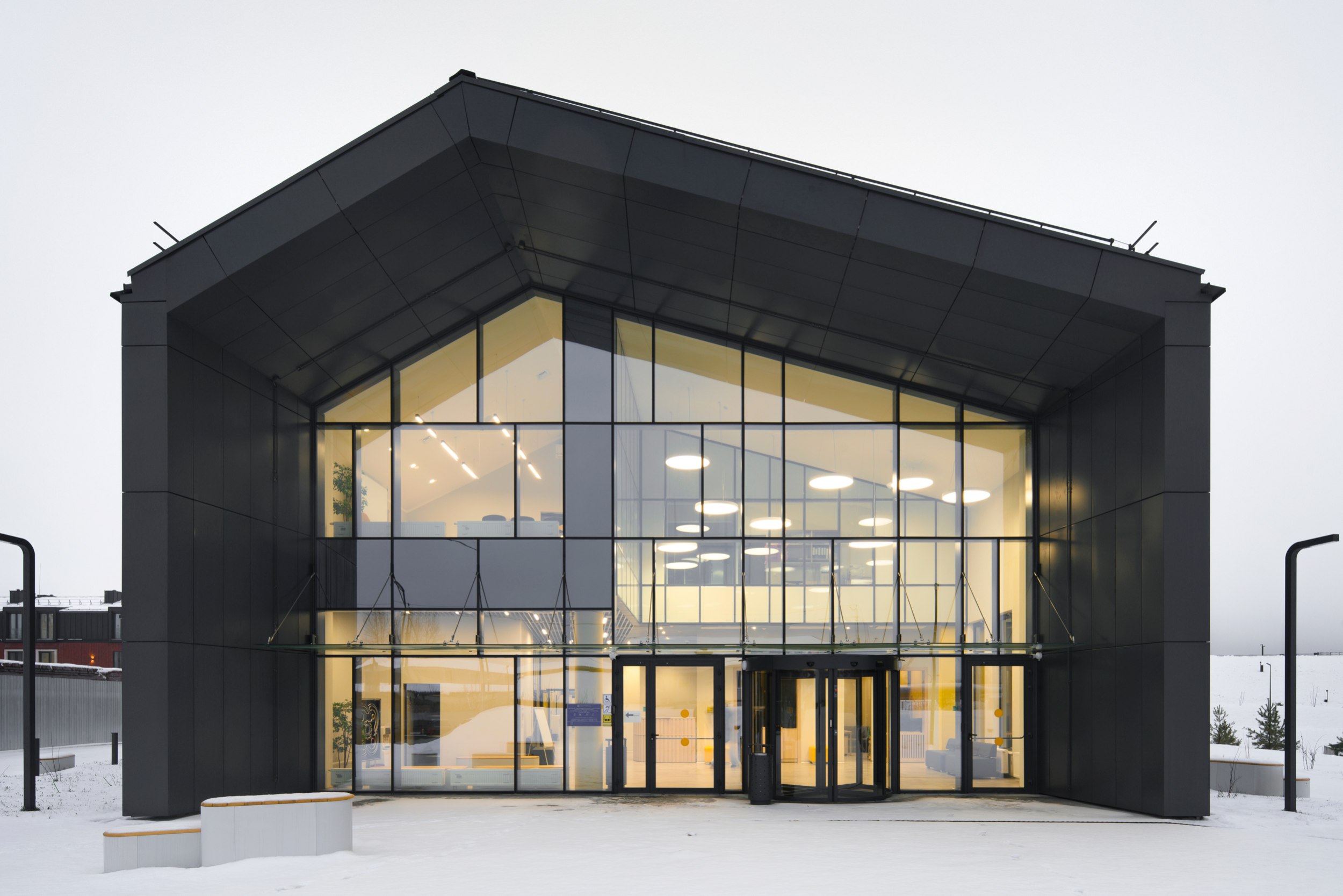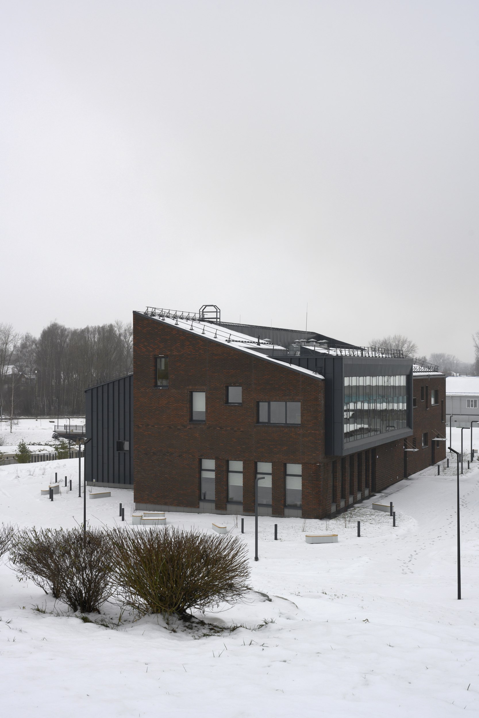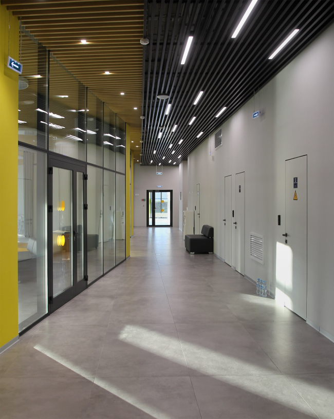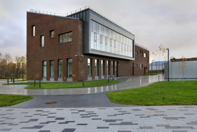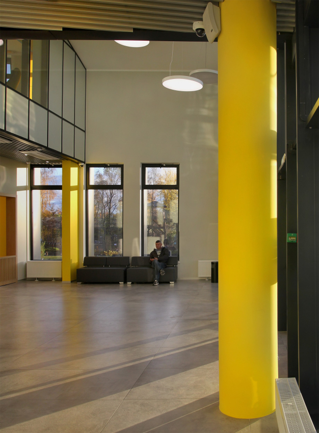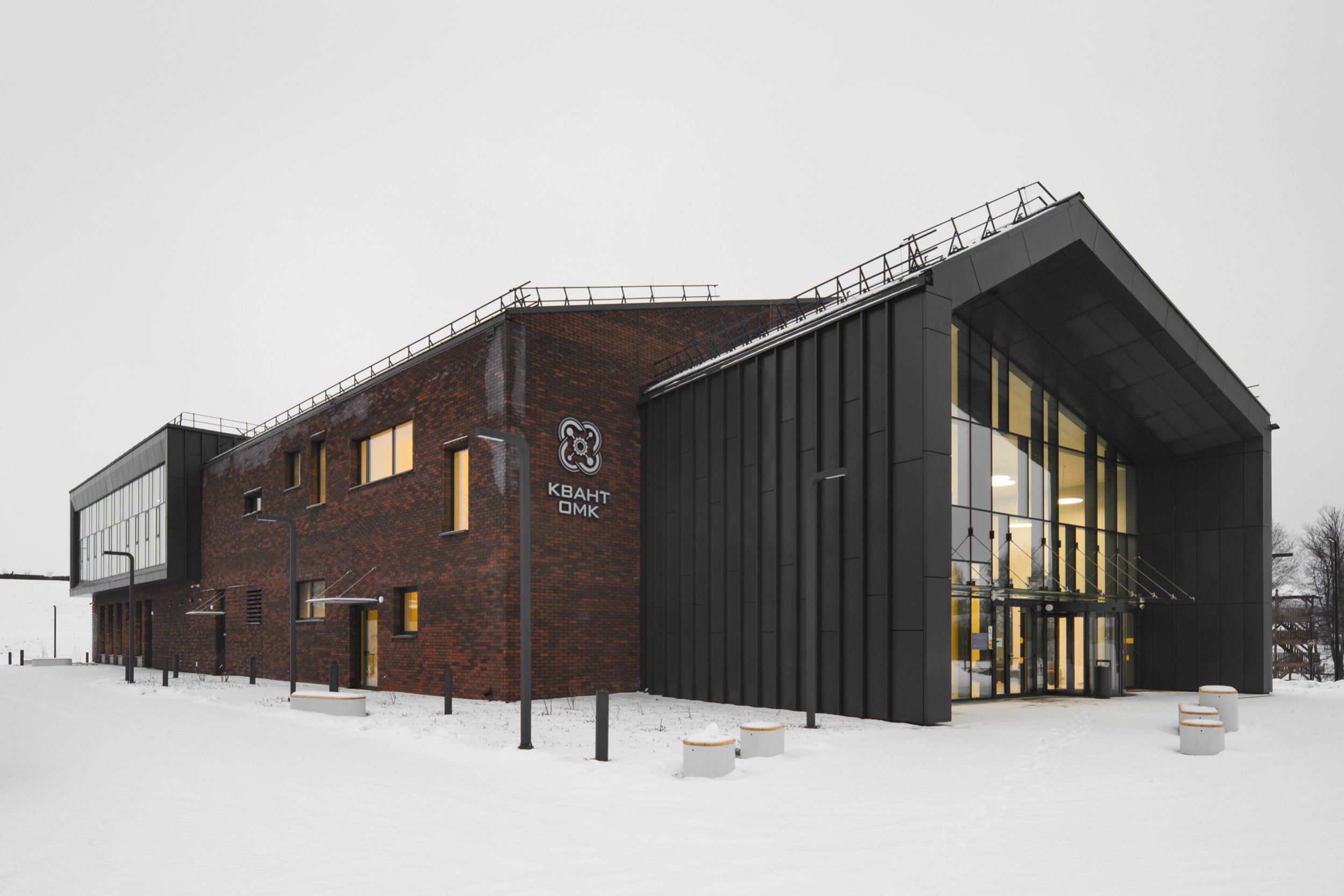 Компактное кирпично-металлическое здание на территории растущего в Выксе «Шухов-парка», кажется, впитывает в себя солнечный свет, преобразует в желтые акценты внутри и вечером «отдает» теплотой золотистого света из окон. Серьезно, очень симпатичное получилось здание: и материальное, и легкое, причем легкость внутри, материальность снаружи. Форма в нем выстроена от функции – лаконично, но не просто. Изучаем.