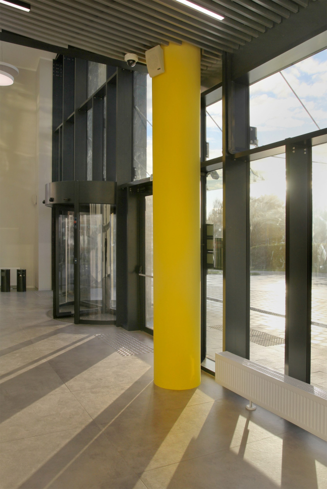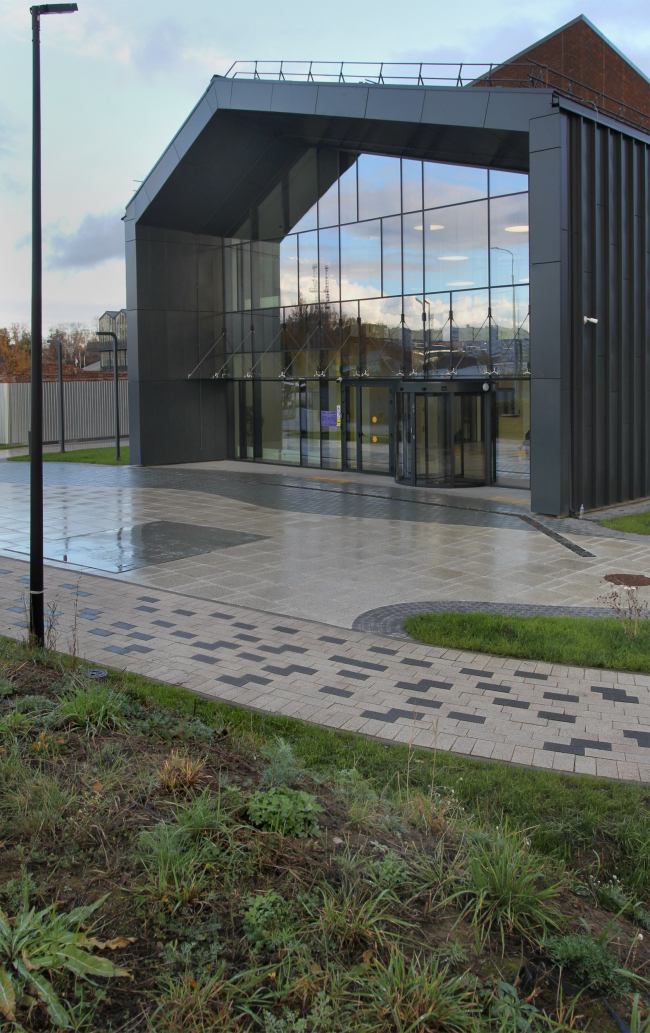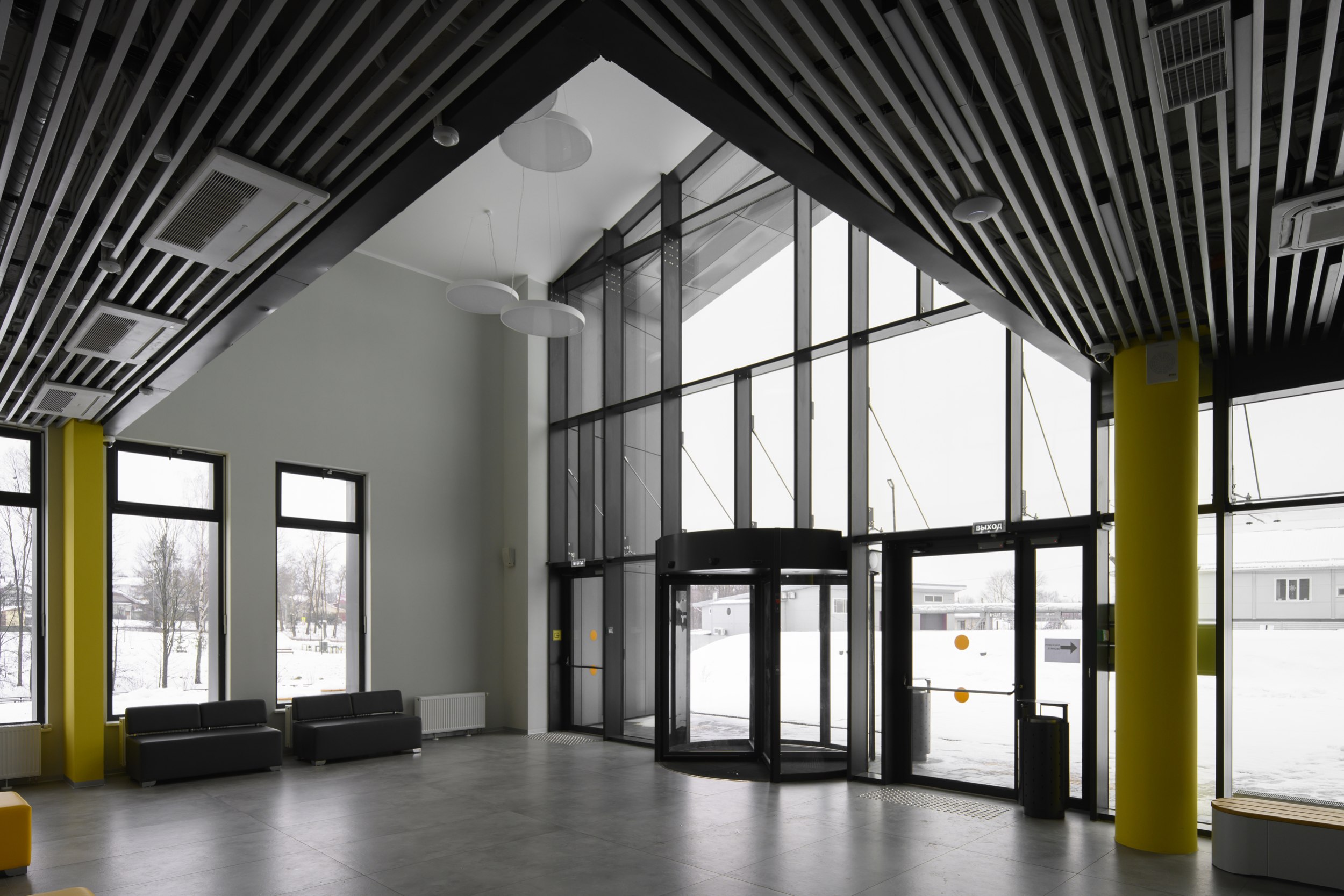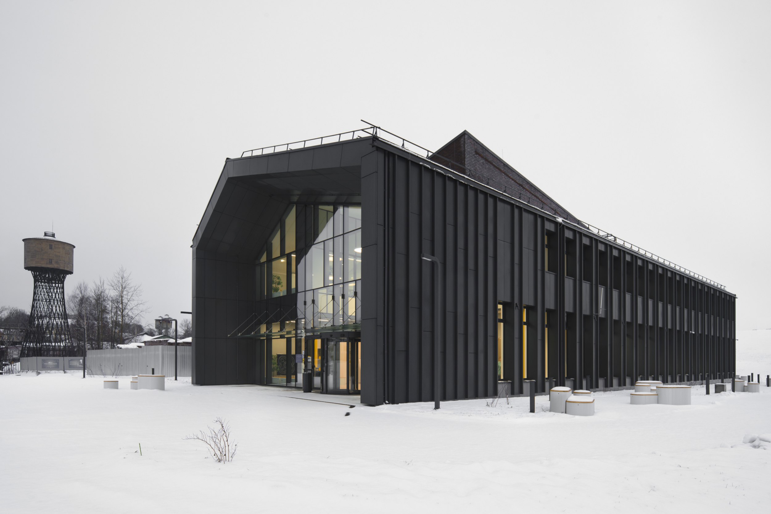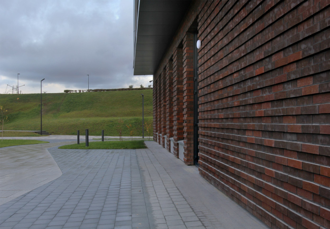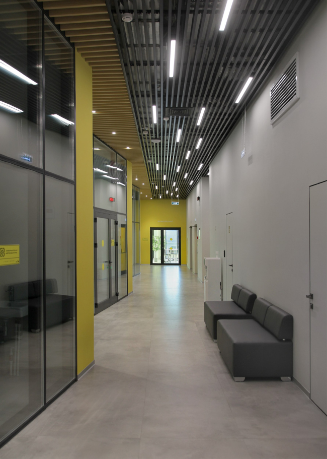Компактное кирпично-металлическое здание на территории растущего в Выксе «Шухов-парка», кажется, впитывает в себя солнечный свет, преобразует в желтые акценты внутри и вечером «отдает» теплотой золотистого света из окон. Серьезно, очень симпатичное получилось здание: и материальное, и легкое, причем легкость внутри, материальность снаружи. Форма в нем выстроена от функции – лаконично, но не просто. Изучаем.