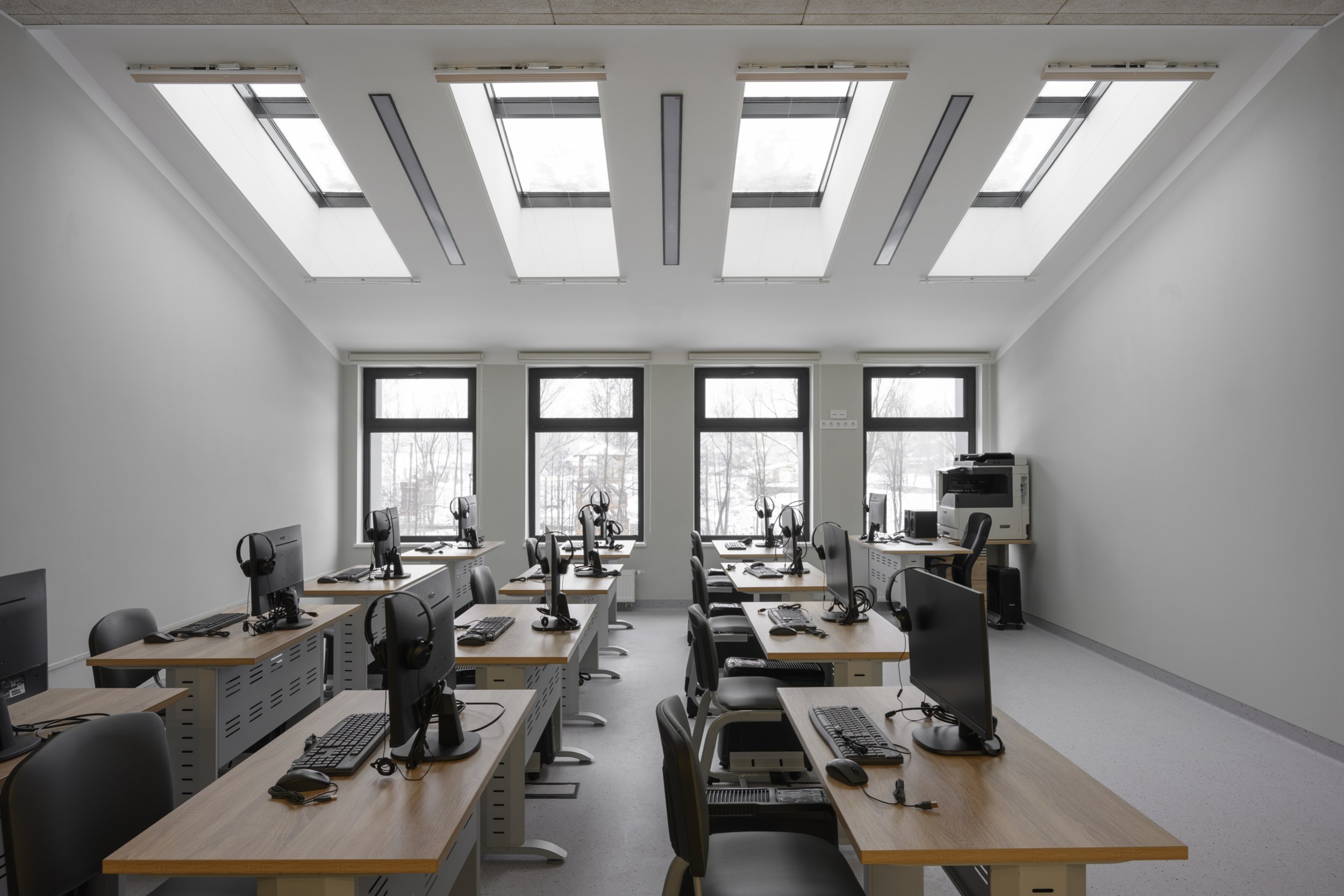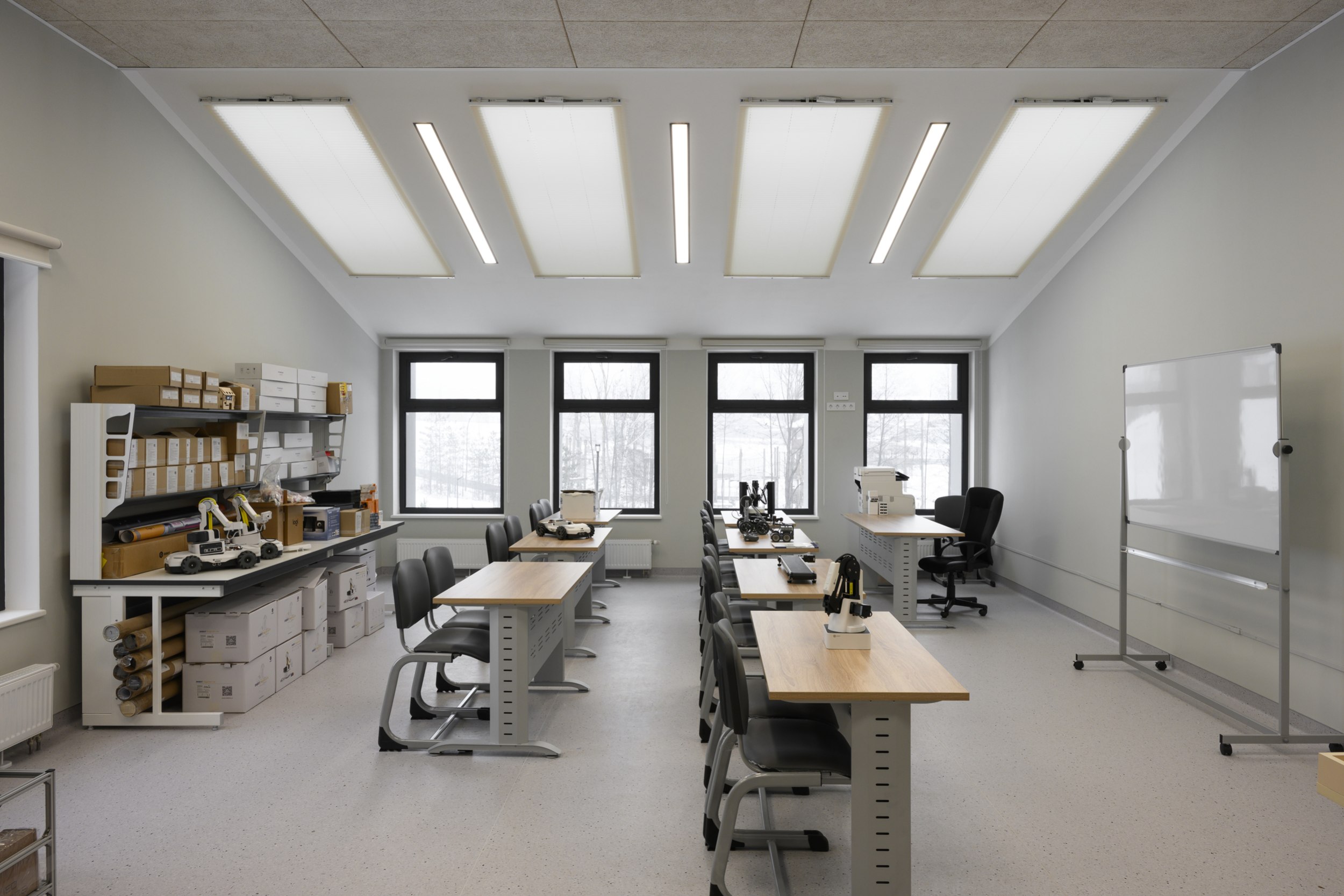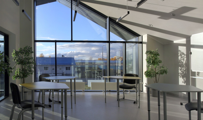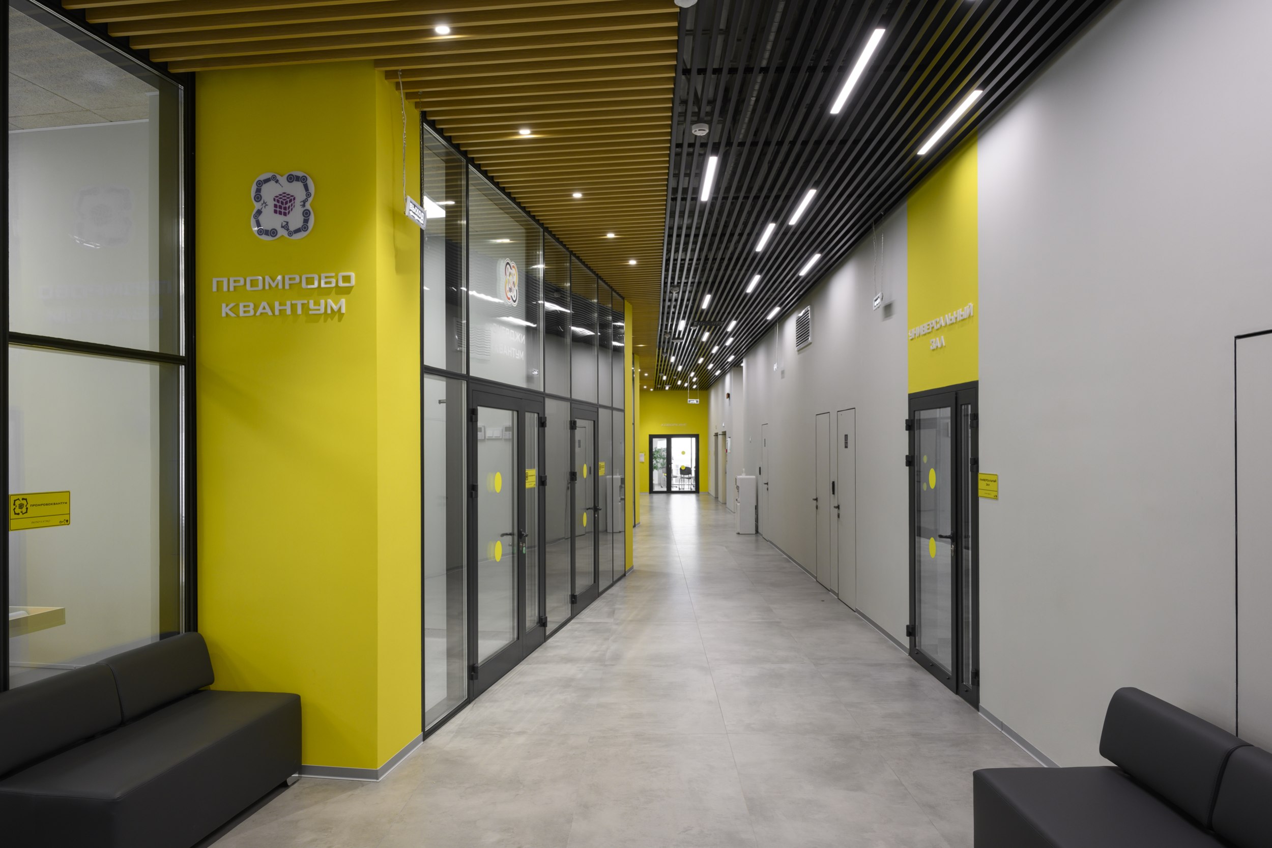 Здание кванториума состоит из двух непараллельных и разновысоких объемов.