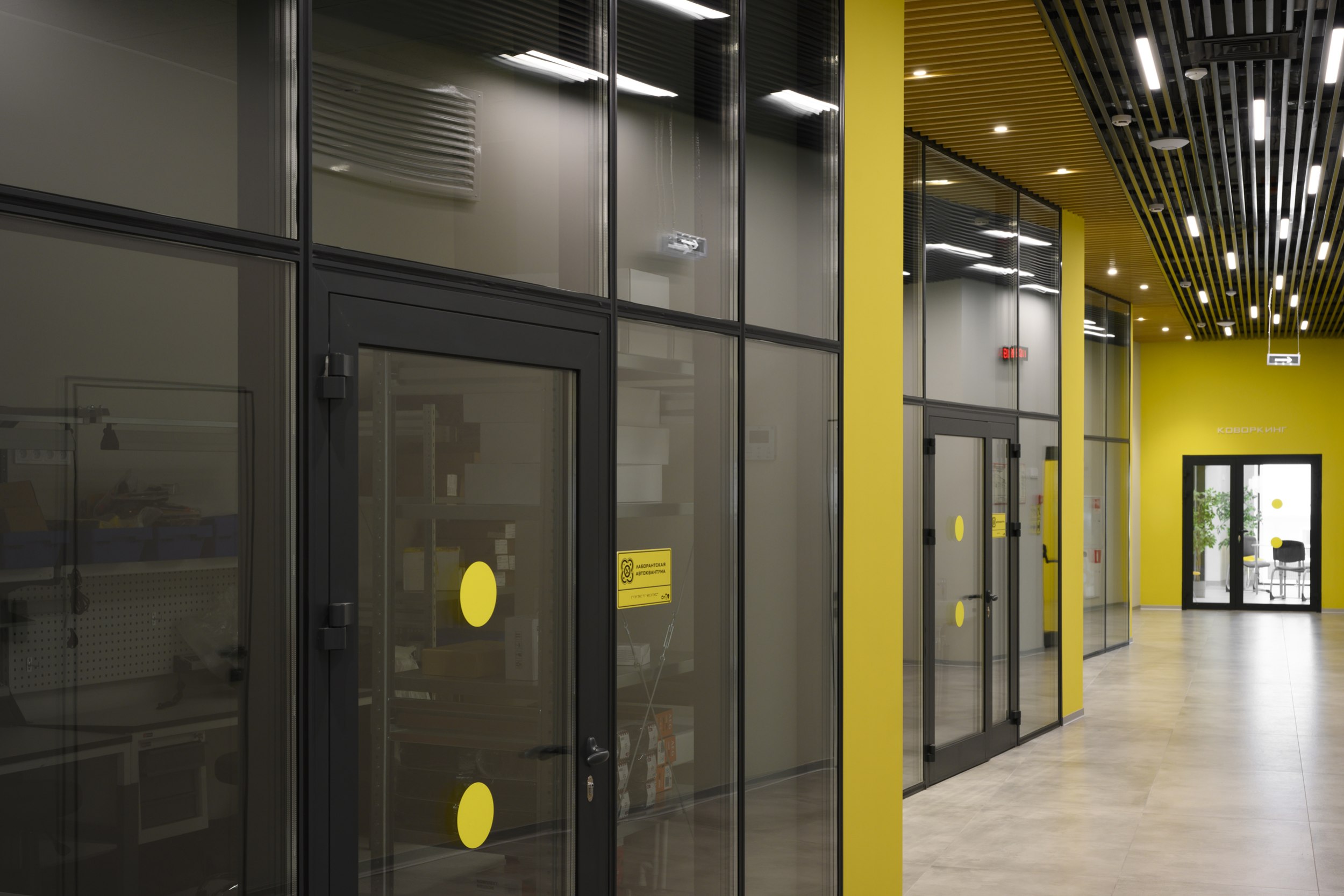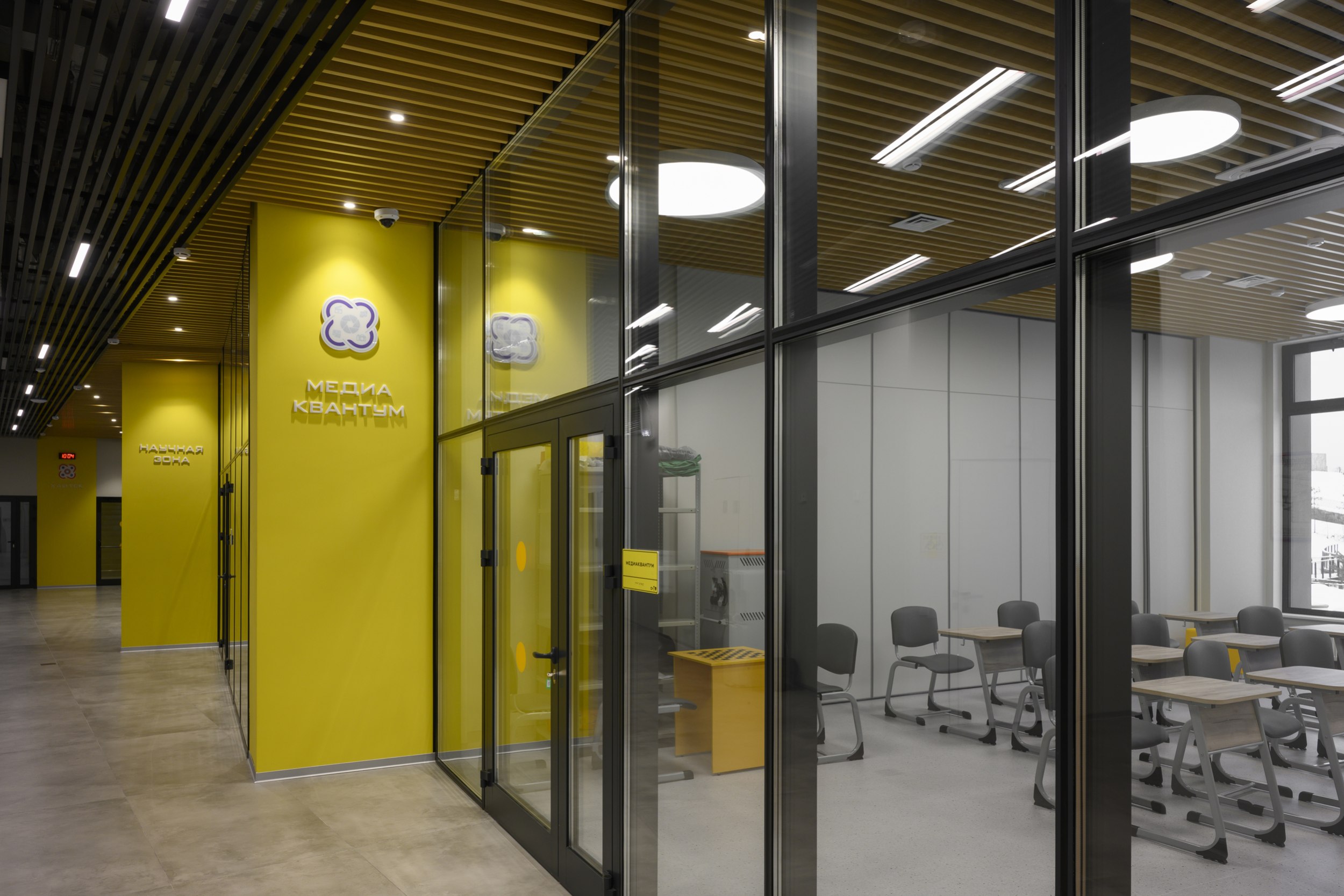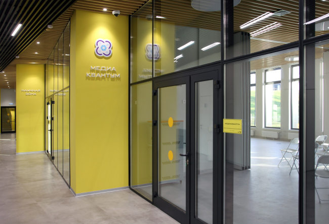 Входная группа состоит из развитого комплекса двусветного вестибюля, включающего в себя гардероб, рецепцию, пункт охраны, кофе-пойнт и гостевой санузел. Это общедоступная зона, здесь родители могут подождать, пока дети занимаются в квантумах. Остальные помещения кванториума свободно доступны для учащихся, преподавателей, персонала, а также для посетителей научно-познавательной зоны на 1 этаже.