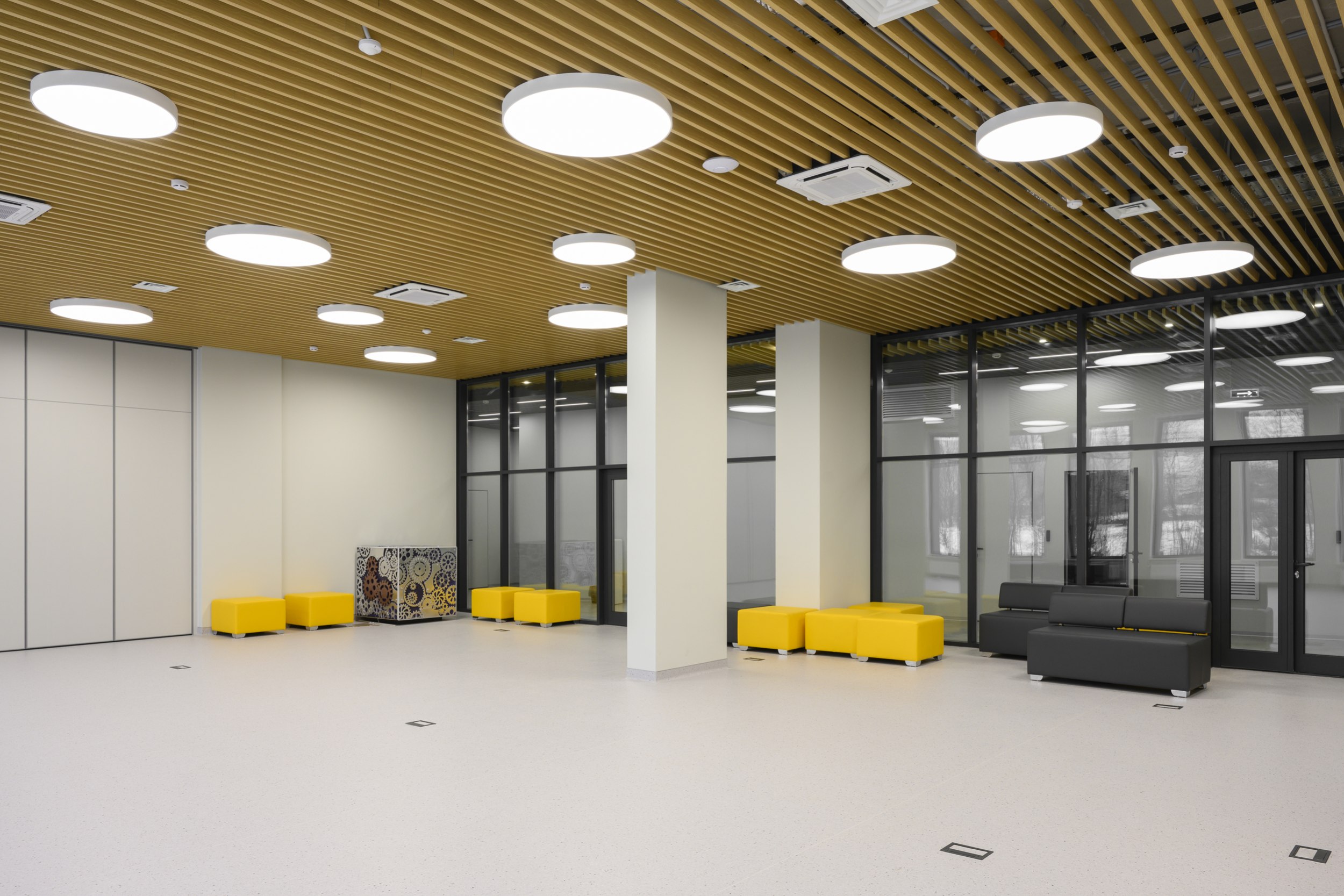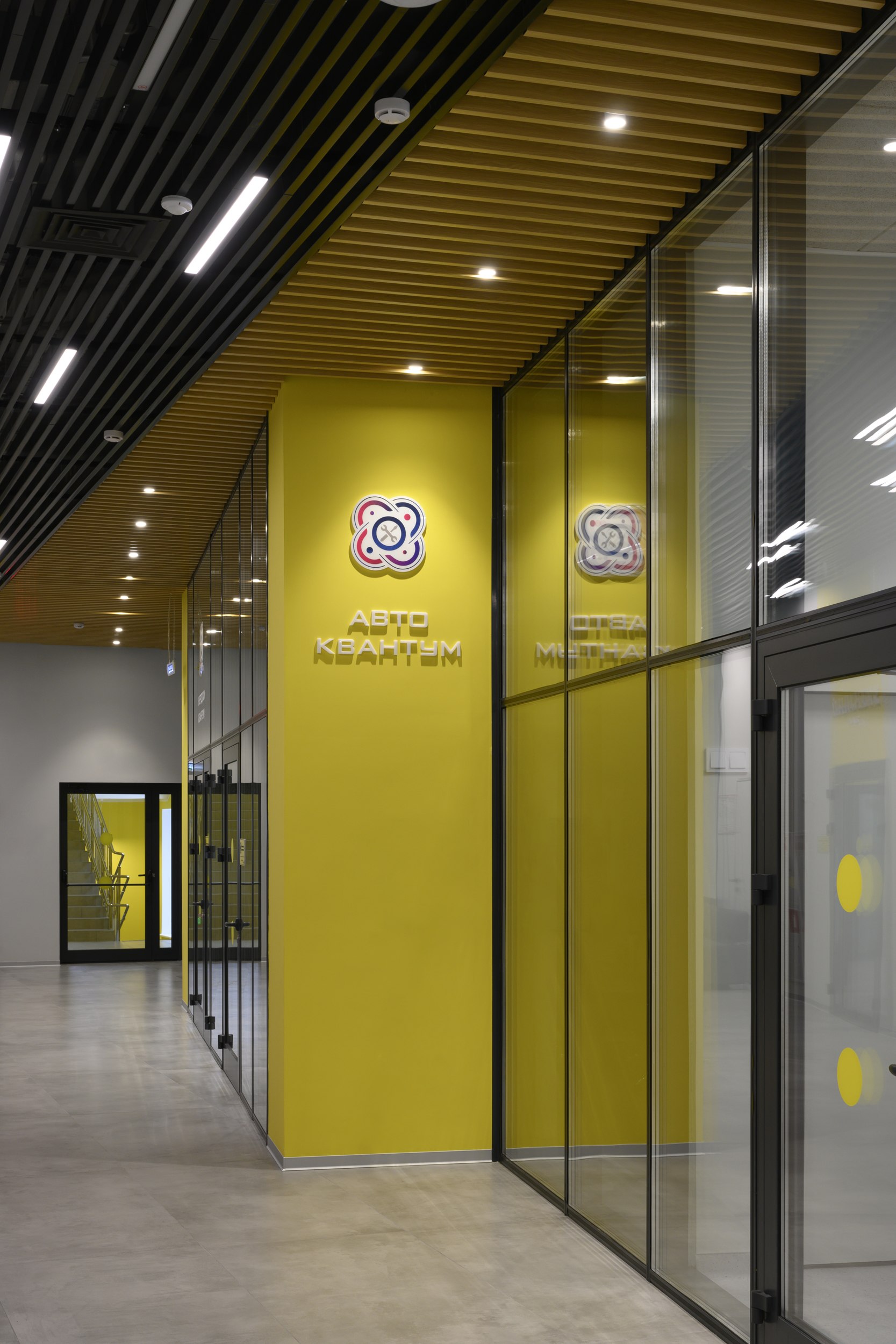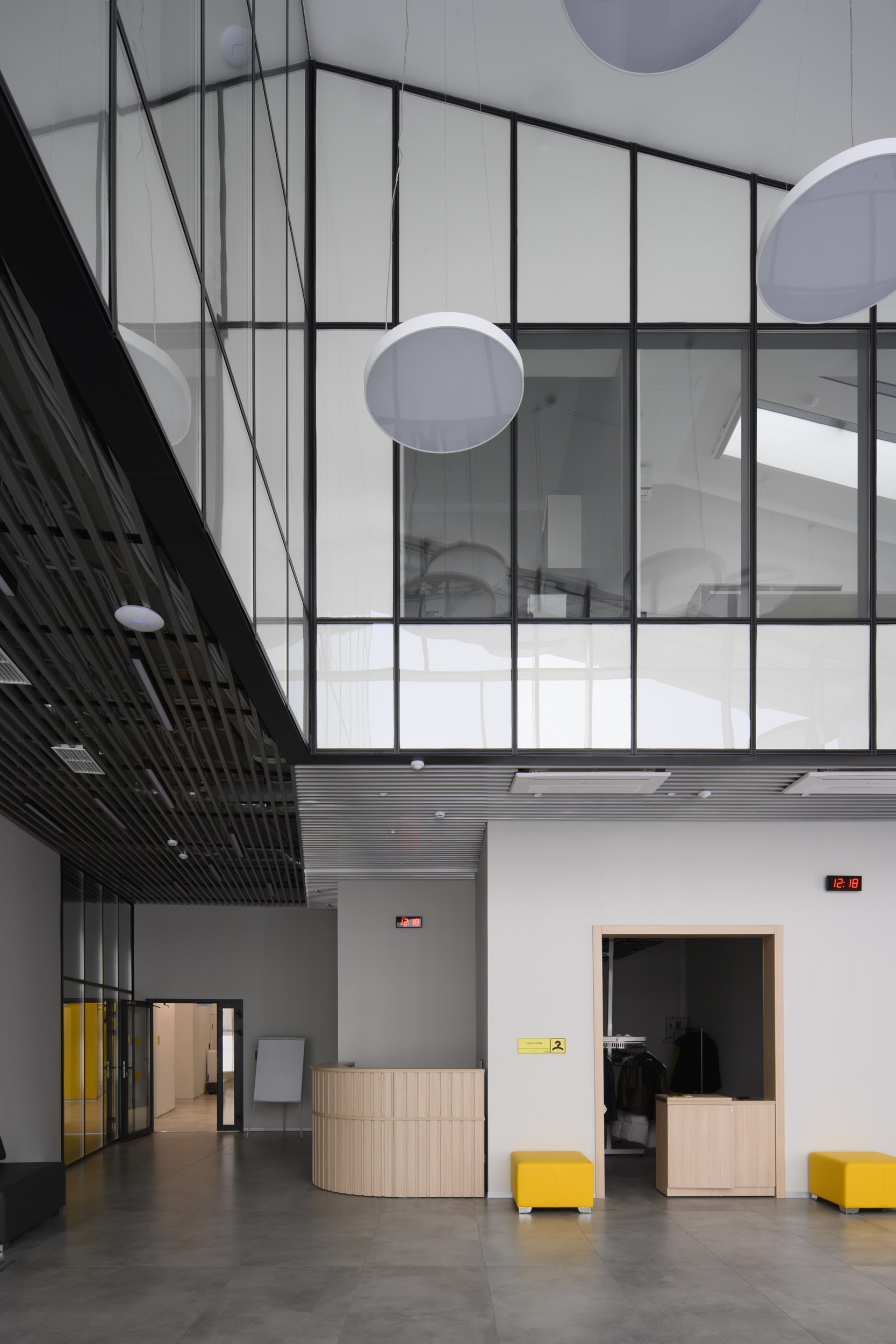 Входная группа состоит из развитого комплекса двусветного вестибюля, включающего в себя гардероб, рецепцию, пункт охраны, кофе-пойнт и гостевой санузел. Это общедоступная зона, здесь родители могут подождать, пока дети занимаются в квантумах. Остальные помещения кванториума свободно доступны для учащихся, преподавателей, персонала, а также для посетителей научно-познавательной зоны на 1 этаже.