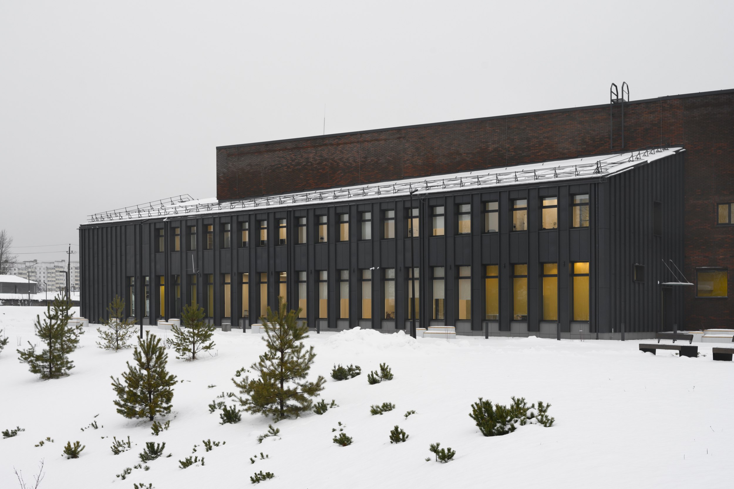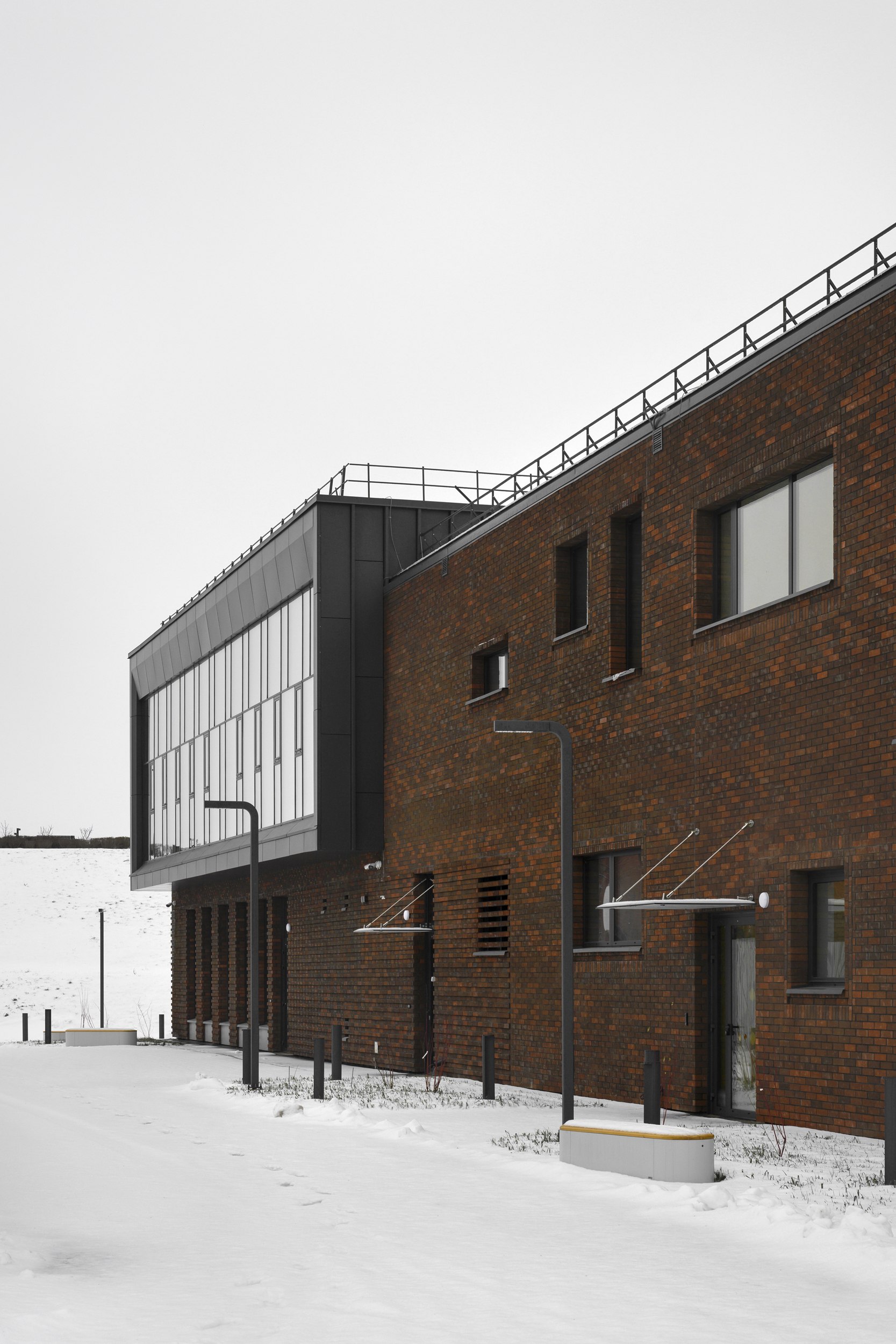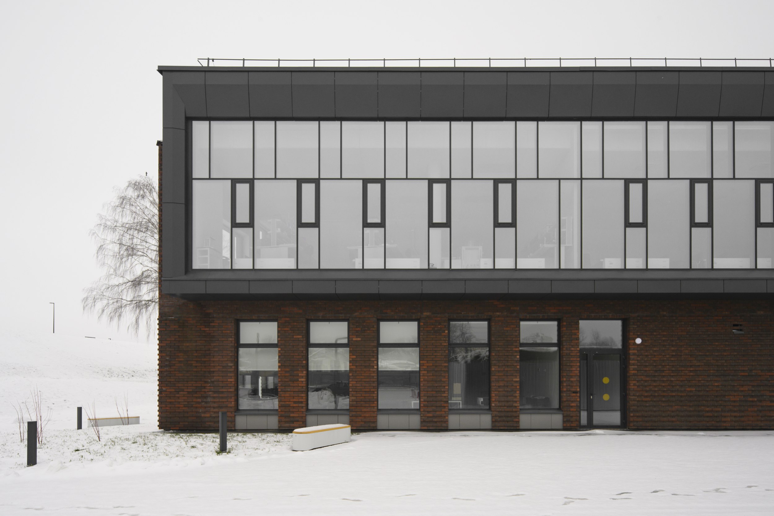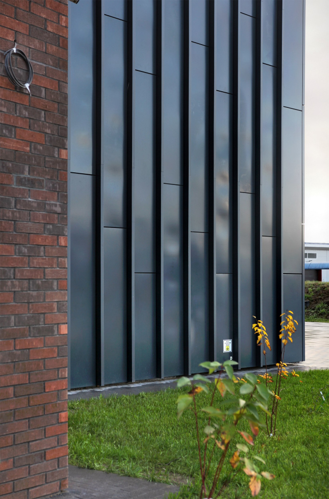 имеет строгий ряд вертикальных фасадных элементов, совпадающий с шагом оконных проемов. Используется клинкерный облицовочный кирпич на подсистеме, темные металлические или фиброцементные панели.