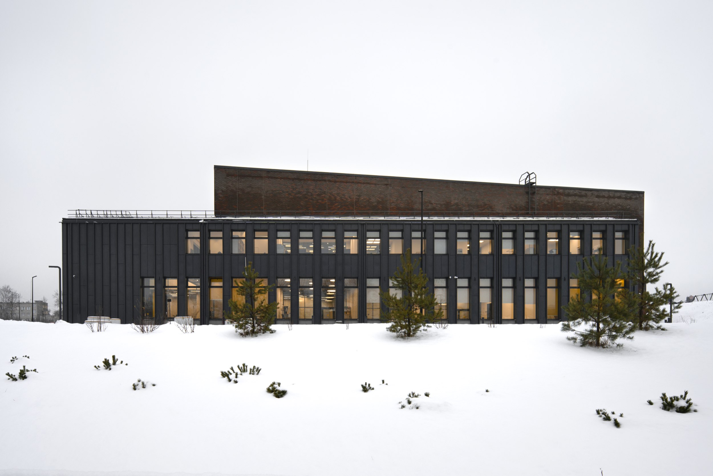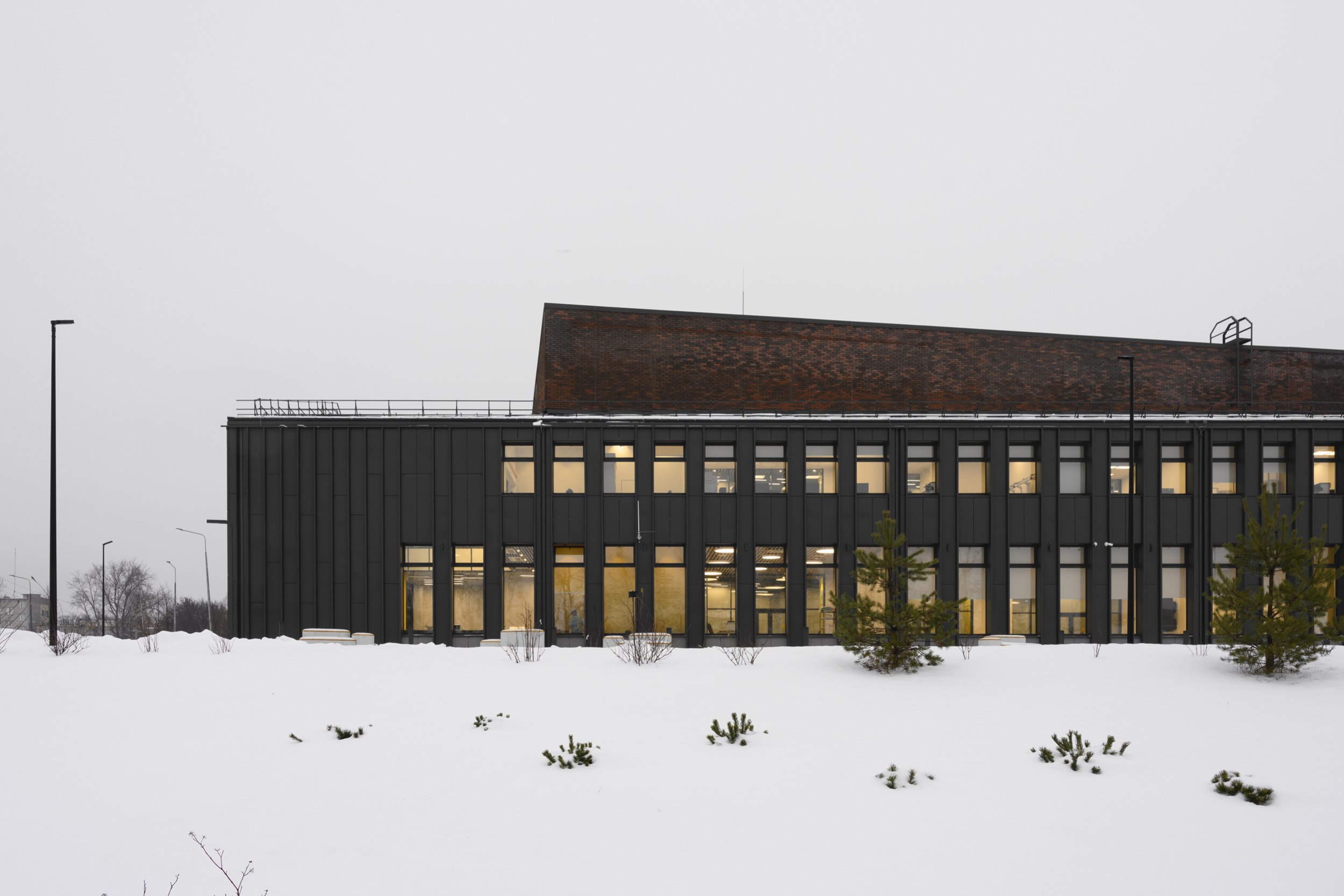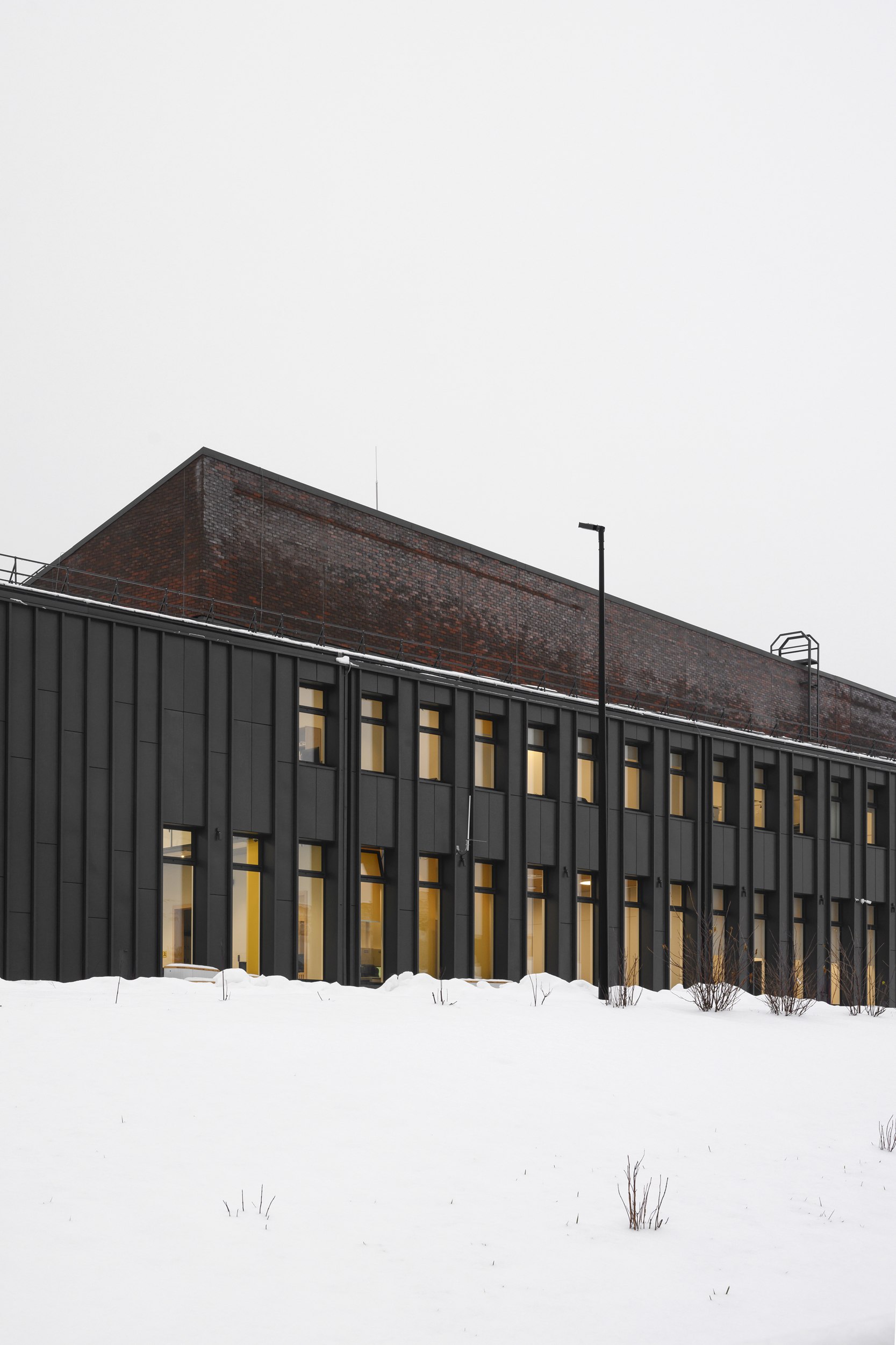 имеет строгий ряд вертикальных фасадных элементов, совпадающий с шагом оконных проемов. Используется клинкерный облицовочный кирпич на подсистеме, темные металлические или фиброцементные панели.