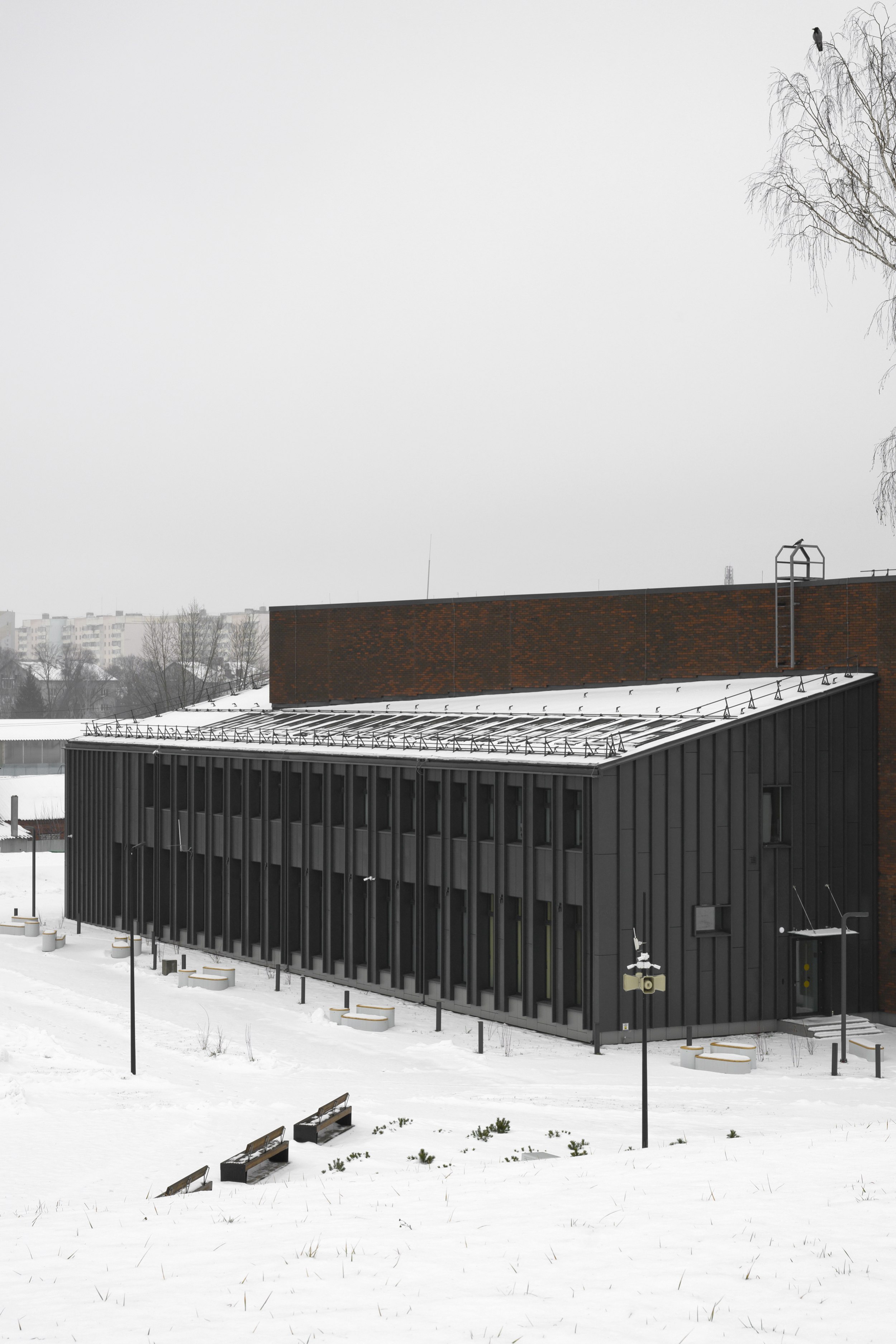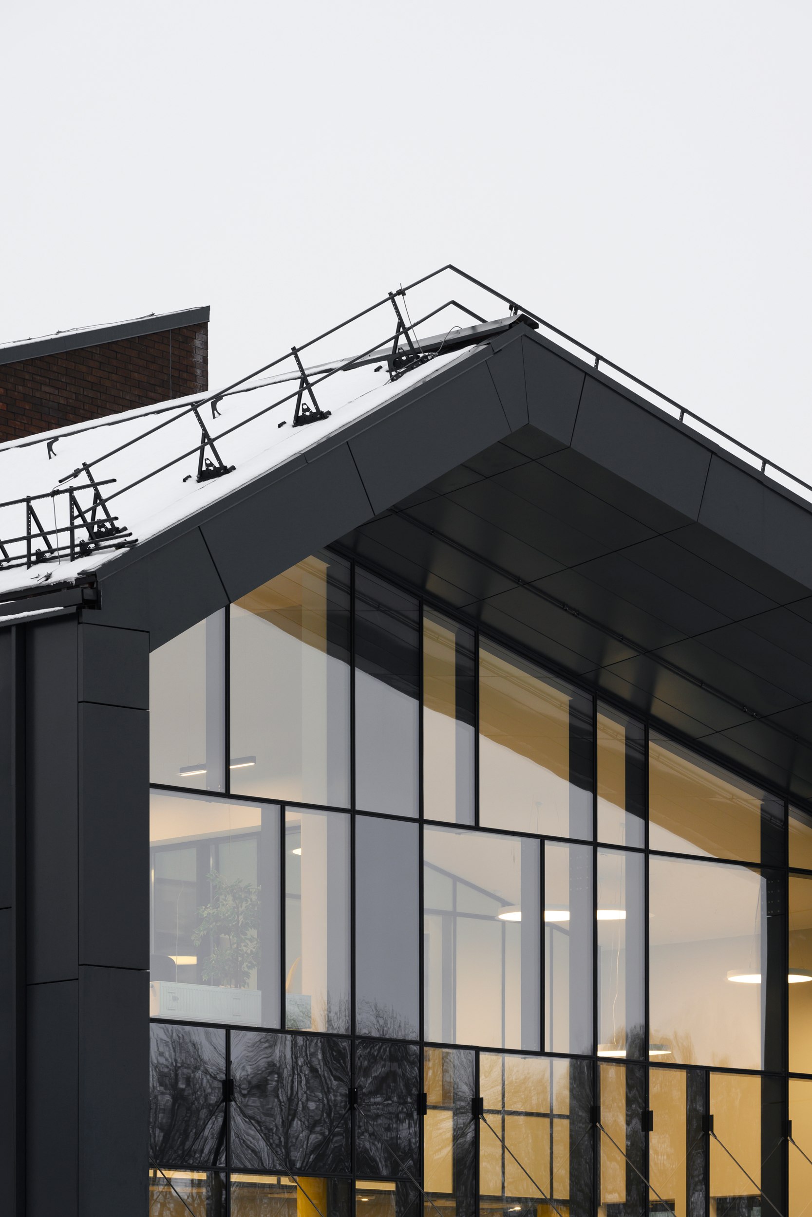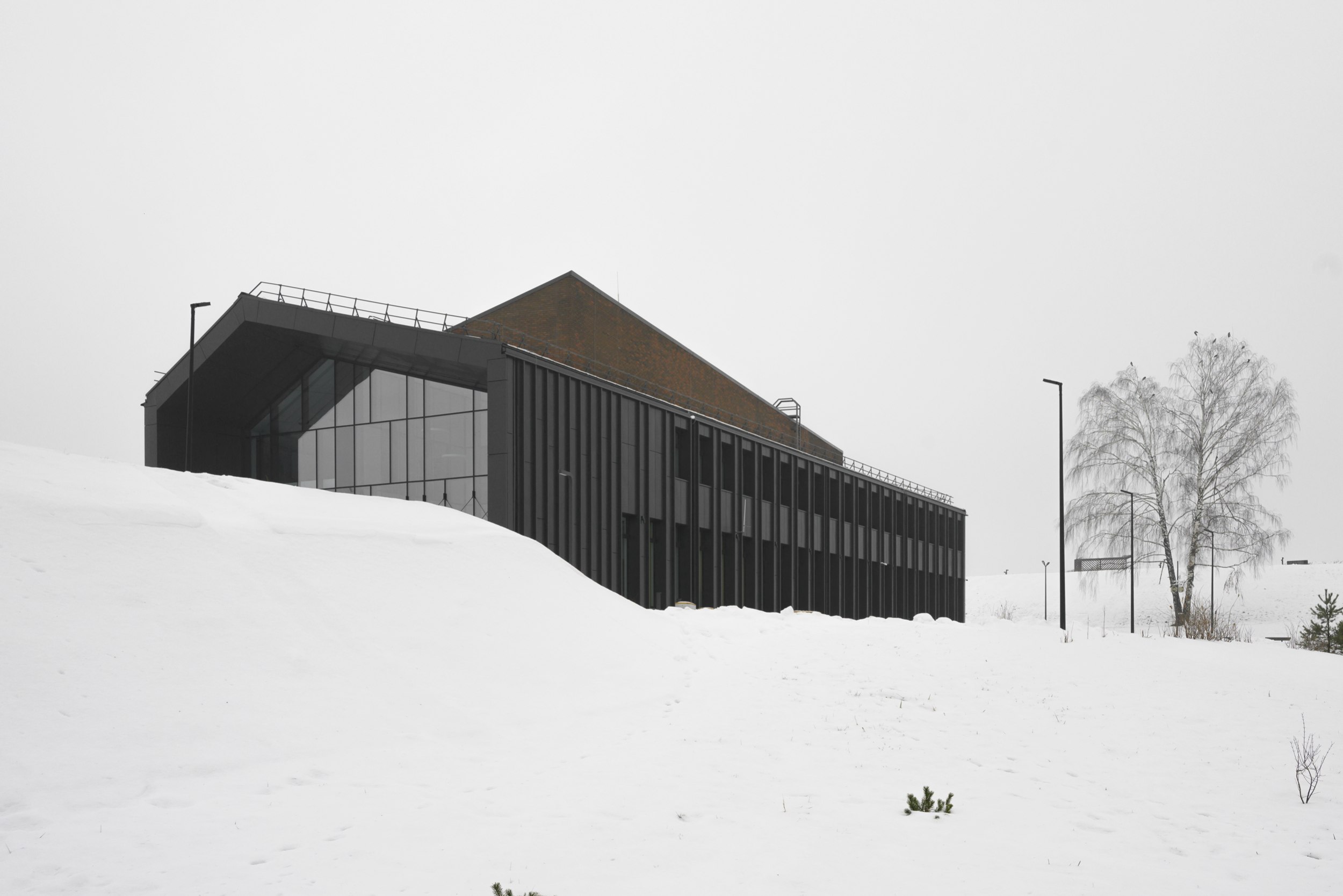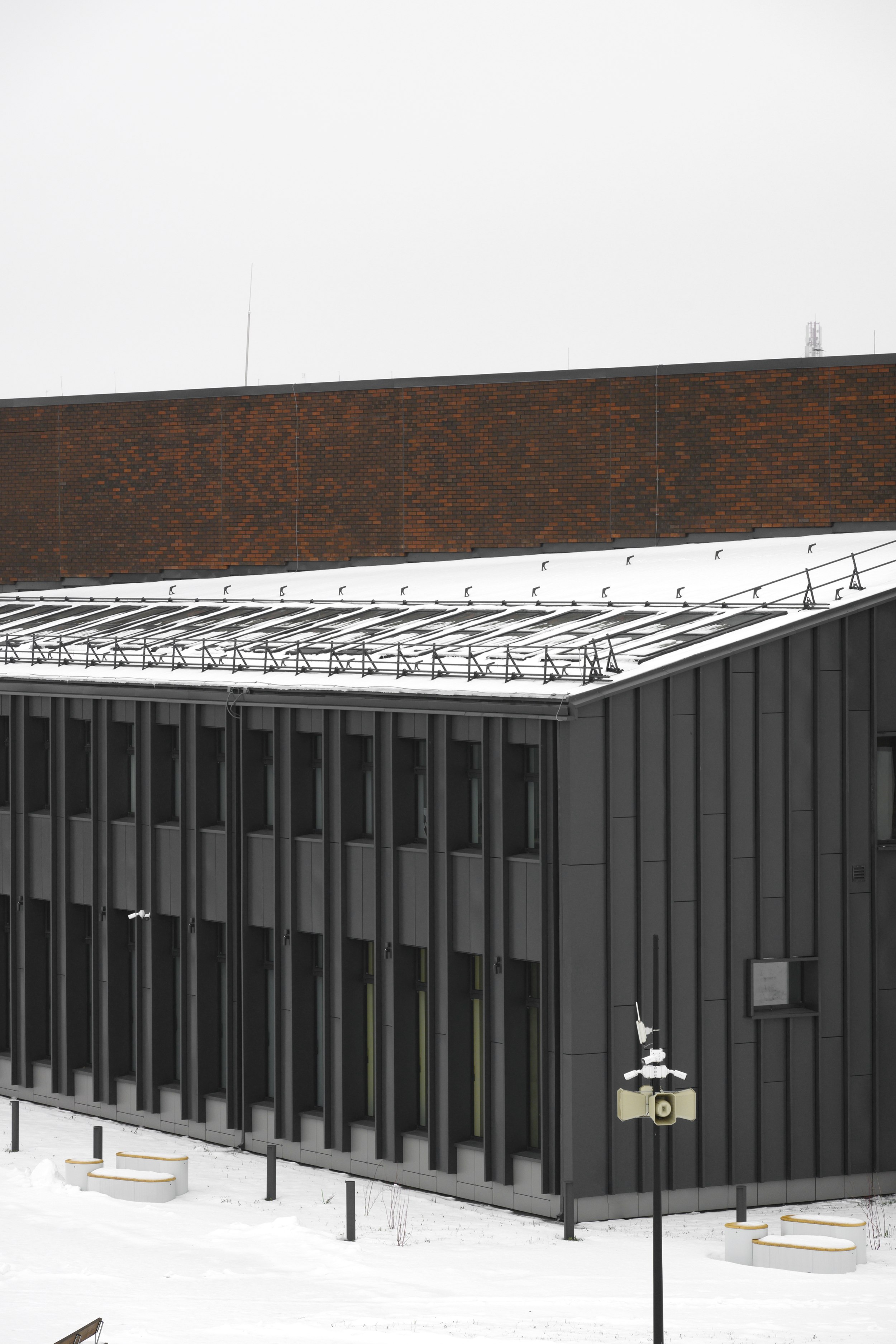 имеет строгий ряд вертикальных фасадных элементов, совпадающий с шагом оконных проемов. Используется клинкерный облицовочный кирпич на подсистеме, темные металлические или фиброцементные панели.