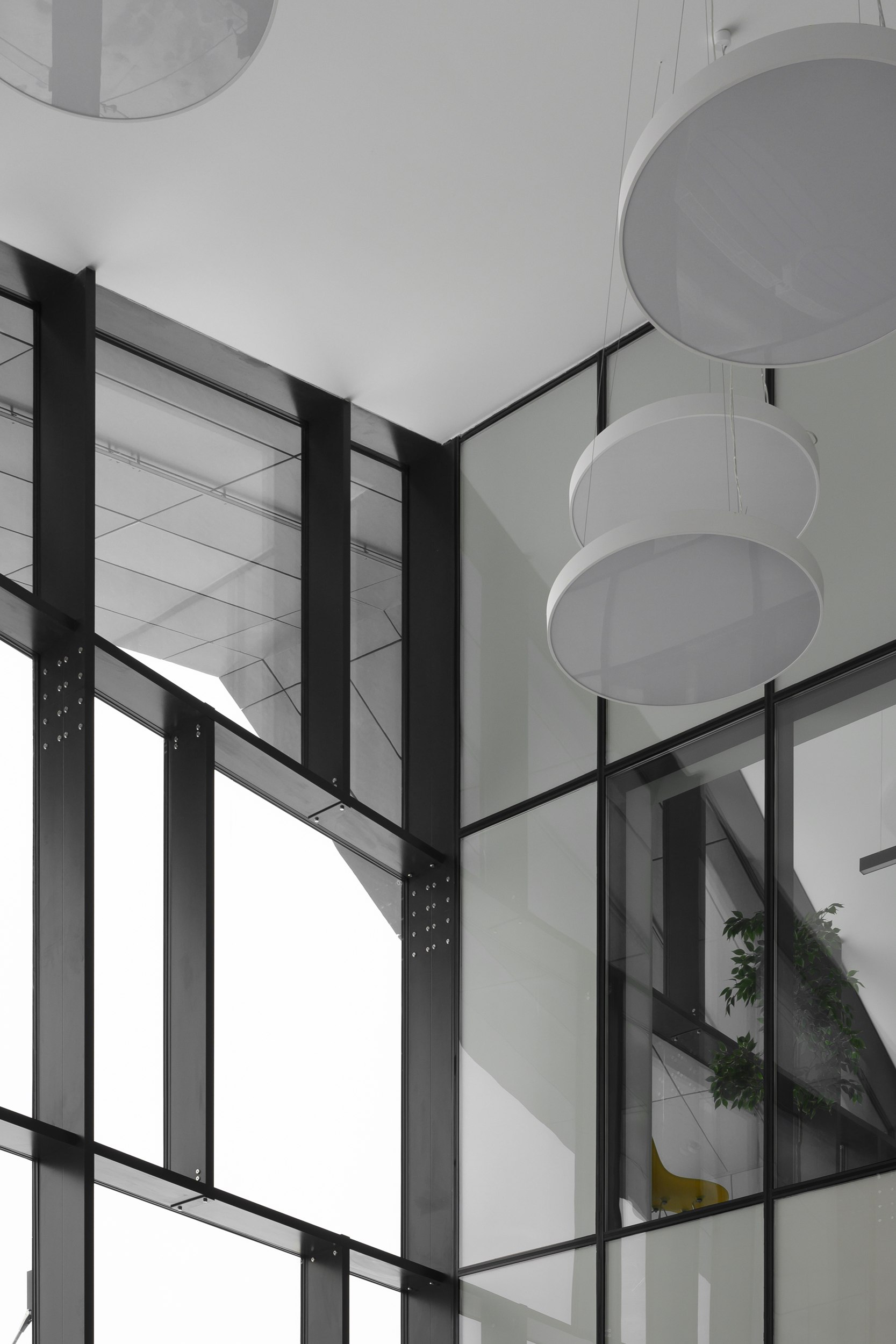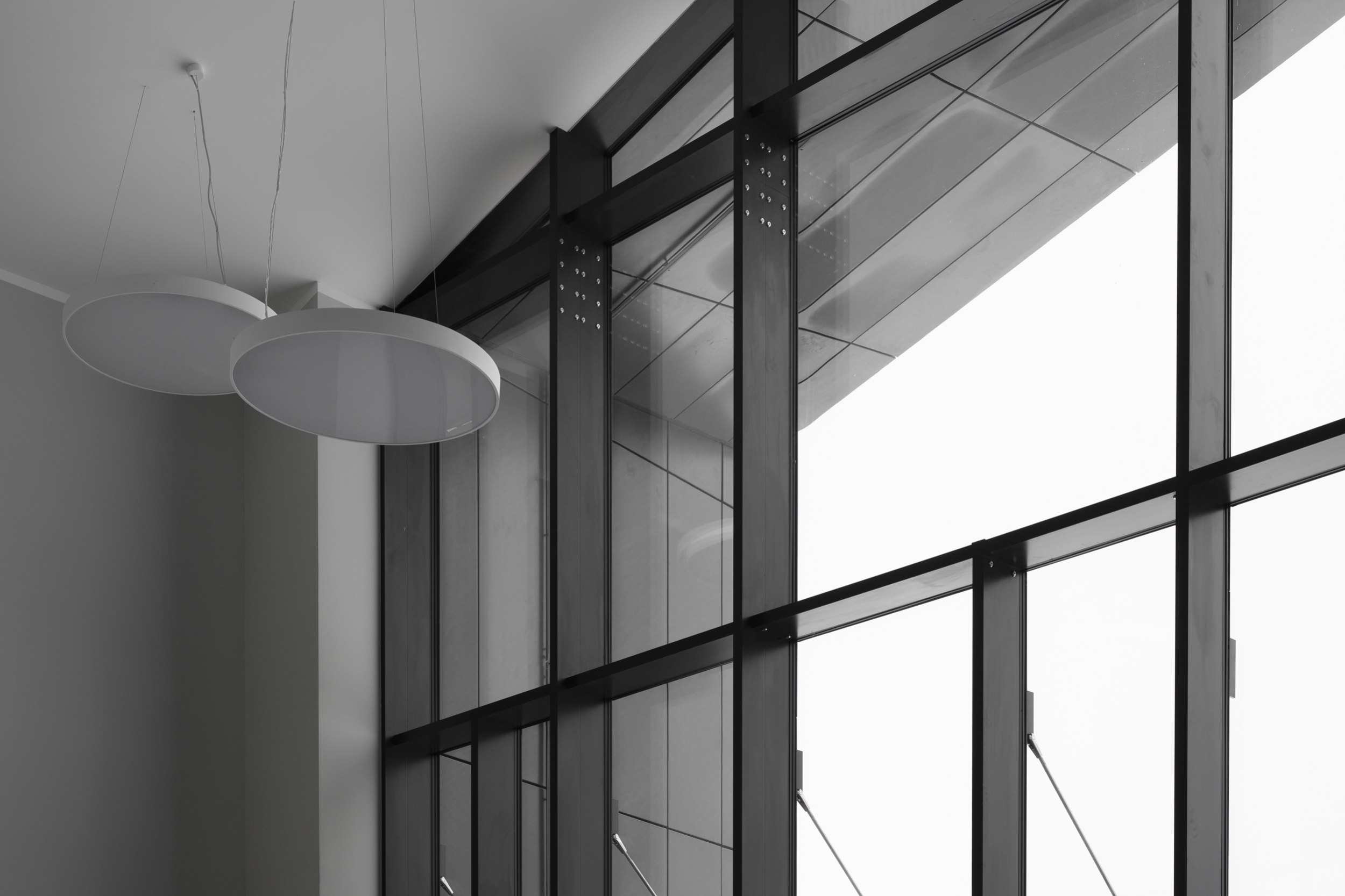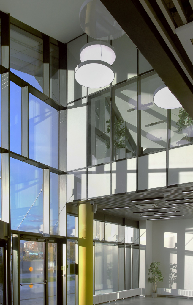 кирпичном объеме, подчеркнуто статичном, разновеликие окна образуют свободный паттерн в плоскости стены; более динамичный «металлический» объем, наоборот,