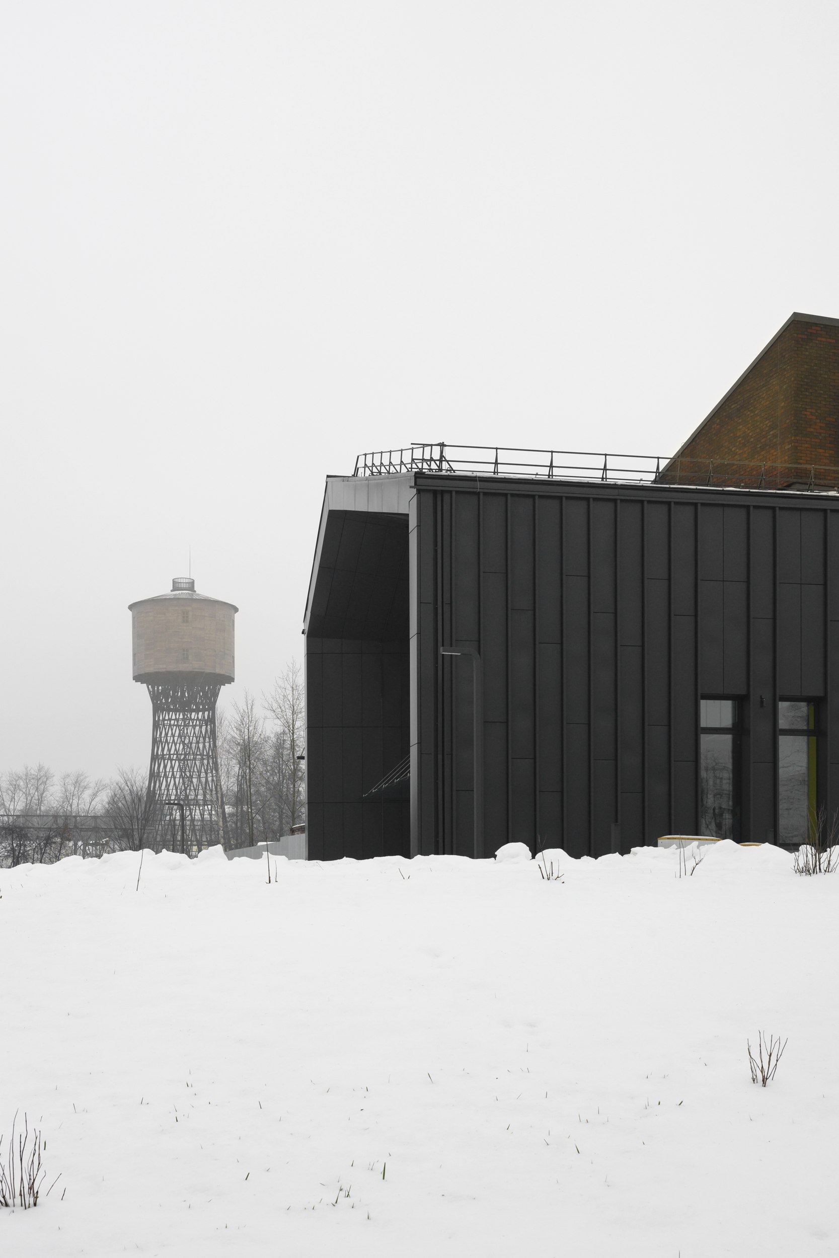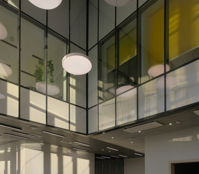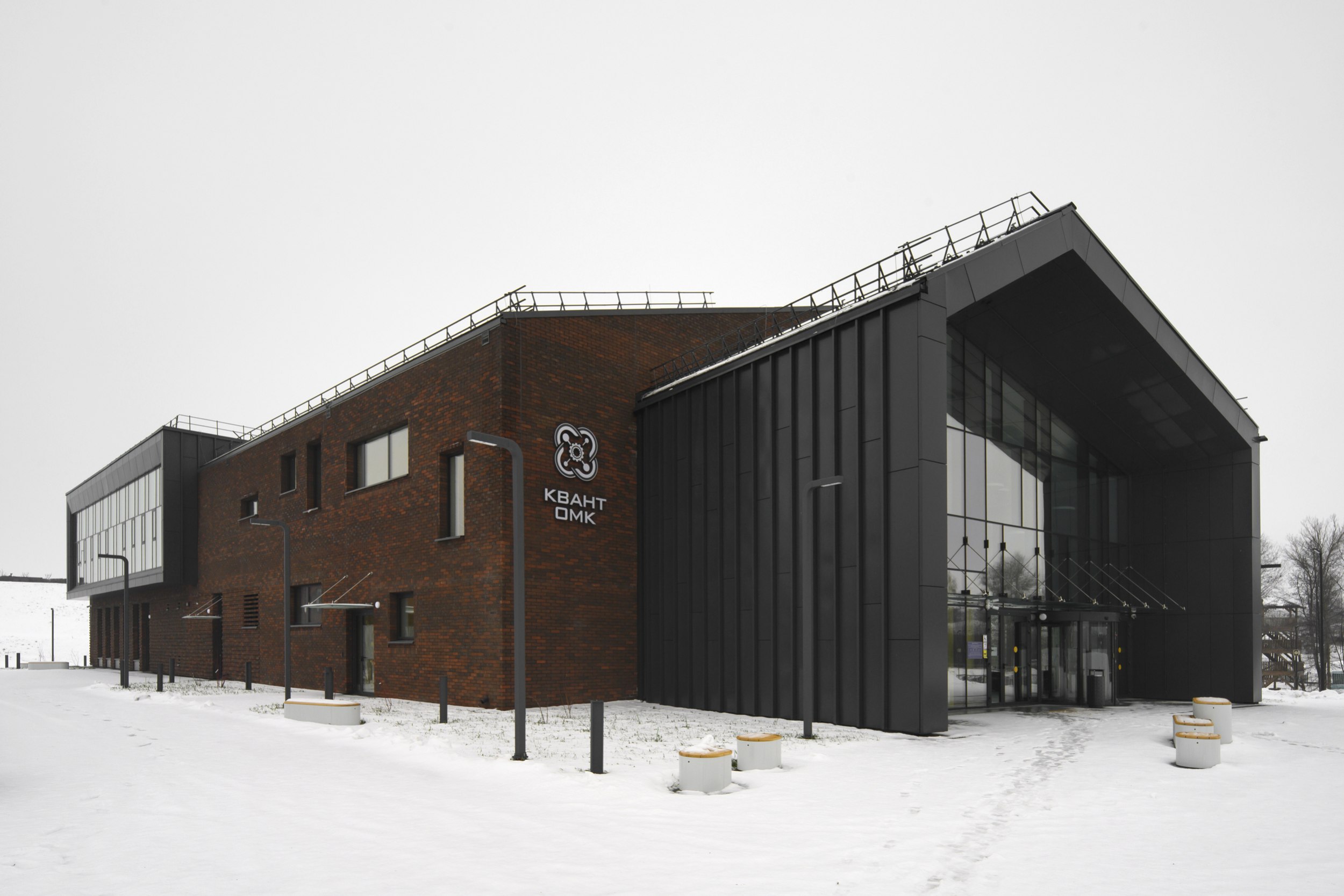 В градостроительном плане такое решение также оправдано – оба объема существуют в двух разных сетках координат, одна из которых совпадает с координатной сеткой руин Южных мастерских, а другая – с координатной сеткой Листопрокатного цеха. Помимо этого, динамическое противопоставление «врезанных» друг в друга объемов подчеркивает идею кванториума как образовательного проекта на стыке разных областей знания, науки и техники, теории и практики.