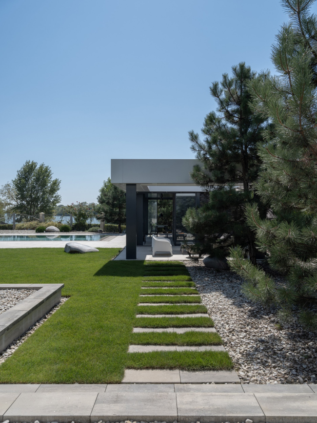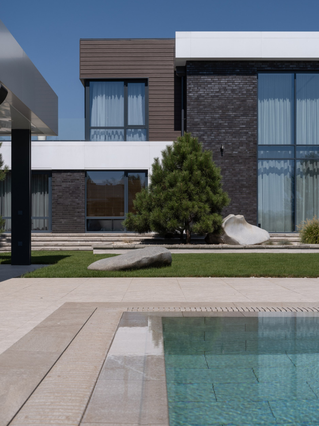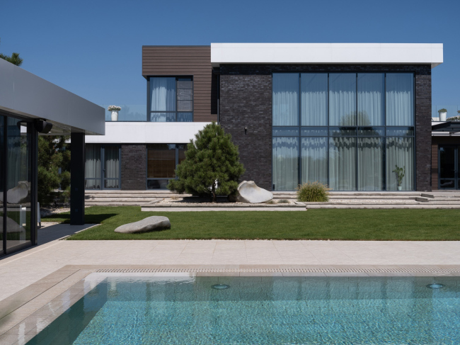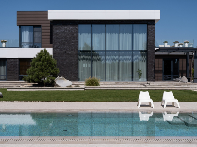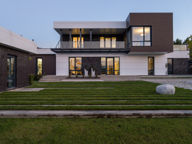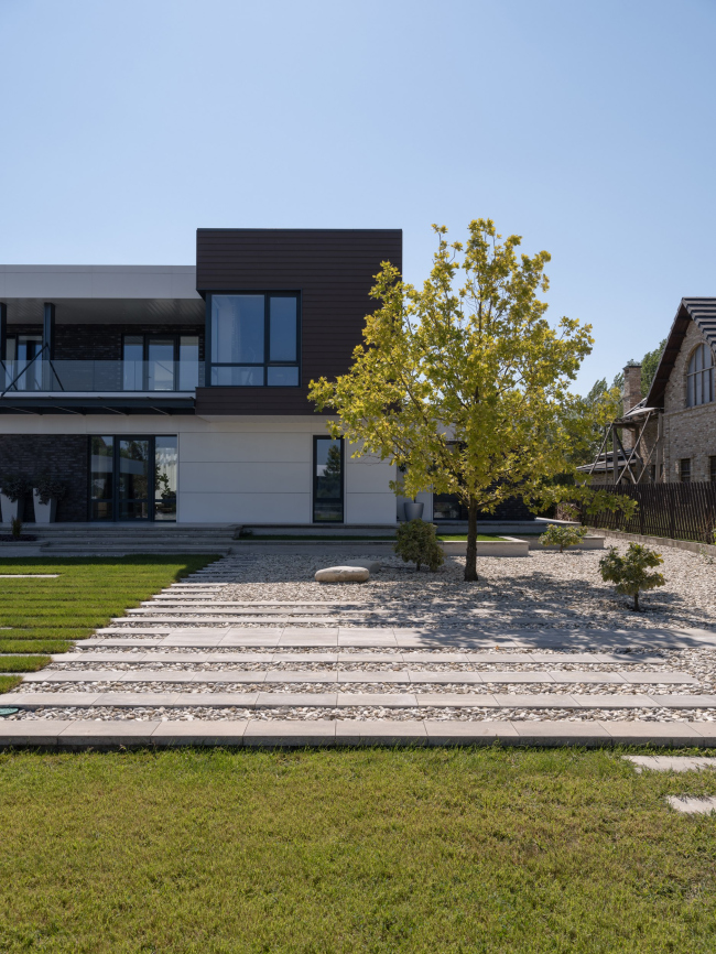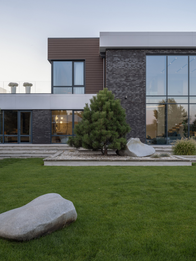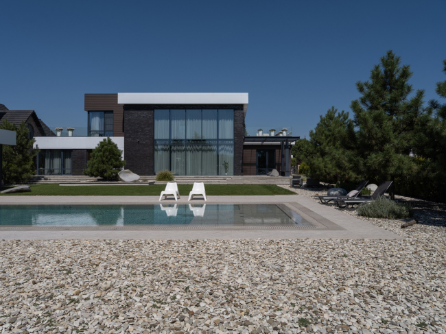 Участок расположен на первой линии коттеджного поселка вблизи набережной Дона. С него открываются великолепные виды реки, поэтому идея в первую очередь стояла в расположении помещений и основных зон дома, таким образом чтобы максимально обеспечить из них виды на Дон.