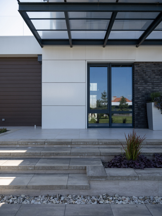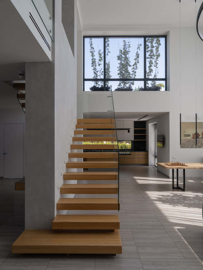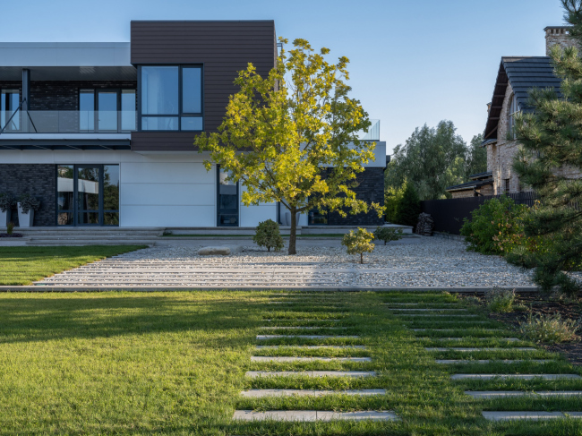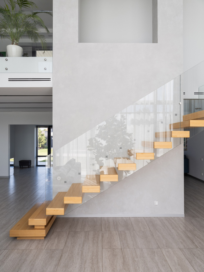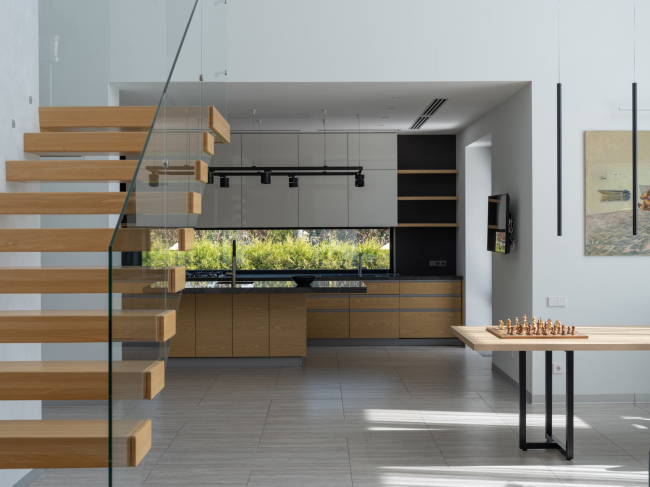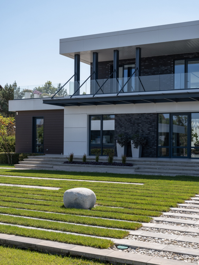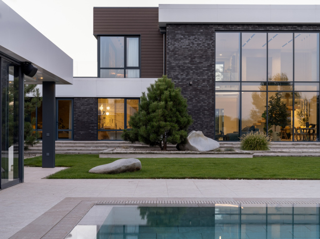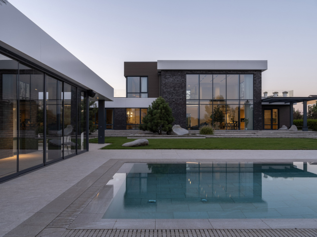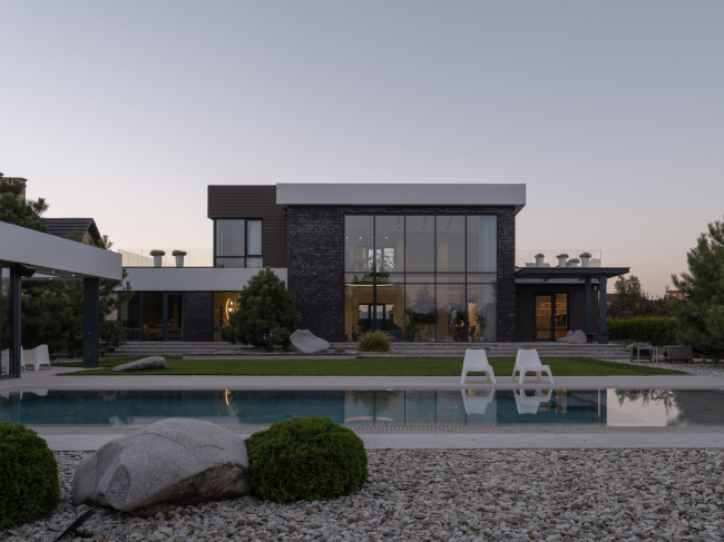 Участок расположен на первой линии коттеджного поселка вблизи набережной Дона. С него открываются великолепные виды реки, поэтому идея в первую очередь стояла в расположении помещений и основных зон дома, таким образом чтобы максимально обеспечить из них виды на Дон.
