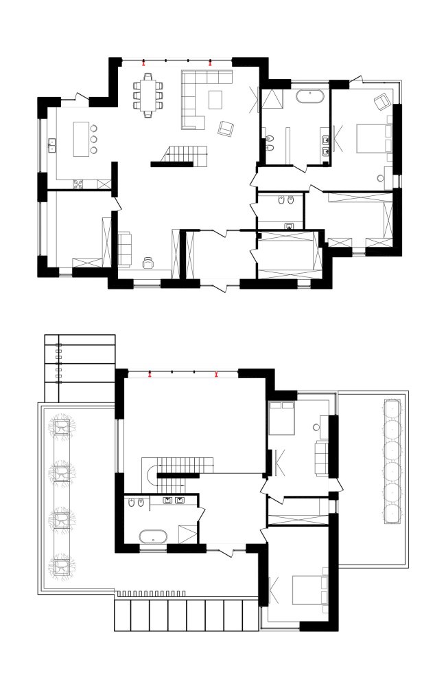 На участке, приобретенным заказчиком уже был залит фундамент, причем изначальный проект был в классическом стиле и совсем не подходил новым владельцам. Мы взяли за основу контуры существующего фундамента, доработали его и спроектировали совершенно новый дом, соответствующий потребностям заказчика. Также на участке мы расположили еще несколько построек, выполненных в стилистике основного здания и увязали их между собой элементами благоустройства.