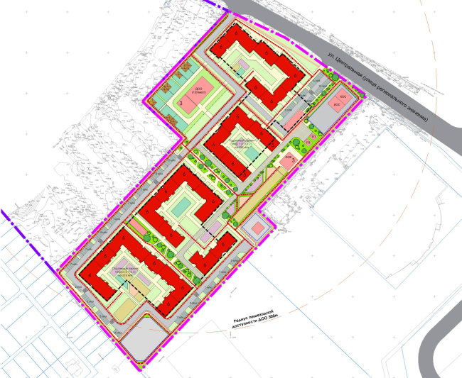 Участок располагается между улицами Центральная, Сосновая и Солнечная. Помимо жилых корпусов в рамках ППТ предусмотрено строительство детского сада, школы, двух подземных паркингов, физкультурно-оздоровительного комплекса и других объектов транспортной и социальной инфраструктуры. Благоустройство, разумеется, прилагается – площадь озеленения достигает 0,8 га.