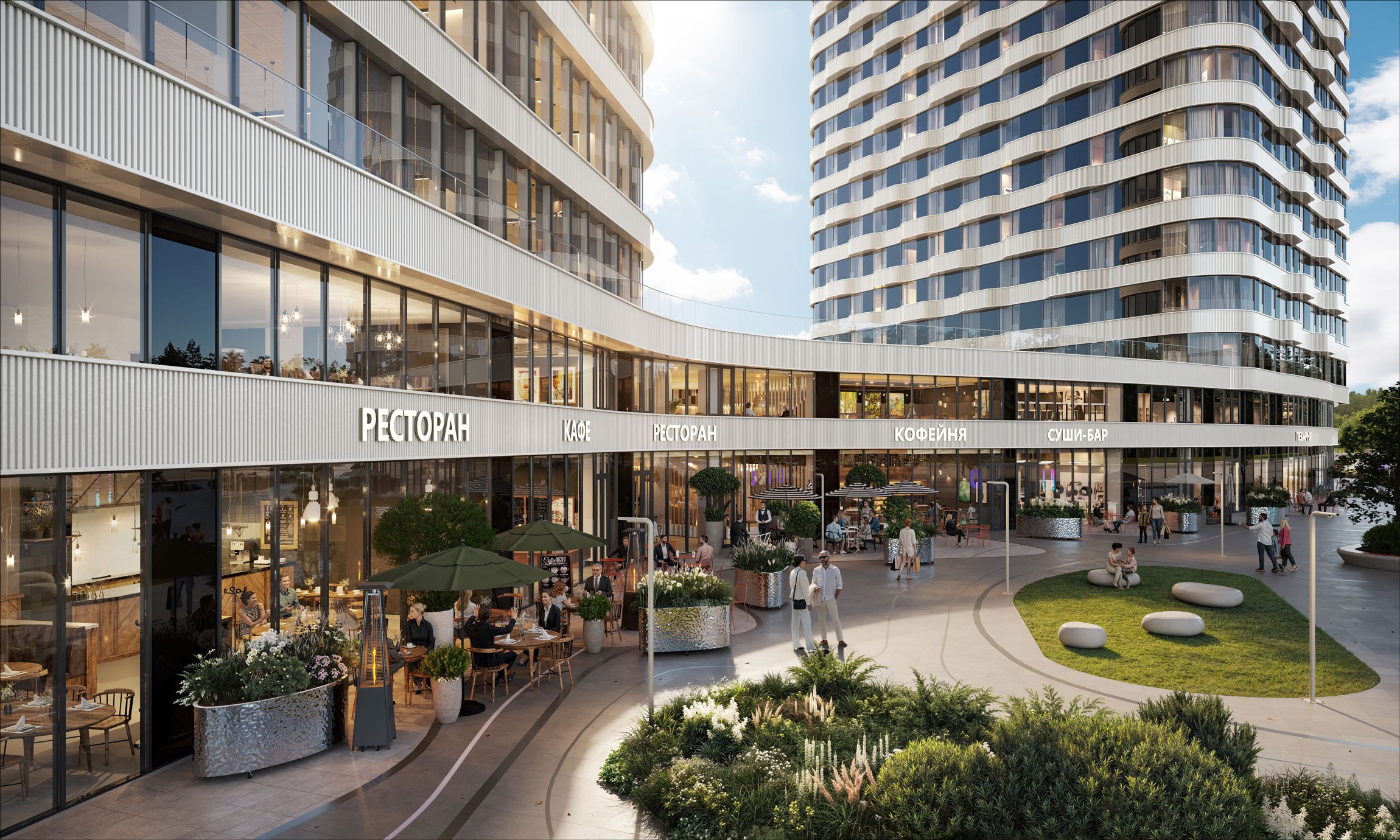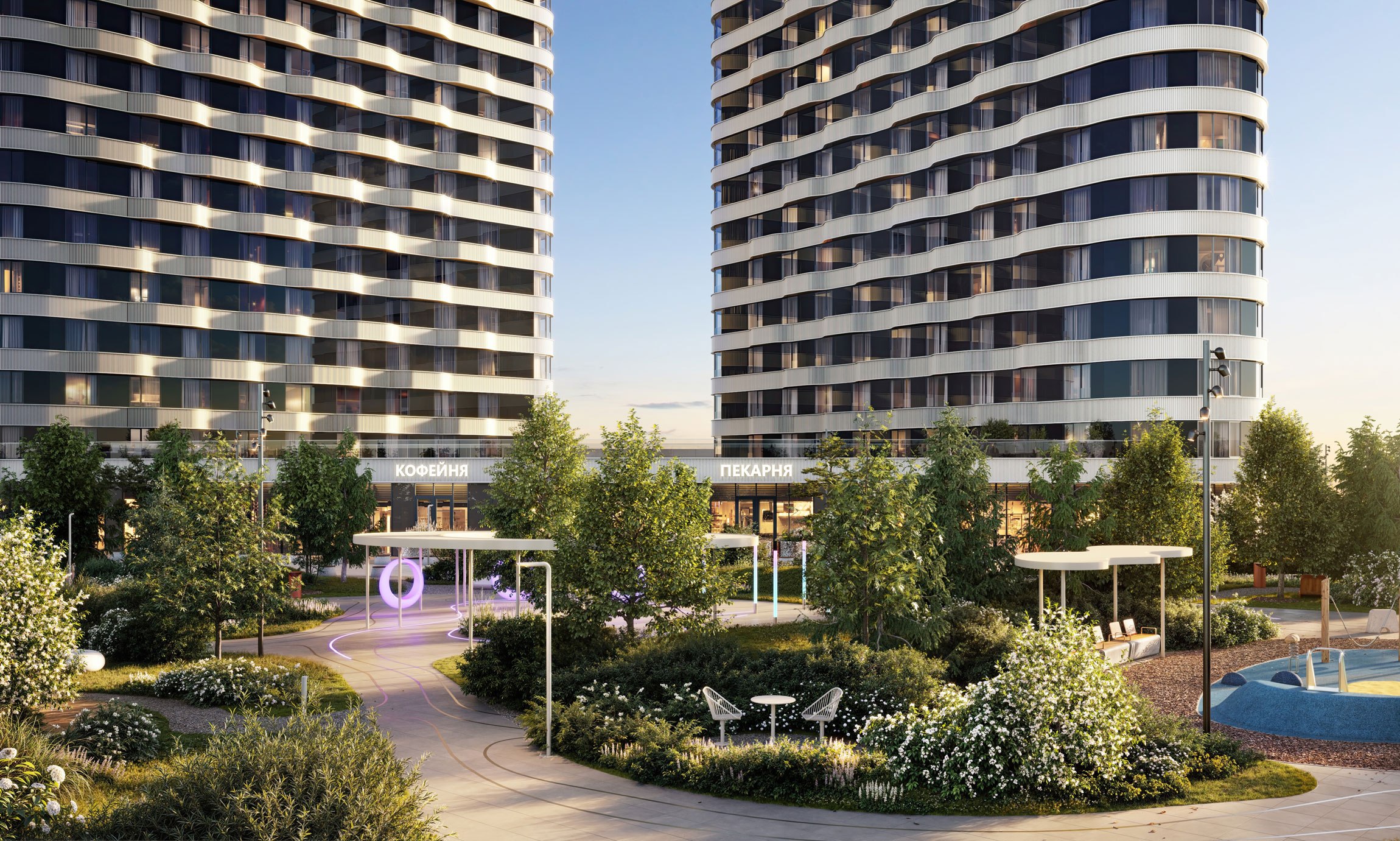 «Главной стилистикой концепции благоустройства стала футуристичность, симбиоз технологий и природы. Общедоступная территория комплекса включает в себя несколько зон, в том числе спортивную, детскую и деловую. Спортивный блок также разделят на функциональные составляющие: на первой разместятся тренажеры для воркаута, другая предназначена для активных видов спорта, например, здесь появятся столы для настольного тенниса», – отметил Сергей Кузнецов.