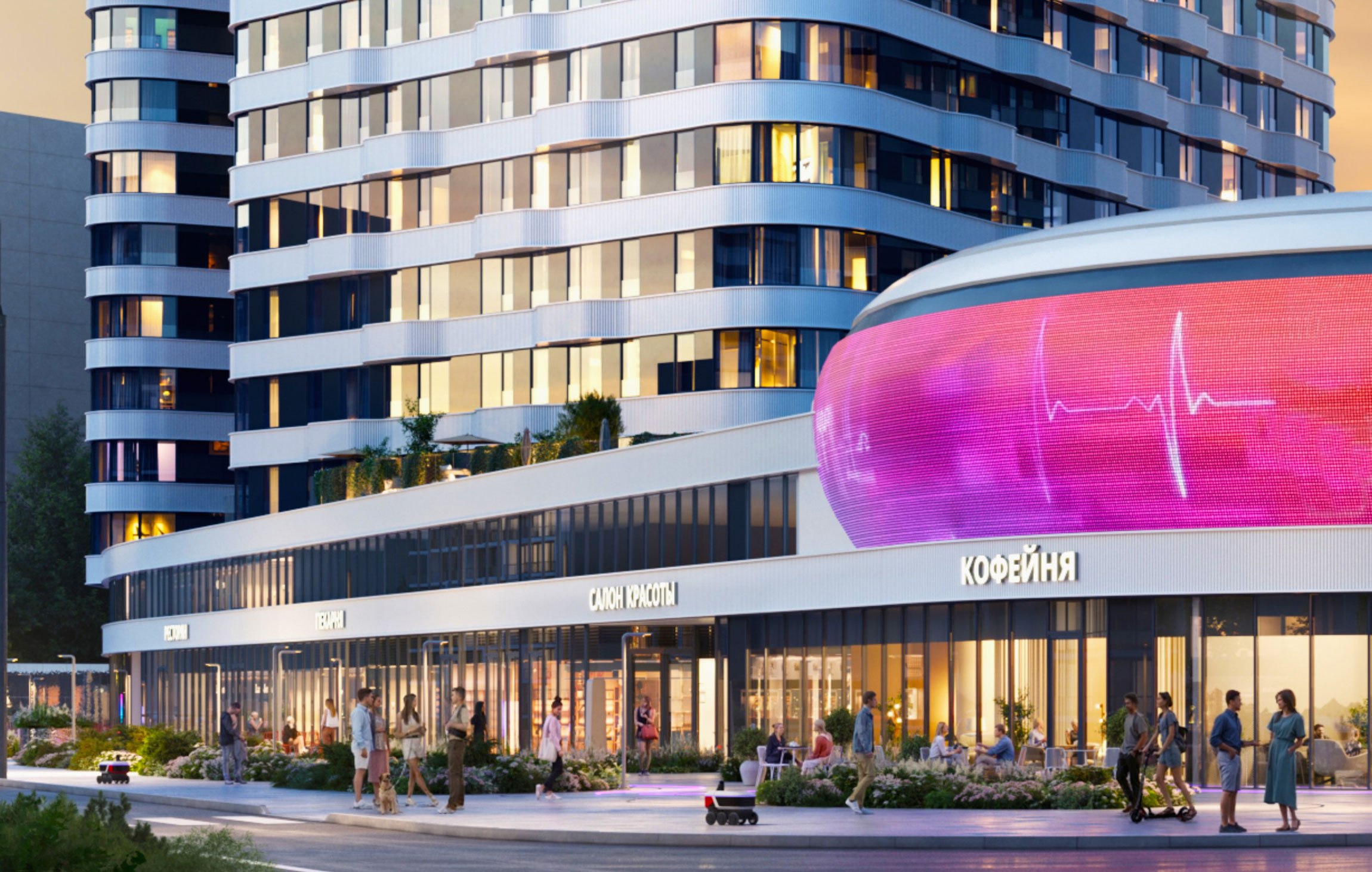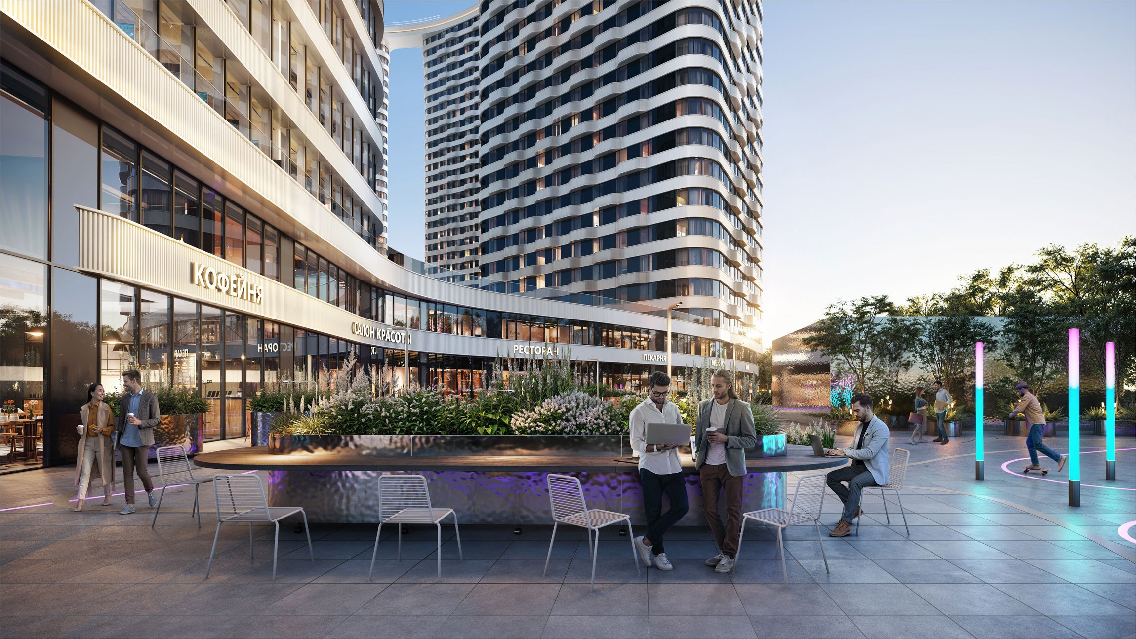 На общедоступной территории жилого кластера также расположится интерактивная зона у киберарены, наполненная отсылками к футуристичности и технологиям. Здесь появятся медиаколонны, которые будут оборудованы интерактивной навигацией и возможностью выводить контент на экран. У офисного здания в составе кластера разместят функциональные коворкинги, оборудованные для работы и отдыха. Точечно предусмотрены пространства с качелями, а также летние террасы у ресторанов.