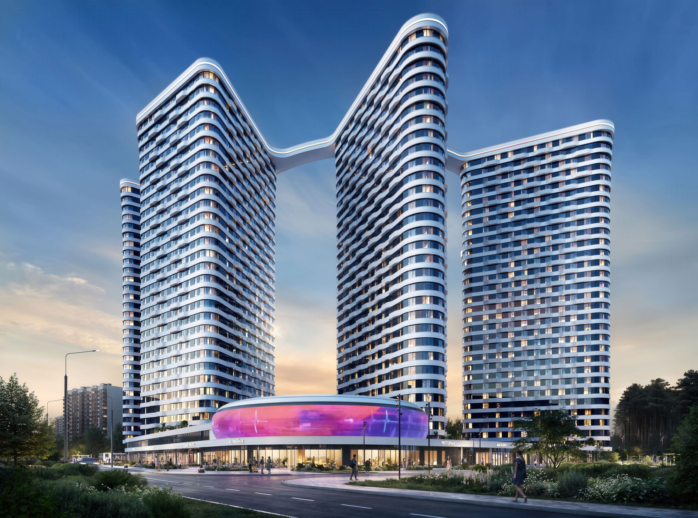 К выразительным башням в форме триангулярных и ромбовидной призм примкнут многофункциональные пространства, в которых разместятся объекты образовательной и развлекательной инфраструктуры для всех возрастов. В стилобате будут располагаться коммерческие помещения, в подземной части оборудуют паркинг и кладовые.
