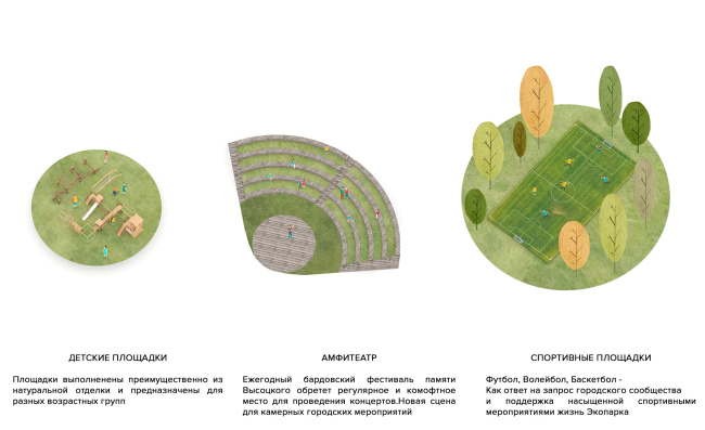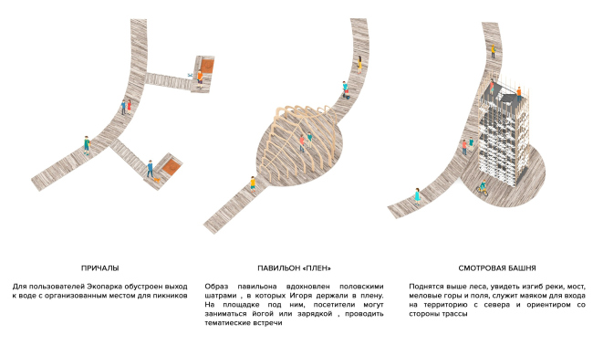 Значительная территория экопарка активируется за счет создания маршрута, включающего объекты-аттракторы, предусматривающие различные сценарии их использования. Маршрут насыщен туристической и событийной инфраструктурой, укрепляющей историческое значение места в глазах гостей, а также формирование идентичности. Генеральный план территории включает объекты повседневного использования: зоны активного и пассивного отдыха, общественного обслуживания и многофункциональные зоны. К ним относятся спортивные площадки, маршрут для проведения лыжных соревнований, зона лазертага, места для отдыха у воды, зона кемпинга и детские площадки, а также территории для размещения частного бизнеса.