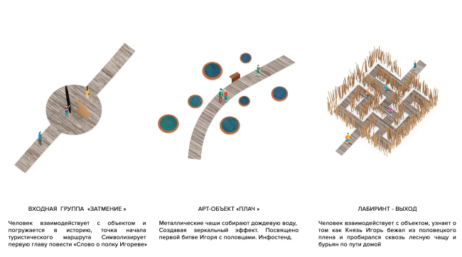 Точка начала туристического маршрута – входная группа «Затмение». Здесь символически начинается поход: Игорь 1 мая 1185 года видит солнечное затмение, которое считалось дурным предзнаменованием, и заранее чувствует неудачу, однако все же направляется против половцев. Посетитель взаимодействует с объектом и погружается в историю.