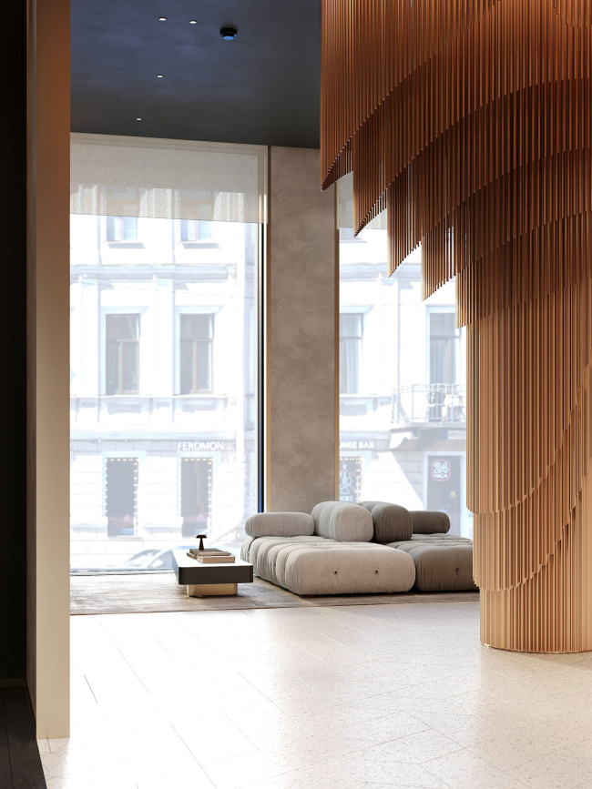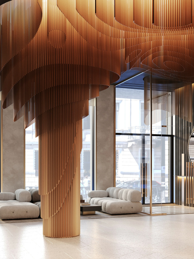 Главным акцентом и украшением лобби является колонна и завершающая её потолочная композиция, которые по форме напоминают разворачивающийся витками холст в рулоне. Настенное панно за стойкой ресепшн также напоминает натянутые в ткацком станке нити. Оформление лобби сочетает в себе классическую чистоту и прямизну линий с обтекаемостью форм отдельных декоративных элементов, за счет чего достигается эффект свежего взгляда при сохранении традиционного наполнения пространства.
