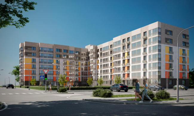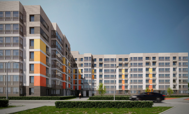 Новый объект жилого назначения представляет собой Г-образное здание в плане. Архитектурное решение дома позволяет гармонично вписать его в существующую застройку и обеспечить связь с окружающей средой. В оформлении фасадов преобладают натуральные оттенки: на первом, шестом и седьмом этажах – серо-коричневая бетонная плитка под кирпич. Кирпичный «пояс» придает дому законченный образ. В отделке со второго по пятые этажи преобладает белая фоновая штукатурка. Акцентными элементами в облике выступают цветные вставки около оконных проемов, с растяжкой от этажа к этажу в теплых тонах: от красного цвета до бледно-желтого.