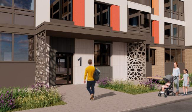 Завершают образ входные группы с ажурными боковыми стенками в виде арабесок, что придает легкости нижней части здания, а также вносит элемент дизайна в экстерьер привычной входной группы. Для удобства жильцов, входы в каждый в подъезд организован без ступеней, лестниц и пандусов. Также устанавливаются прозрачные входные двери, что обеспечивает комфорт и безопасность.