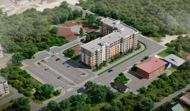 Г-образная форма здания позволяет организовать полузакрытый внутренний двор. В рамках проекта запланировано благоустройство территории двора, организация детской площадки, зона для отдыха, пешеходных дорожек, парковочных мест.