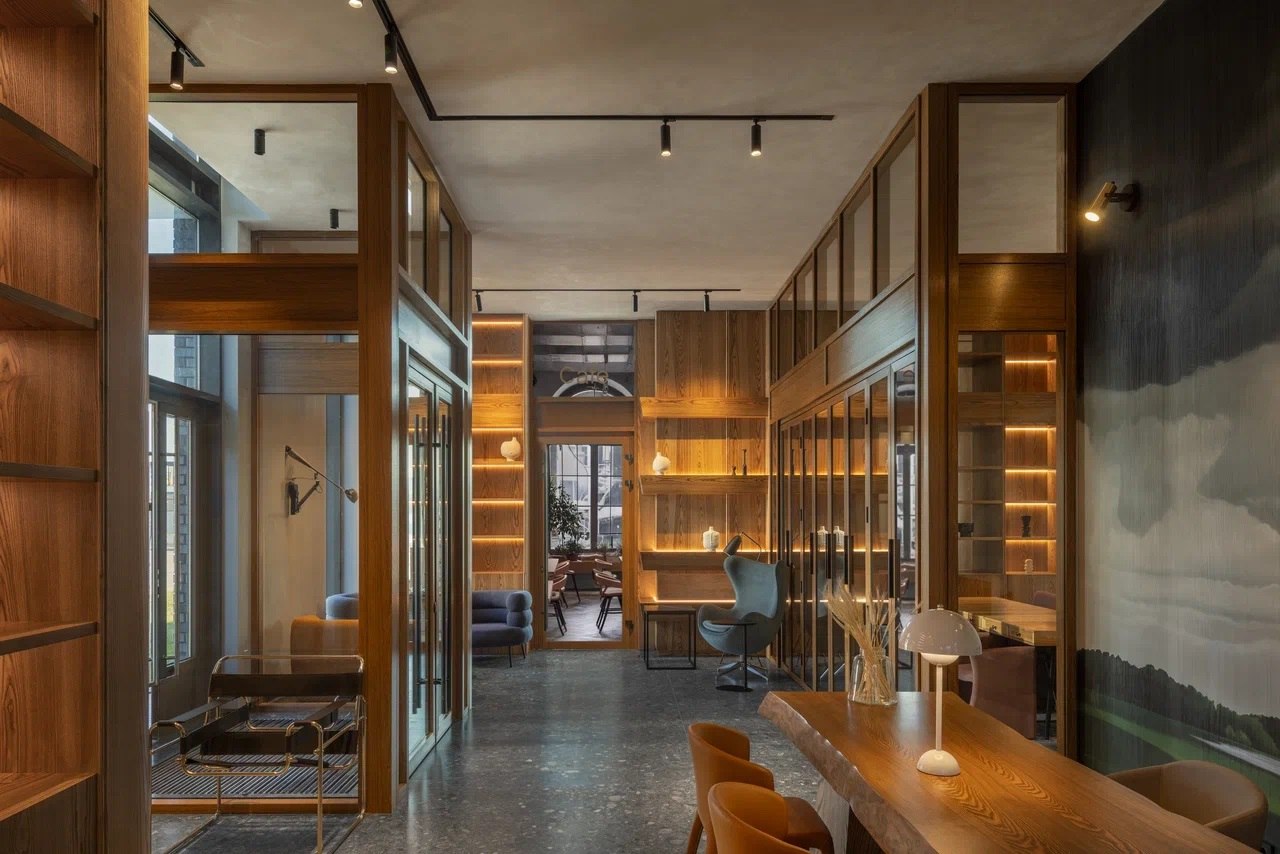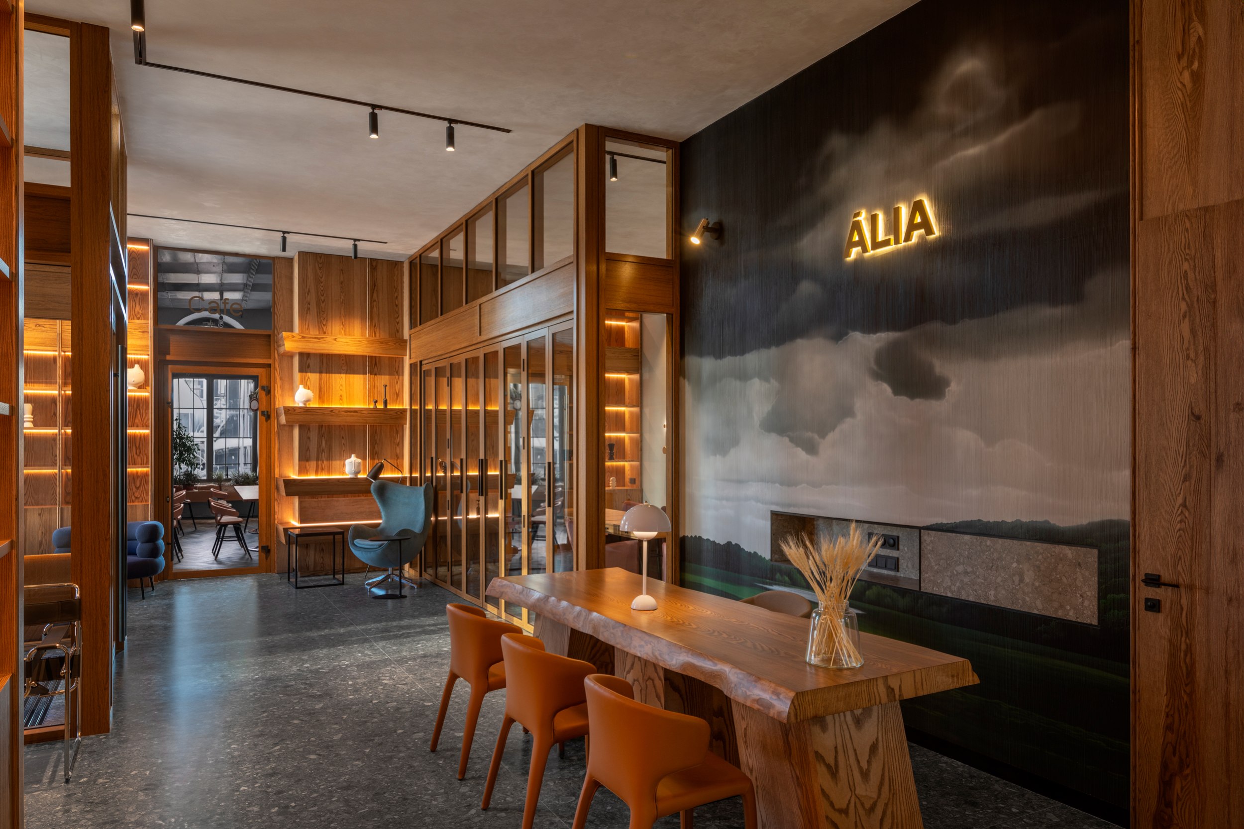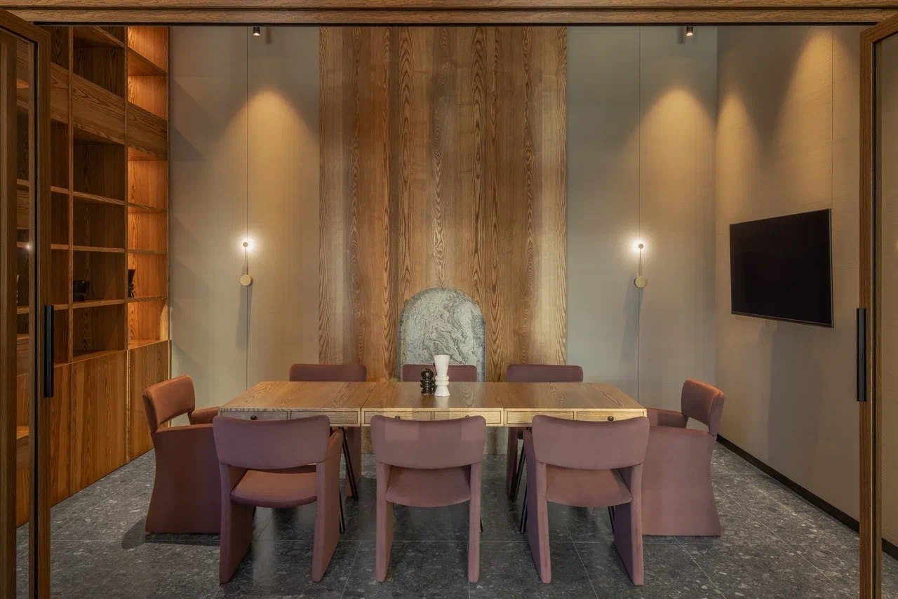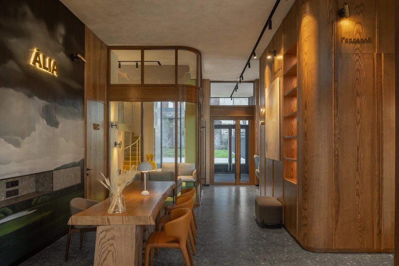 Главной идеей лобби 10Е стала концепция «Рабочего кабинета», который, в условиях распространения гибридного или удаленного форматов работы, стал жизненно необходим современным горожанам. Возможность выйти из дома и сменить обстановку для продуктивного рабочего дня стала точкой опоры для стилистики интерьера, которая вдохновлена эстетикой Баухаус. Кабинетную атмосферу поддерживают оттенки теплого дерева, высокие стеллажи с книгами, мебель глубоких землистых оттенков и высокие деревянные витражи. Ресепшн в виде массивного низкого стола не только поддерживает эту эстетику, но и становится новой точкой контакта с аудиторией: за низкой посадкой гость будет чувствовать себя более комфортно и расслабленно. Среди «фишек» планировочного решения можно выделить центральный стеклянный объем переговорной комнаты, которая может использоваться для вечерних настольных игр.