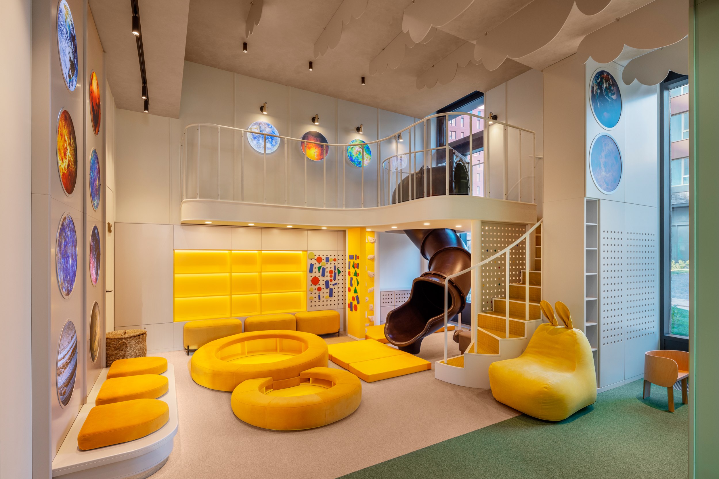 Не забыли мы и о родителях. Сегодня современные мамы и папы вынуждены совмещать множество социальных ролей, переключаться между которыми бывает не всегда комфортно. Для этого мы выполнили ограждение детской комнаты из витражного остекления, которое позволяет наблюдать за игрой своего ребенка из лобби, в котором можно спокойно поработать, почитать книгу, выпить кофе или встретиться с друзьями.