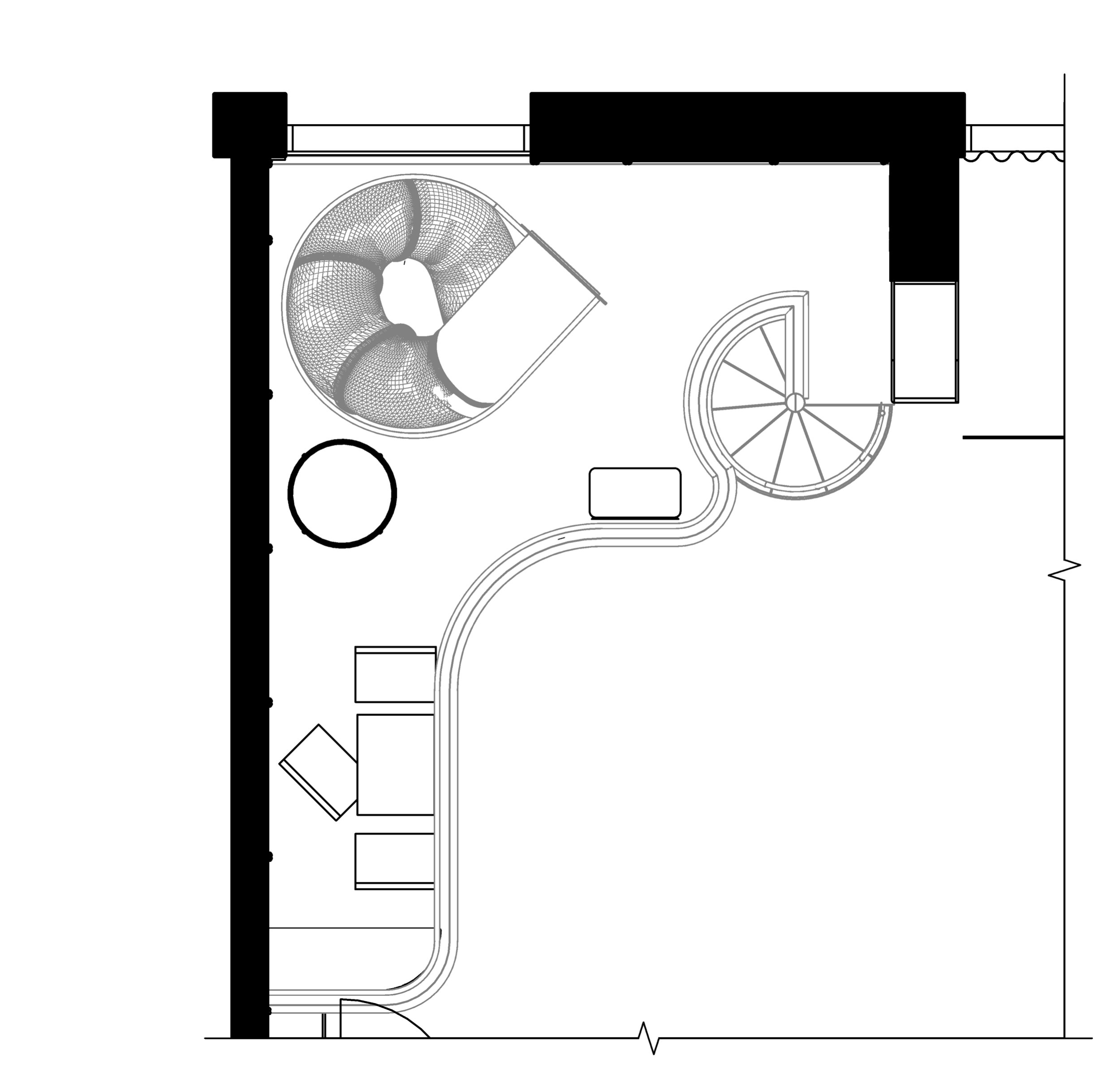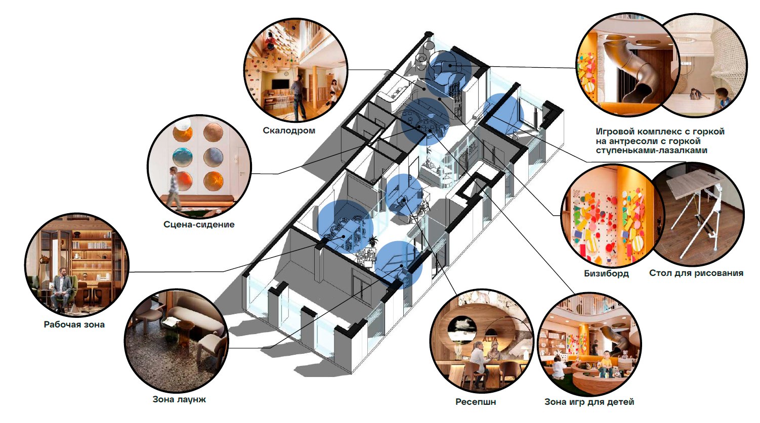 Немаловажным элементом здесь является детская комната, которая также вторит тематике главного пространства – своеобразная точка приложения детской «продуктивности». В проекте заложены все условия для маленьких гостей: среди активностей здесь представлены: тихий уголок для рисования с возможностью проведения занятий с педагогом для небольшой группы (до 4х человек), сцена для выступлений и занятий сценическим мастерством, «бассейн» с игрушками для разных возрастных категорий, горка и сетки для активных игр, уголок настольных игр и развивающих упражнений на втором этаже.