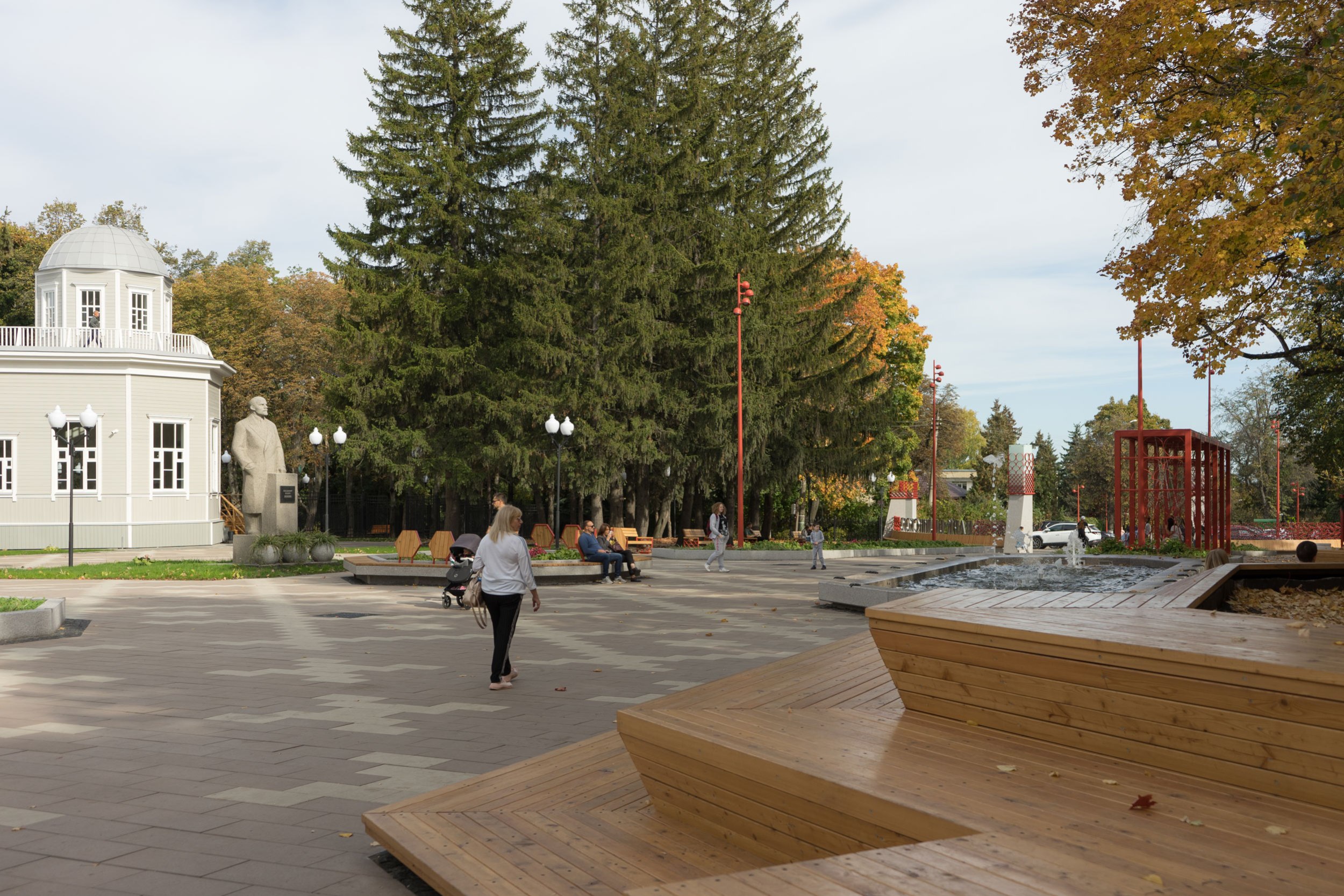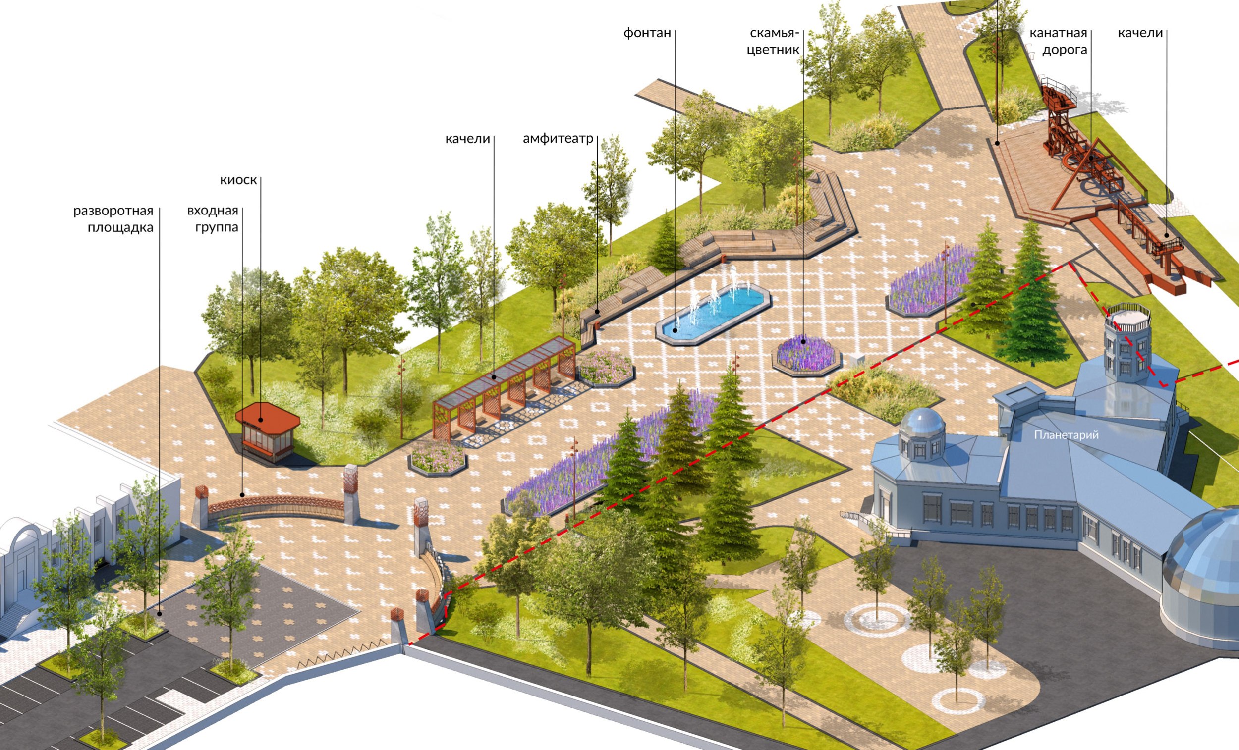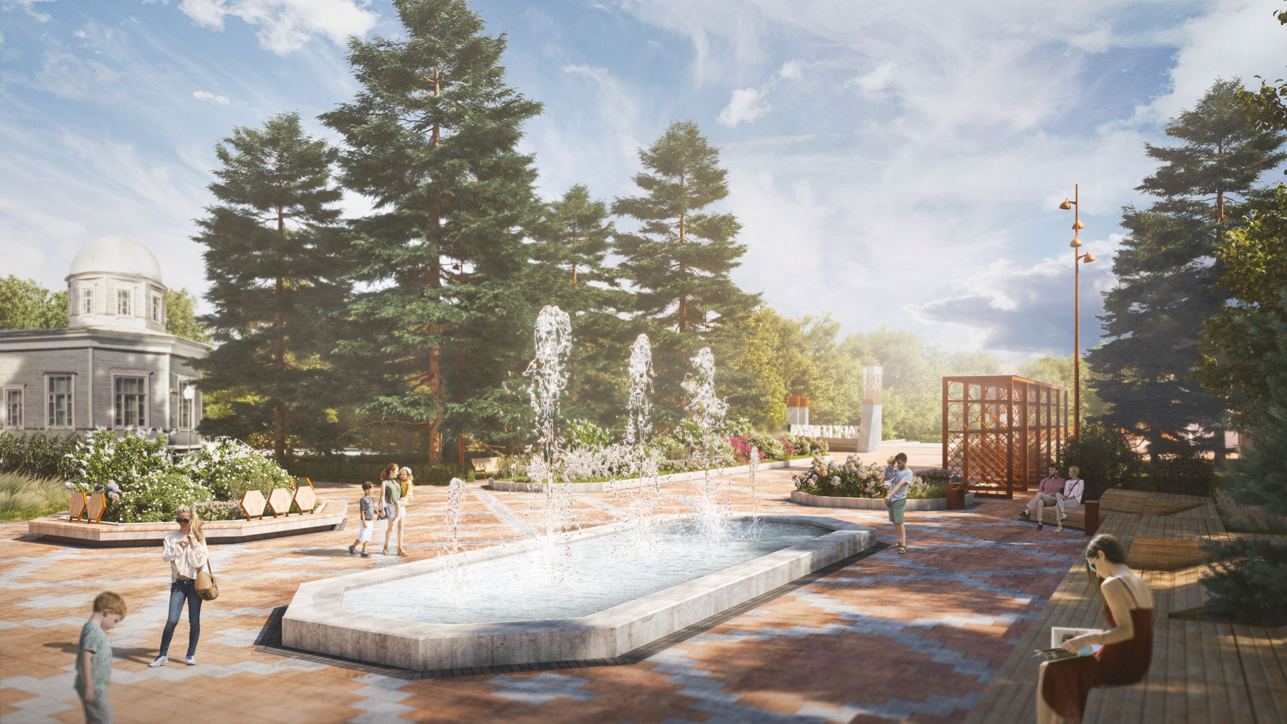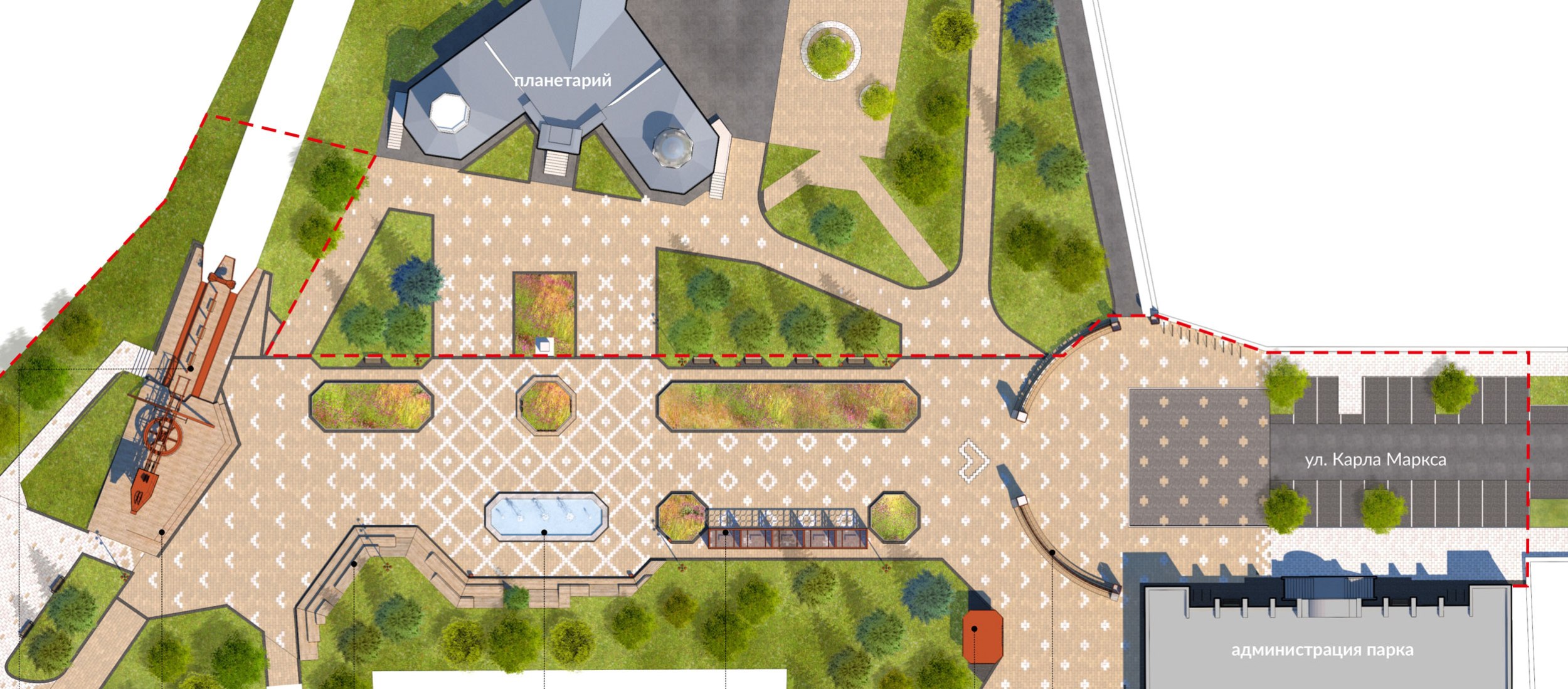 В 2023 году была реализована первая очередь – входная площадь перед планетарием. Планетарий является объектом культурного наследия и имеет необычную форму с башнями-восьмериками. Эта форма поддержана в благоустройстве восьмиугольными цветниками, фонтаном и диагональным рисунком мощения. Рисунок мощения «динамичный»: от классических клеток в центре жесткая сетка постепенно «распадается» на отдельные орнаментальные элементы, которые отсылают к декору деревянных павильонов, некогда располагавшихся в парке.