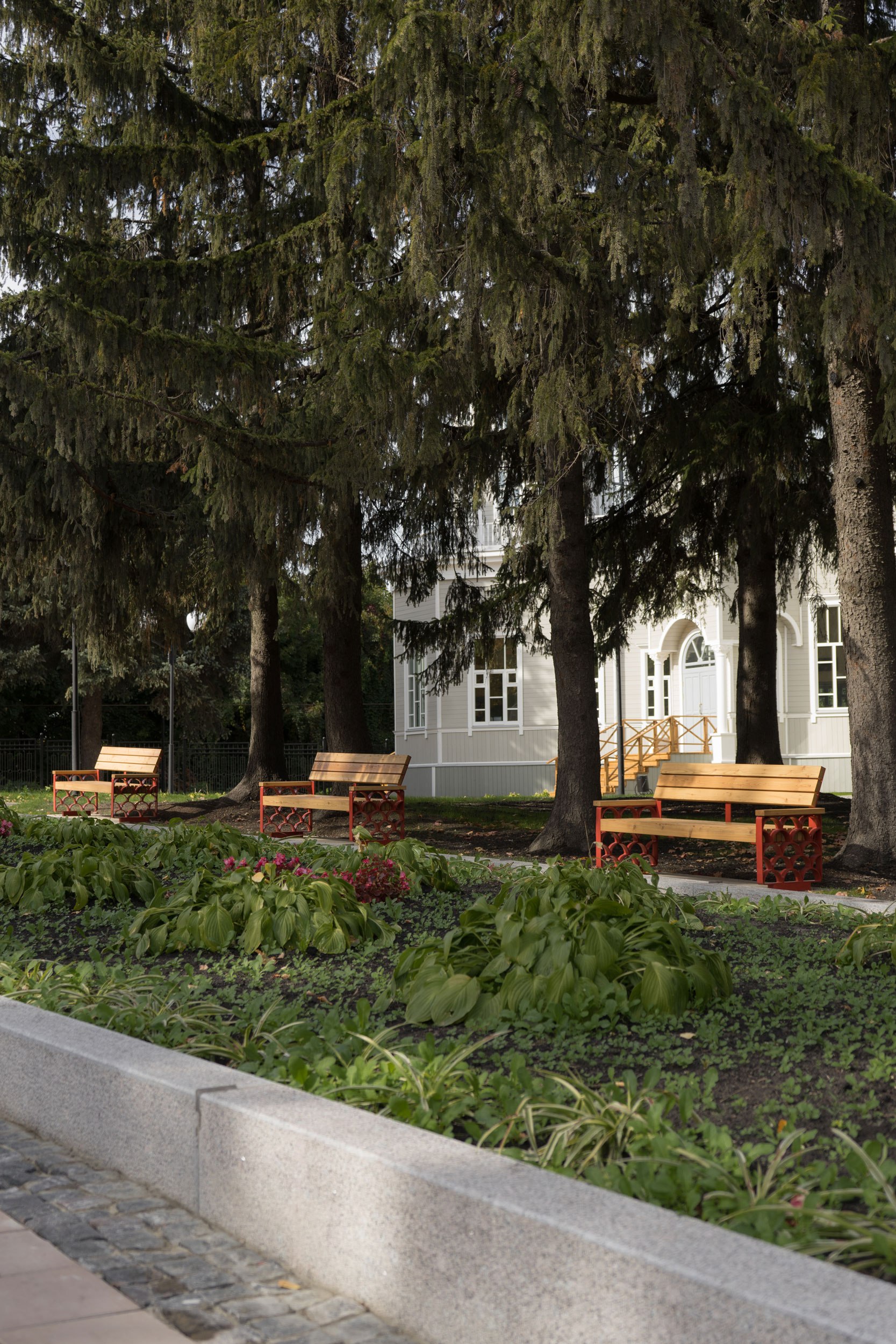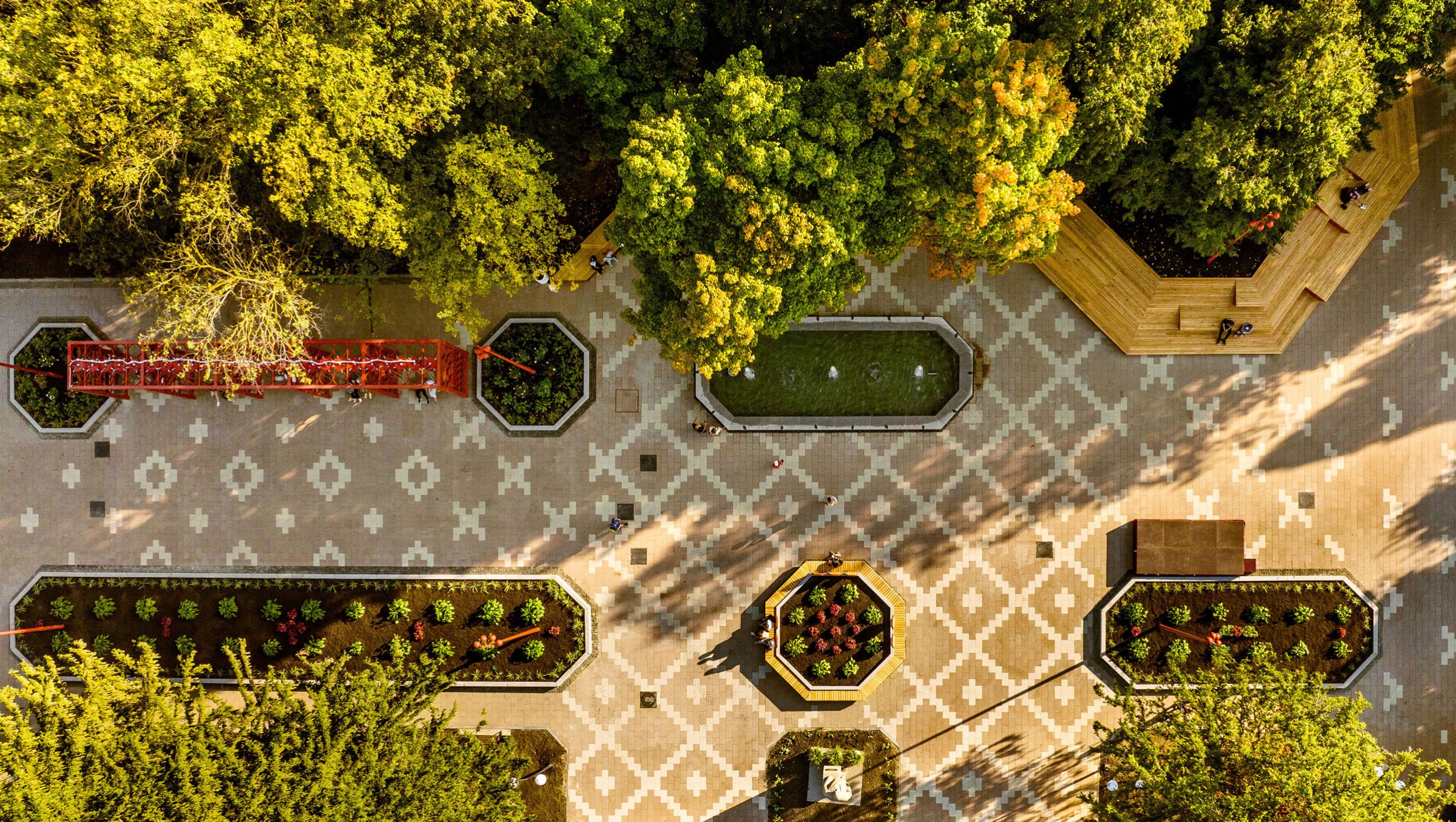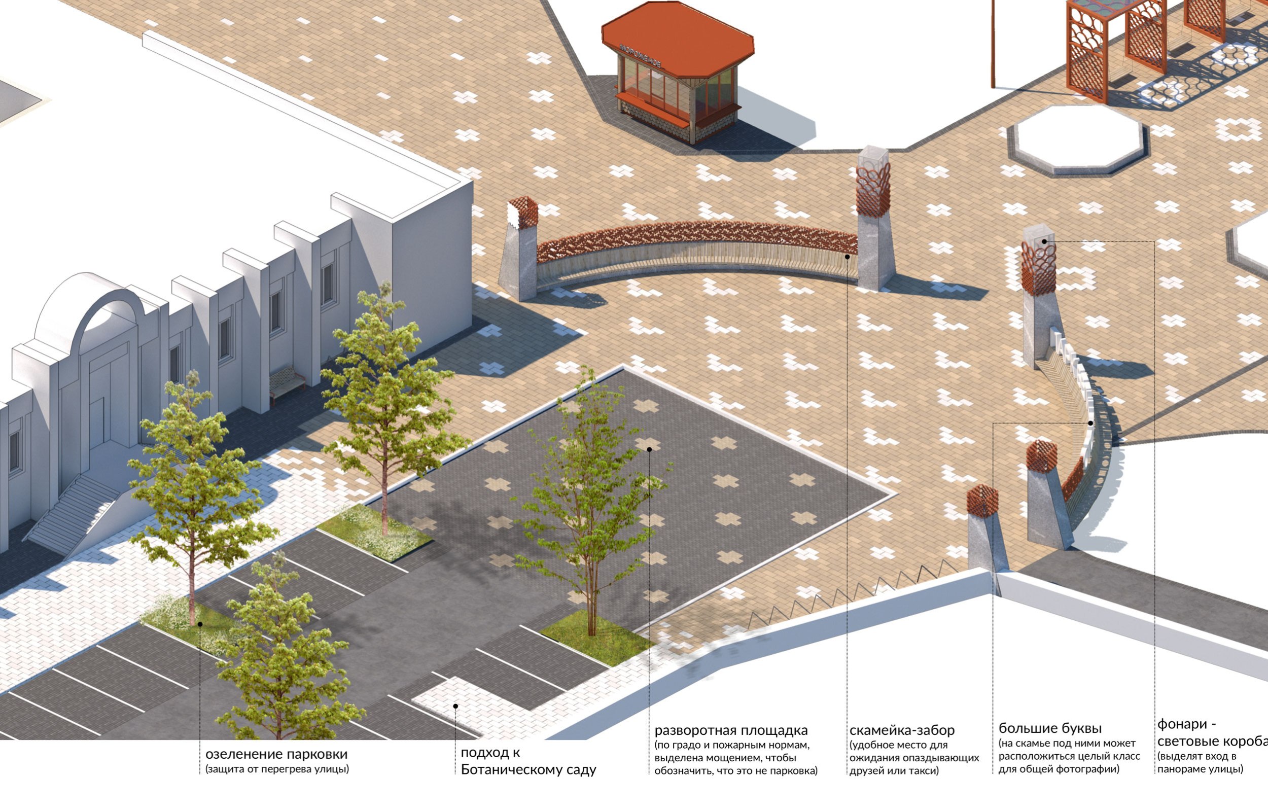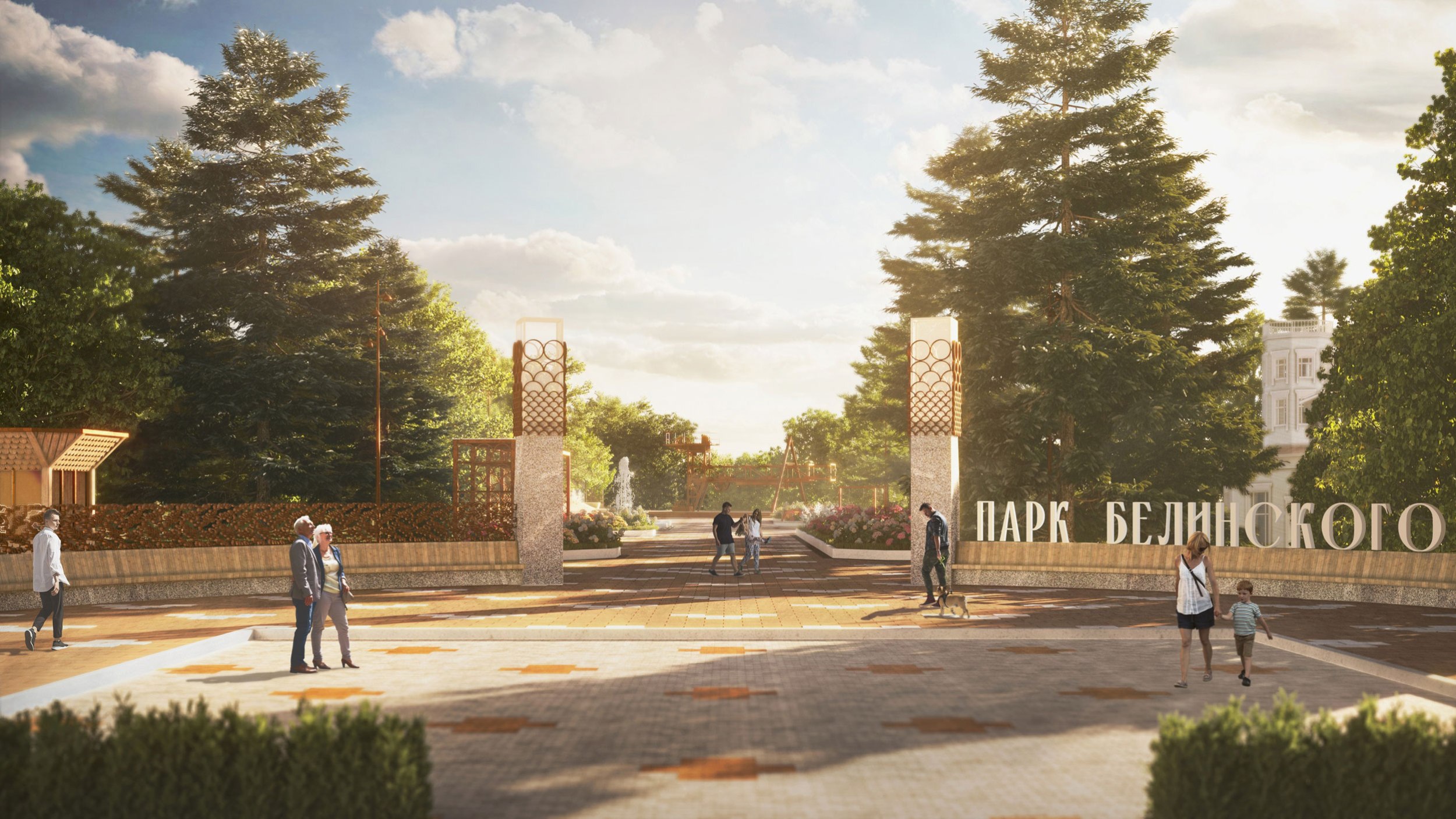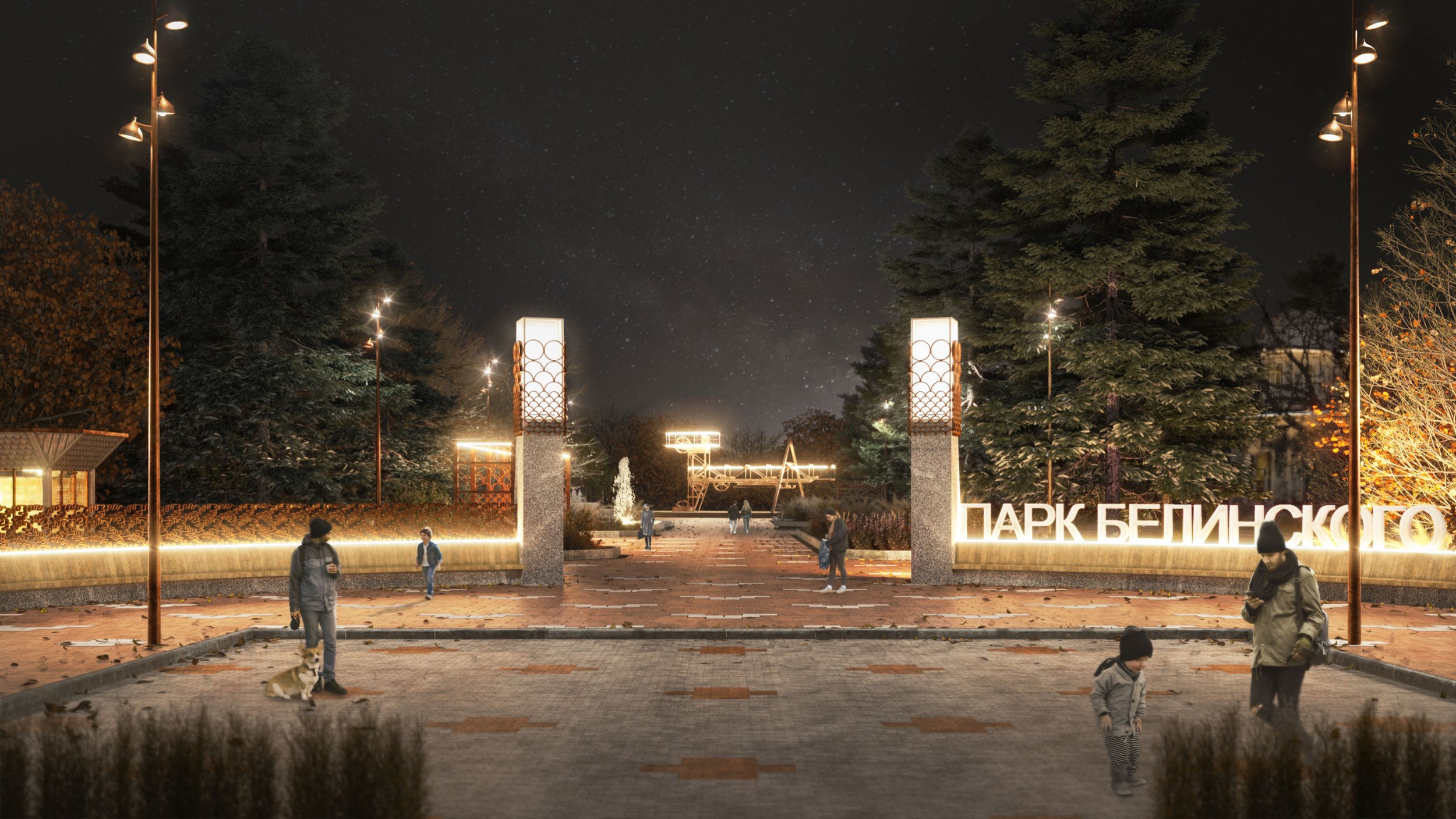 В 2023 году была реализована первая очередь – входная площадь перед планетарием. Планетарий является объектом культурного наследия и имеет необычную форму с башнями-восьмериками. Эта форма поддержана в благоустройстве восьмиугольными цветниками, фонтаном и диагональным рисунком мощения. Рисунок мощения «динамичный»: от классических клеток в центре жесткая сетка постепенно «распадается» на отдельные орнаментальные элементы, которые отсылают к декору деревянных павильонов, некогда располагавшихся в парке.