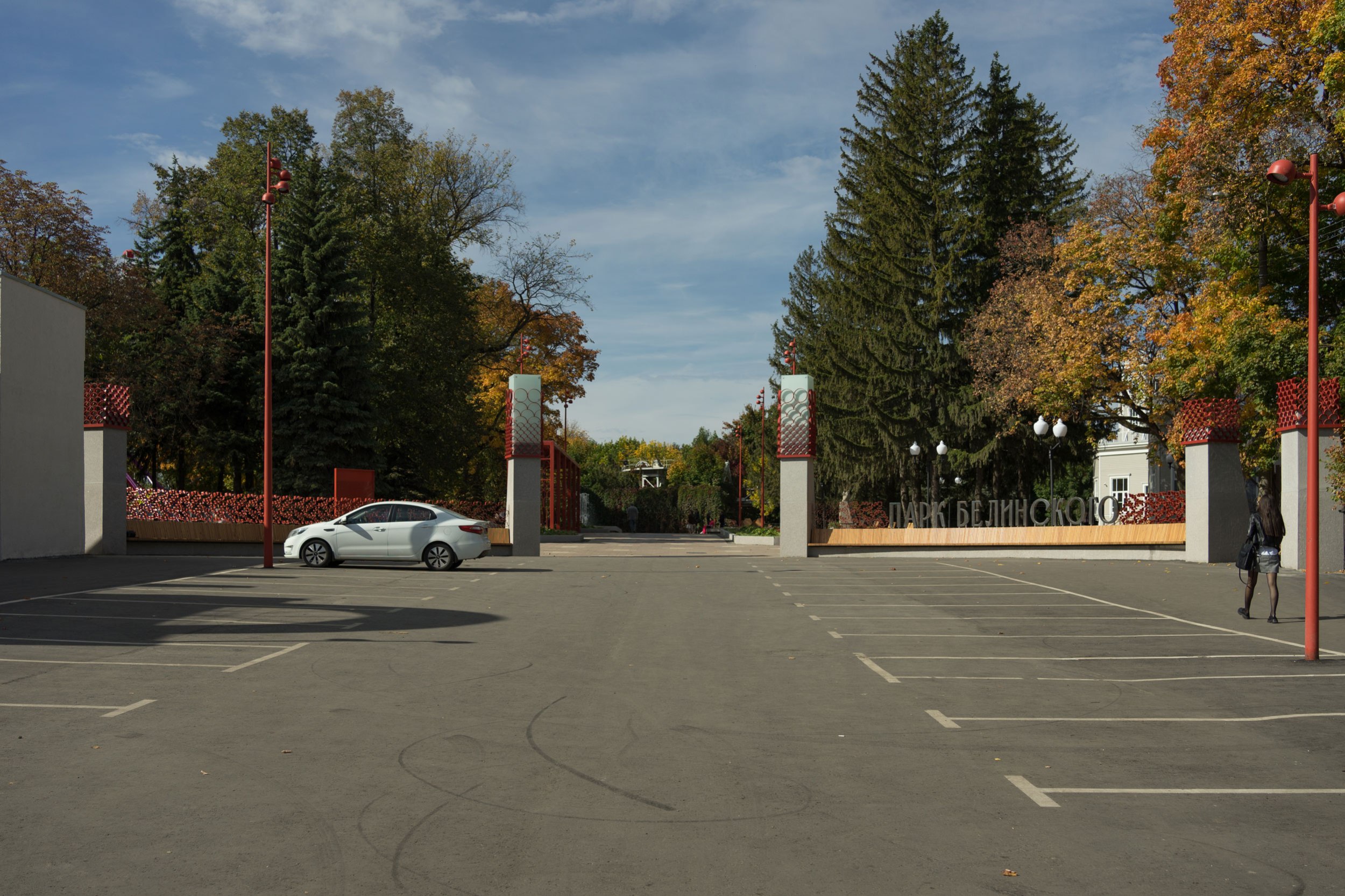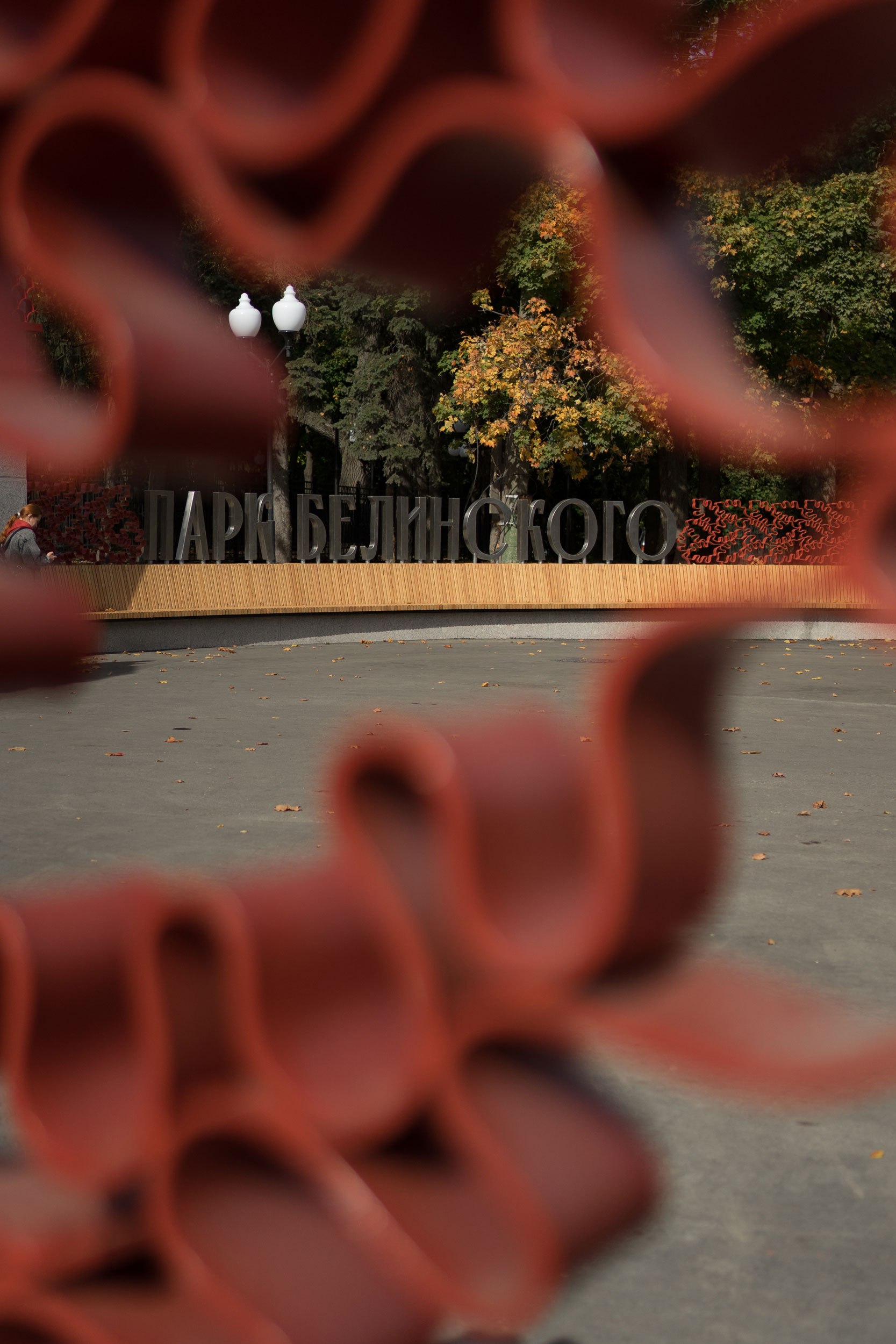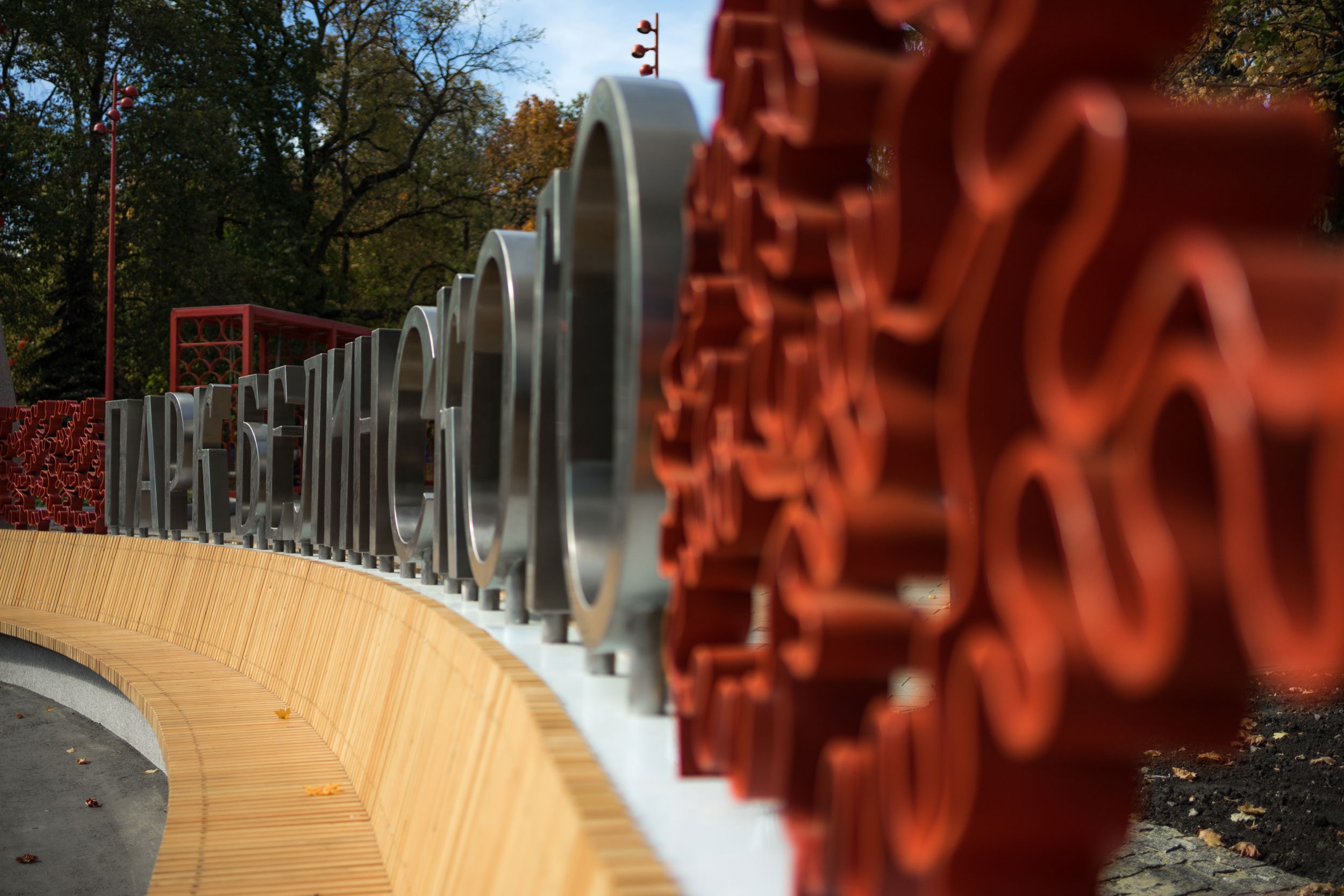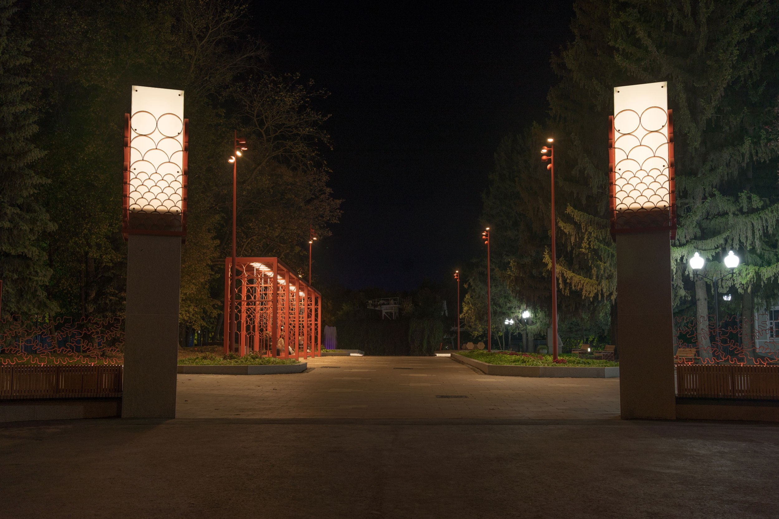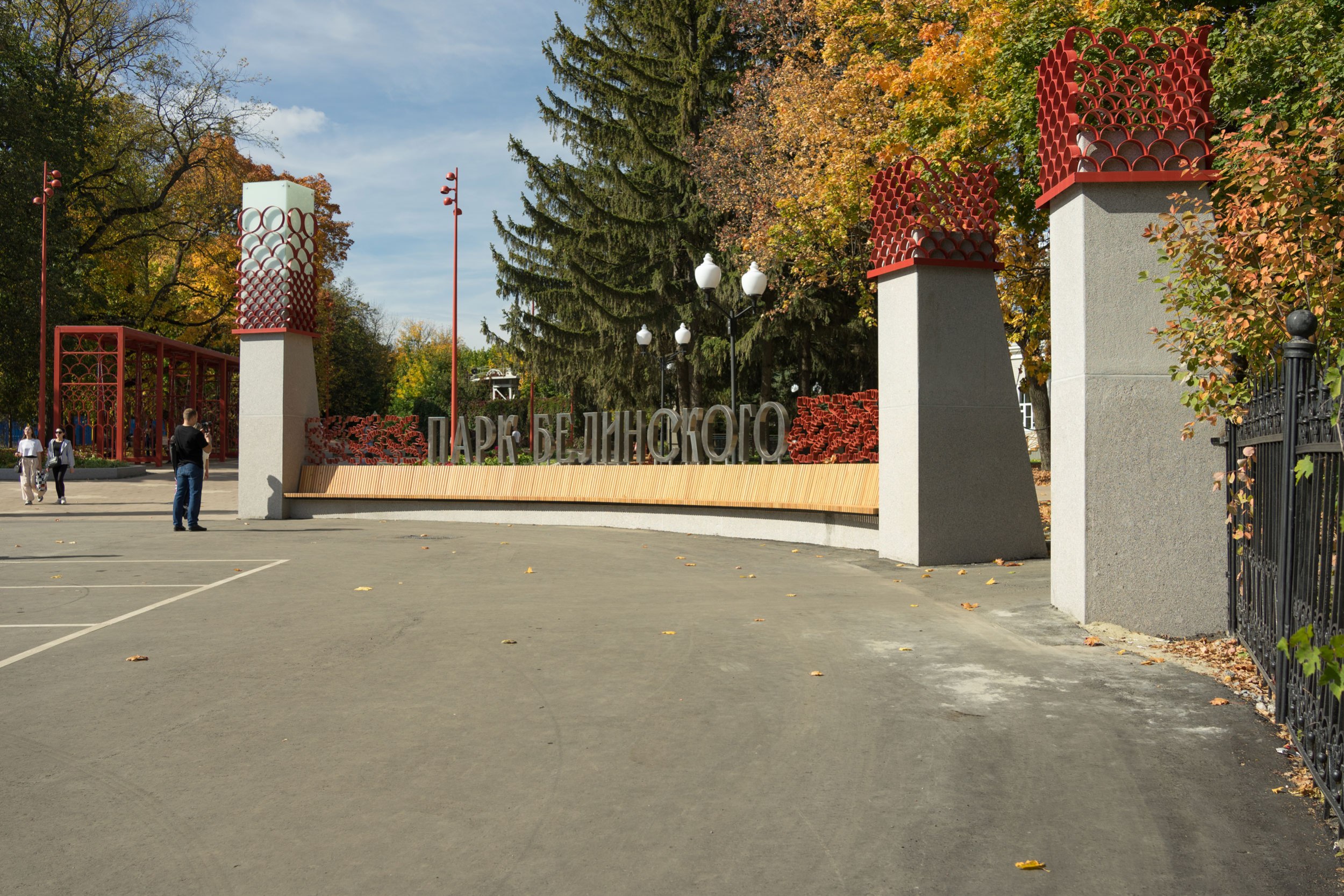 Концепцией была сохранена основная форма входной зоны 1980-х годов, но пилоны были дополнены световыми фонарями, которые видны издалека в перспективе улицы. На входе появилась длинная скамья для ожидания припозднившихся друзей и большая надпись, рядом с которой удобно фотографироваться компанией или коллективом. Утилитарное ограждение было заменено на вязь из дубовых листьев – своеобразный дубовый венец. Дуб – символ парка.