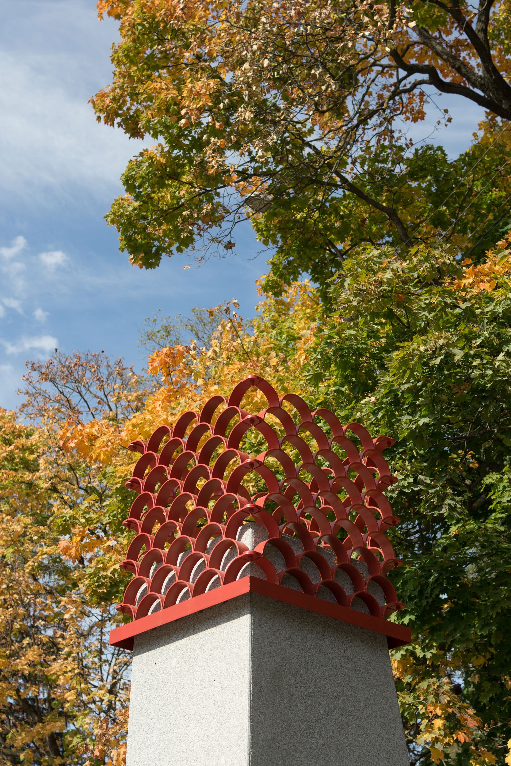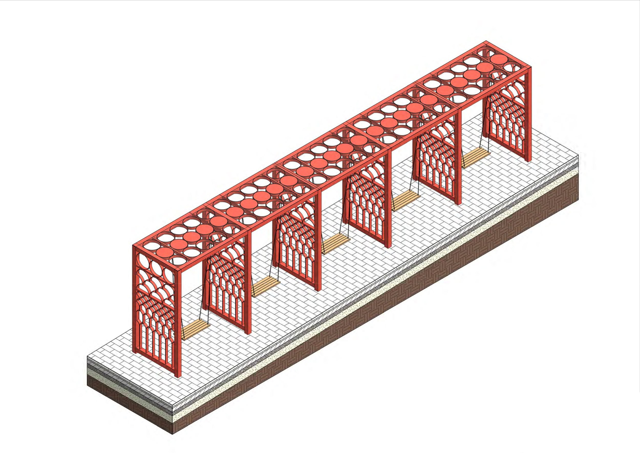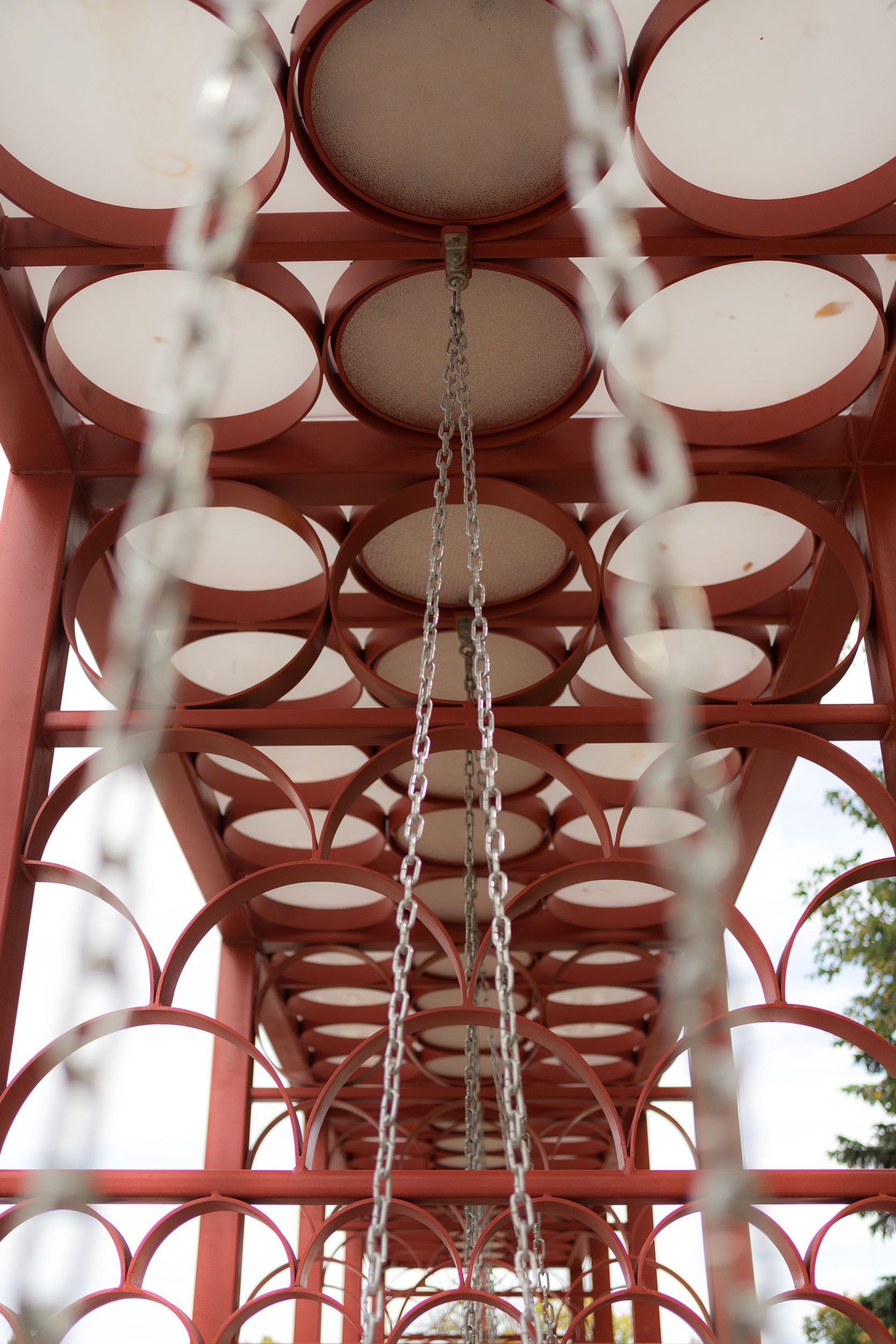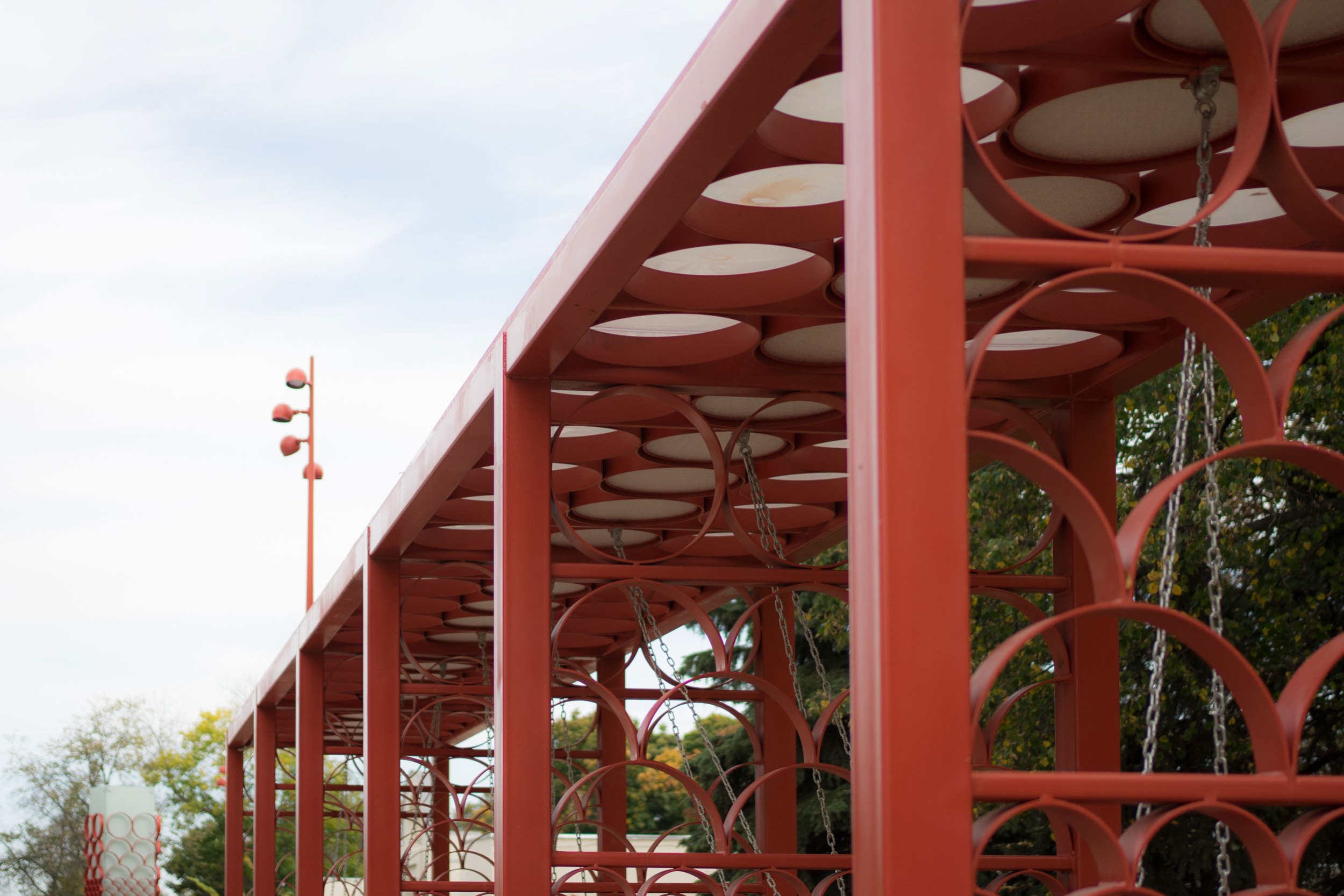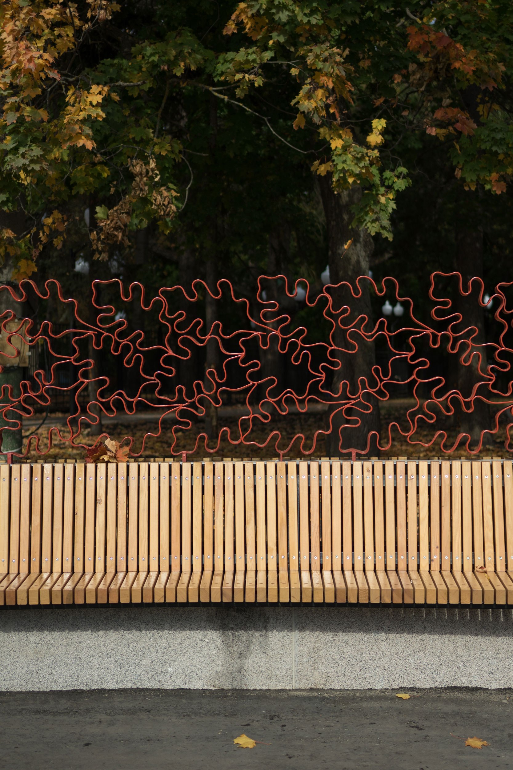 Еще один мотив в малых архитектурных формах – «чешуя»: здесь отсылка и к фактуре крышки желудя, и к часто используемому орнаменту 50-х годов, когда была спланирована площадь. Также была найдена фотография деревянных скамеек парка с таким орнаментом; по ее мотивам были спроектированы новые фирменные «чешуйчатые» скамейки парка.