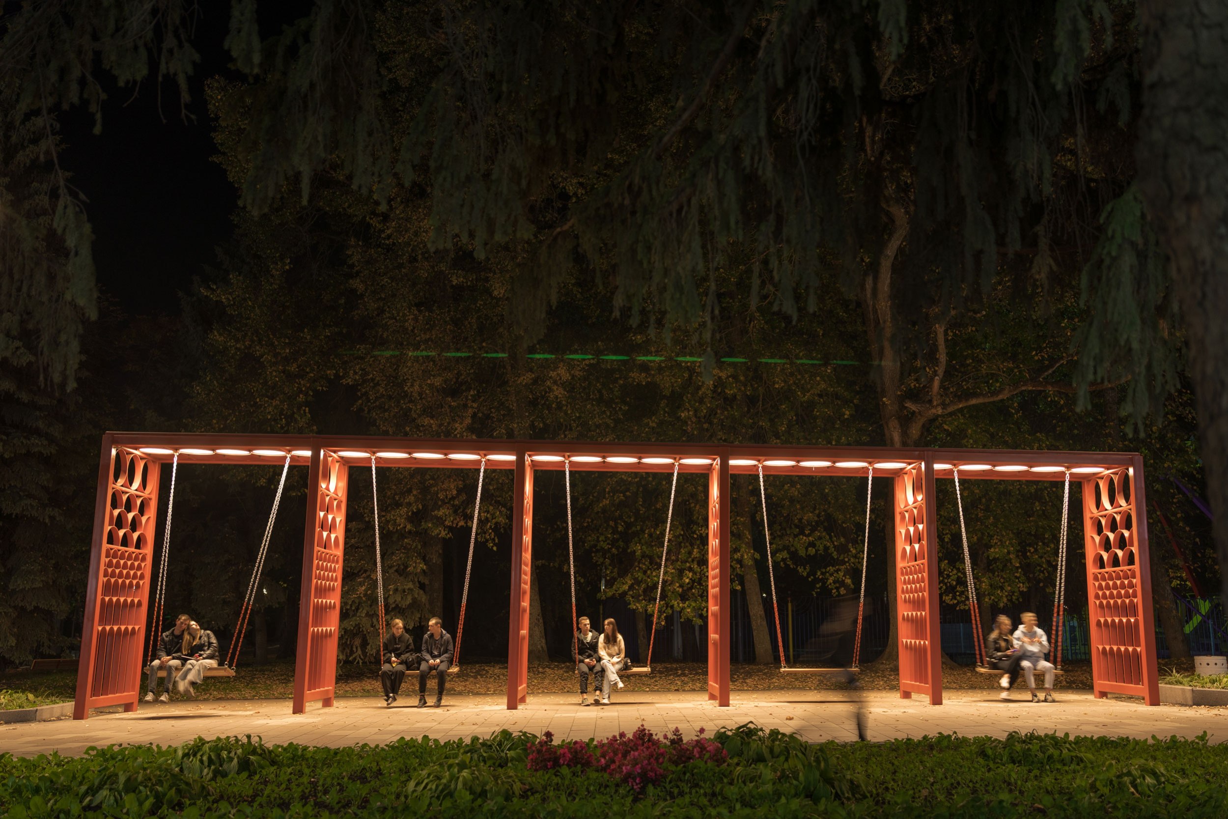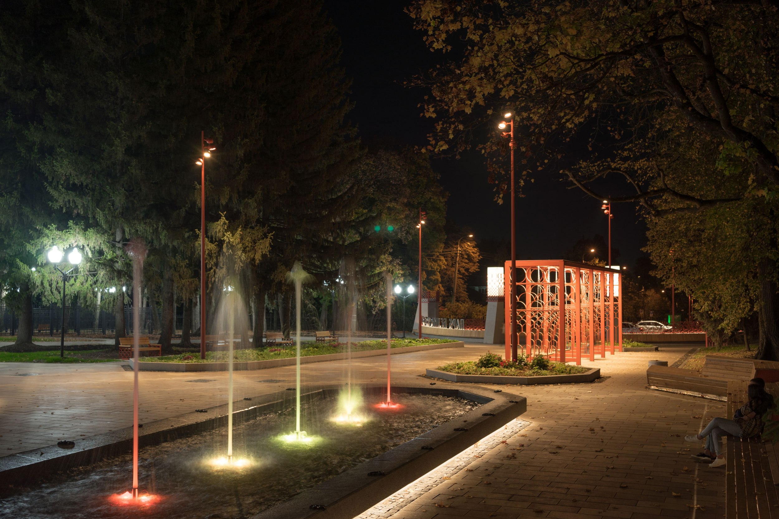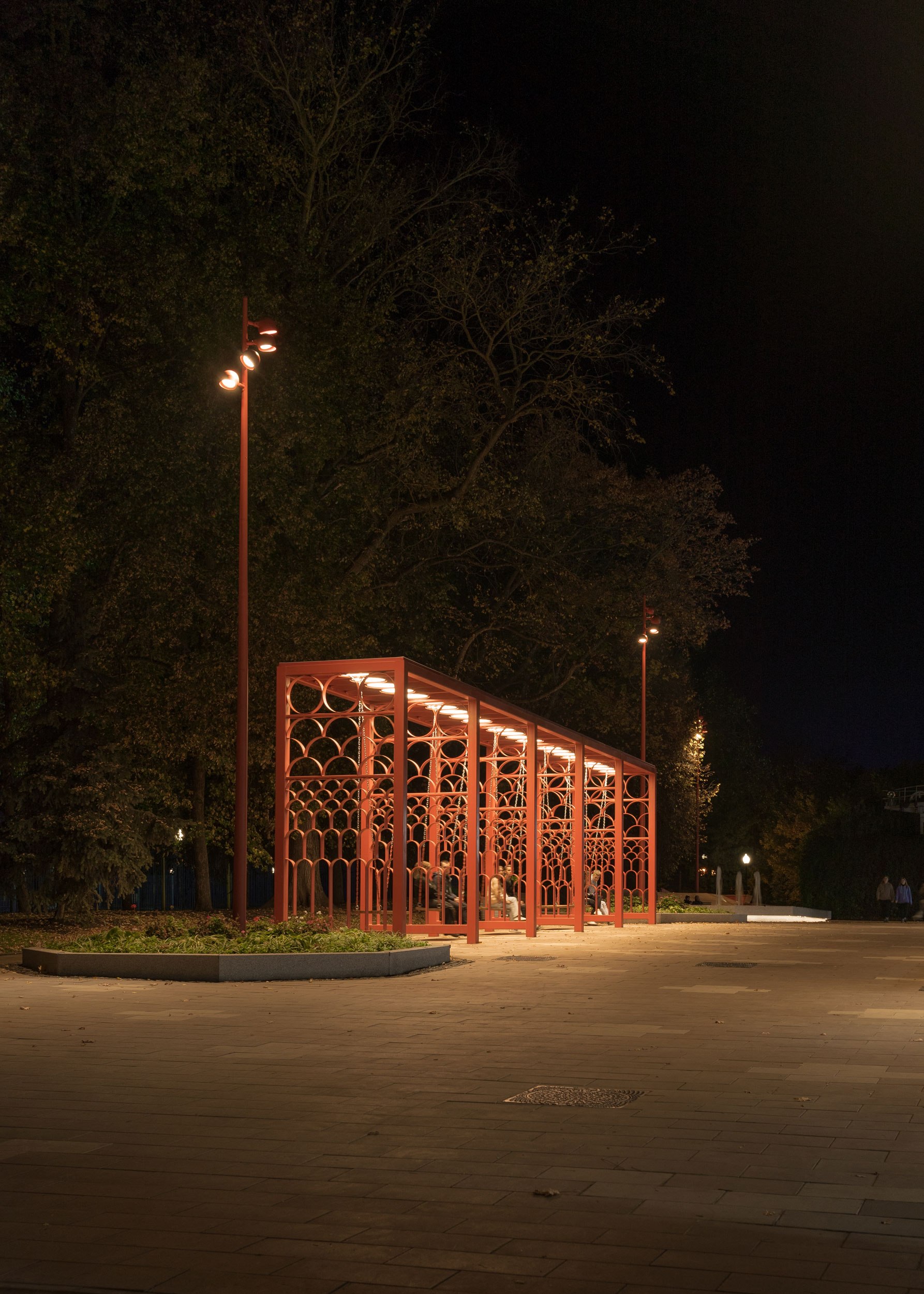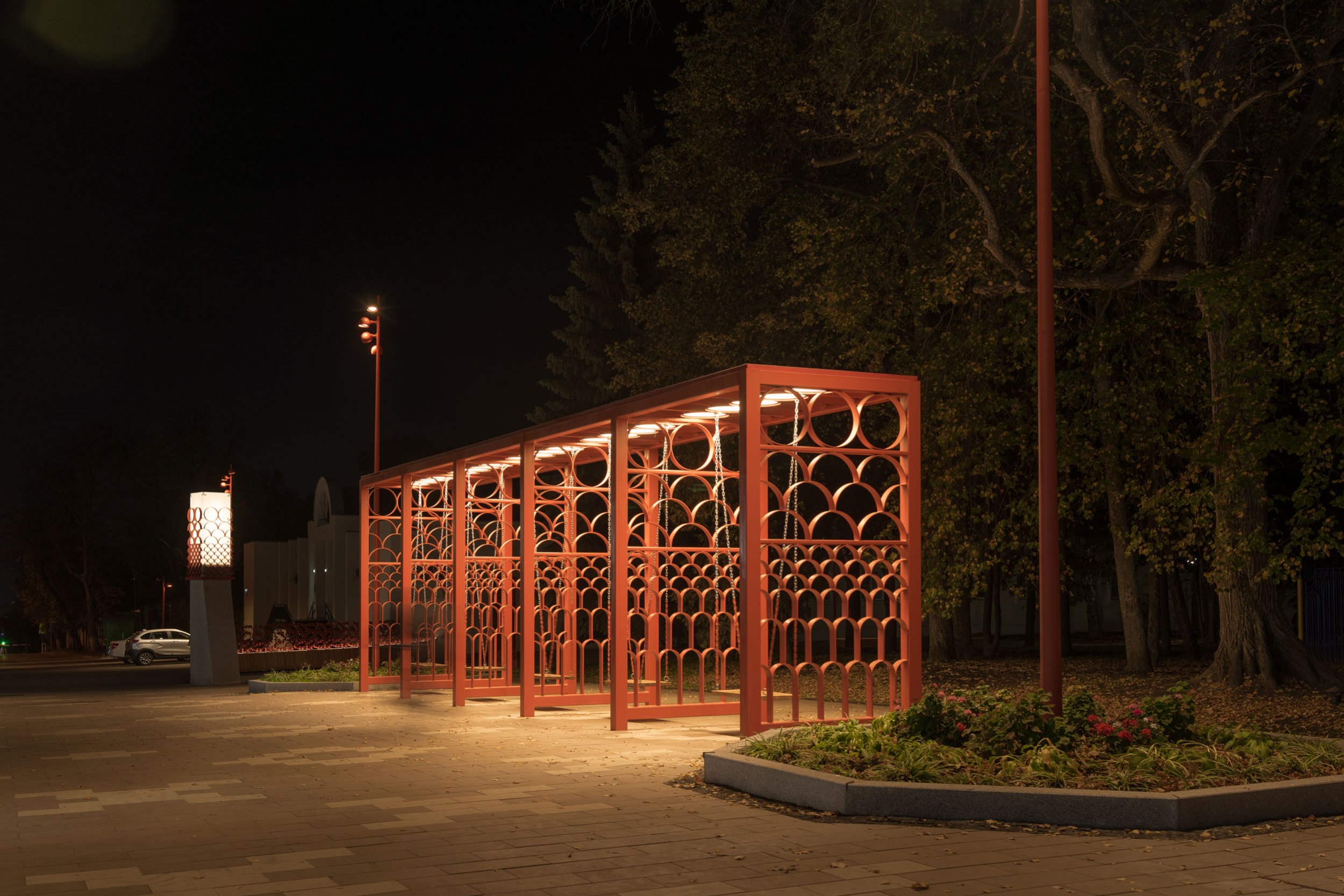 Удалось реализовать большое количество сложных, нетиповых МАФ (качели, входная группа, скамьи, амфитеатр, коммуникационные люки), которые придали индивидуальность центральному парку города.