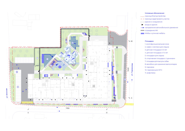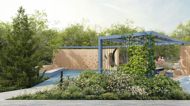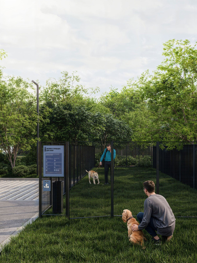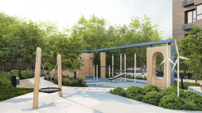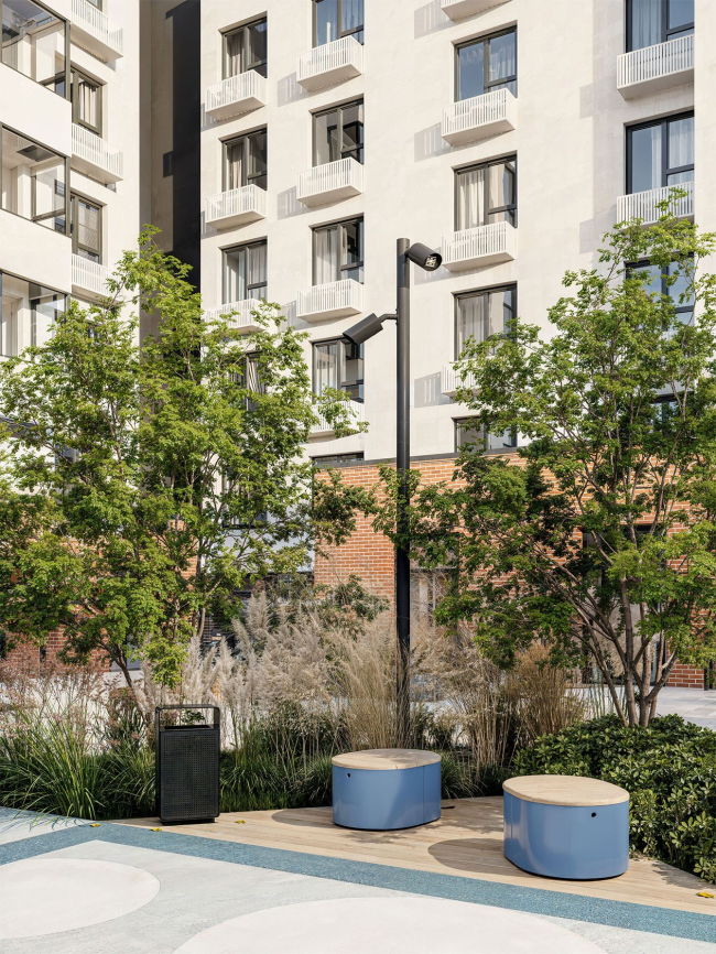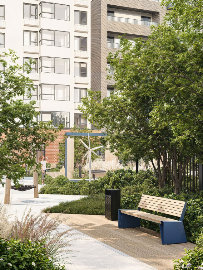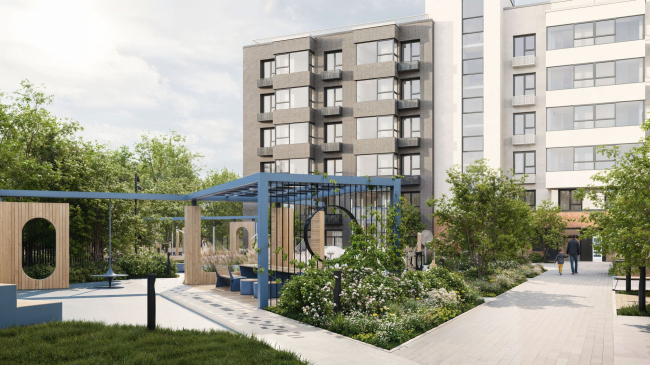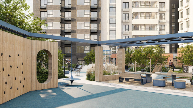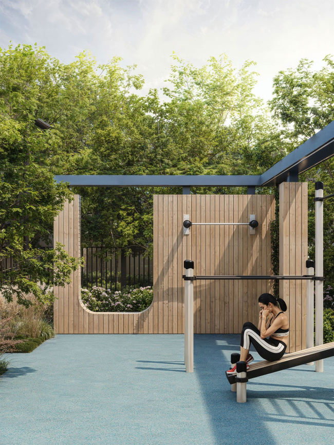 Команде BLOK STUDIO было важно подчеркнуть через архитектурные решения идею добрососедства и взаимодействия разных групп жителей комплекса. В том числе поэтому в центре двора расположен навес с большим столом, который станет местом сбора компаний и проведения соседских мероприятий. Во дворе ЖК также предусмотрена зона для детских праздников или йоги, а на спортивной площадке можно заниматься на тренажерах или проводить совместные тренировки в свободной зоне.