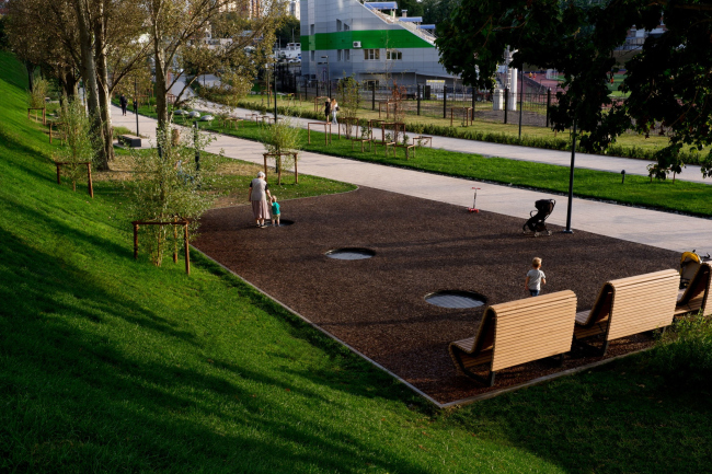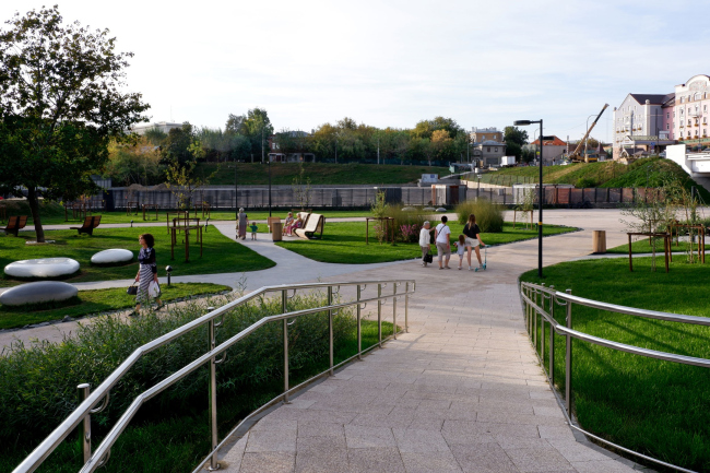 Включает в себя пешеходные зоны, веломаршрут, детские игровые зоны, спортивное ядро и зоны отдыха.