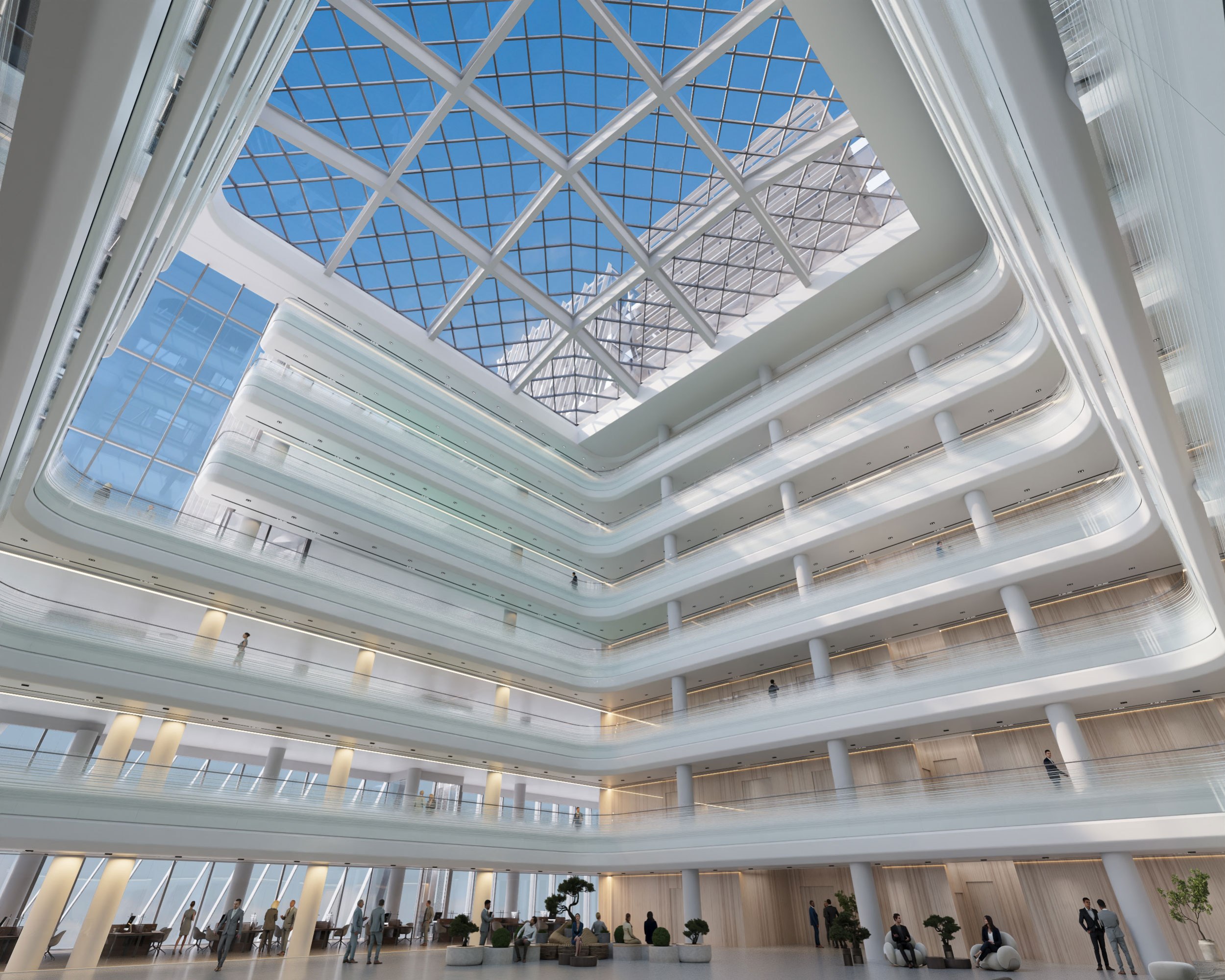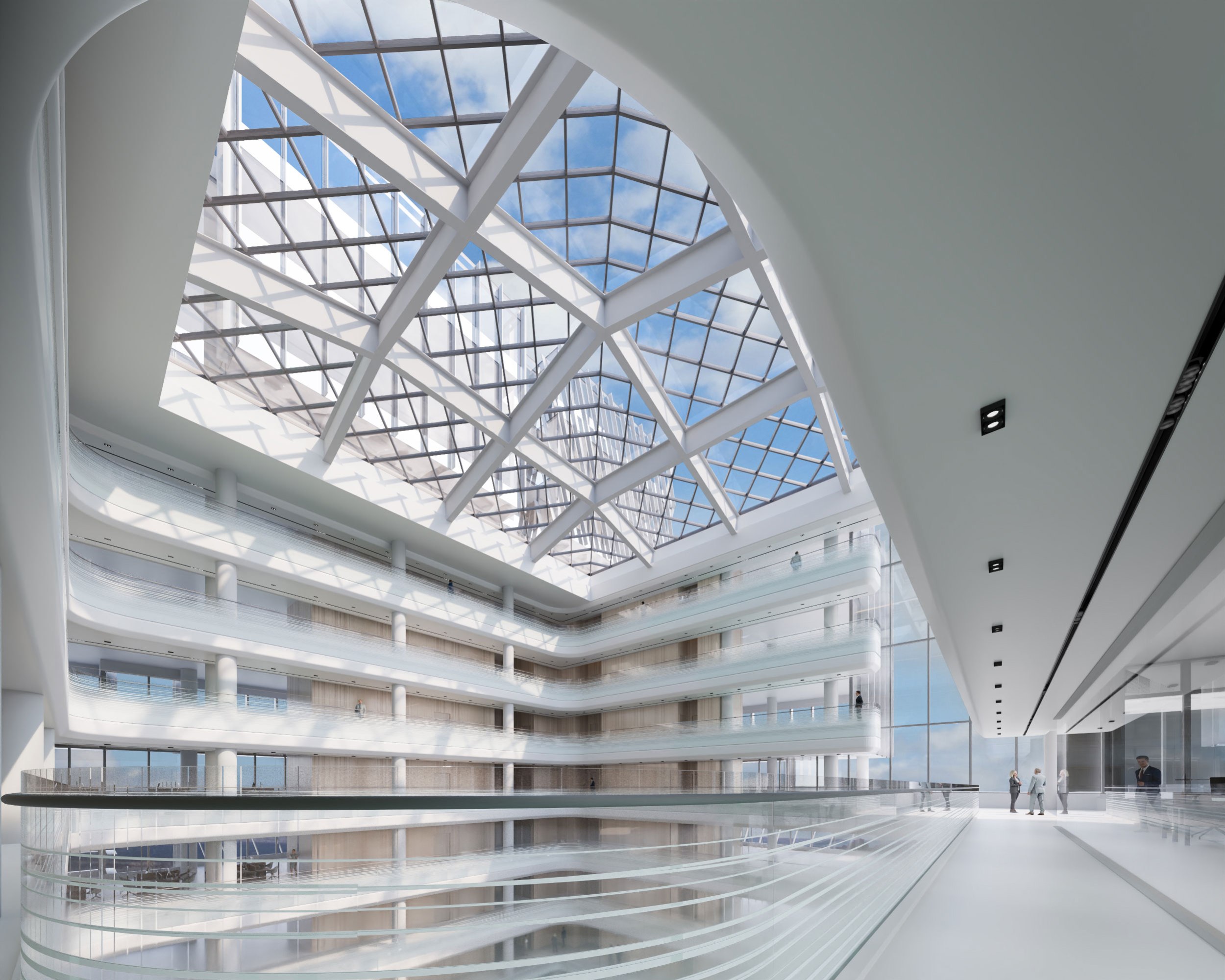 «Основной особенностью объекта является начинающийся со второго этажа просторный атриум высотой более 30 метров, накрытый сверху зенитным фонарем пирамидальной формы», – отметил сооснователь архитектурного бюро Soulstone Антон Баев.