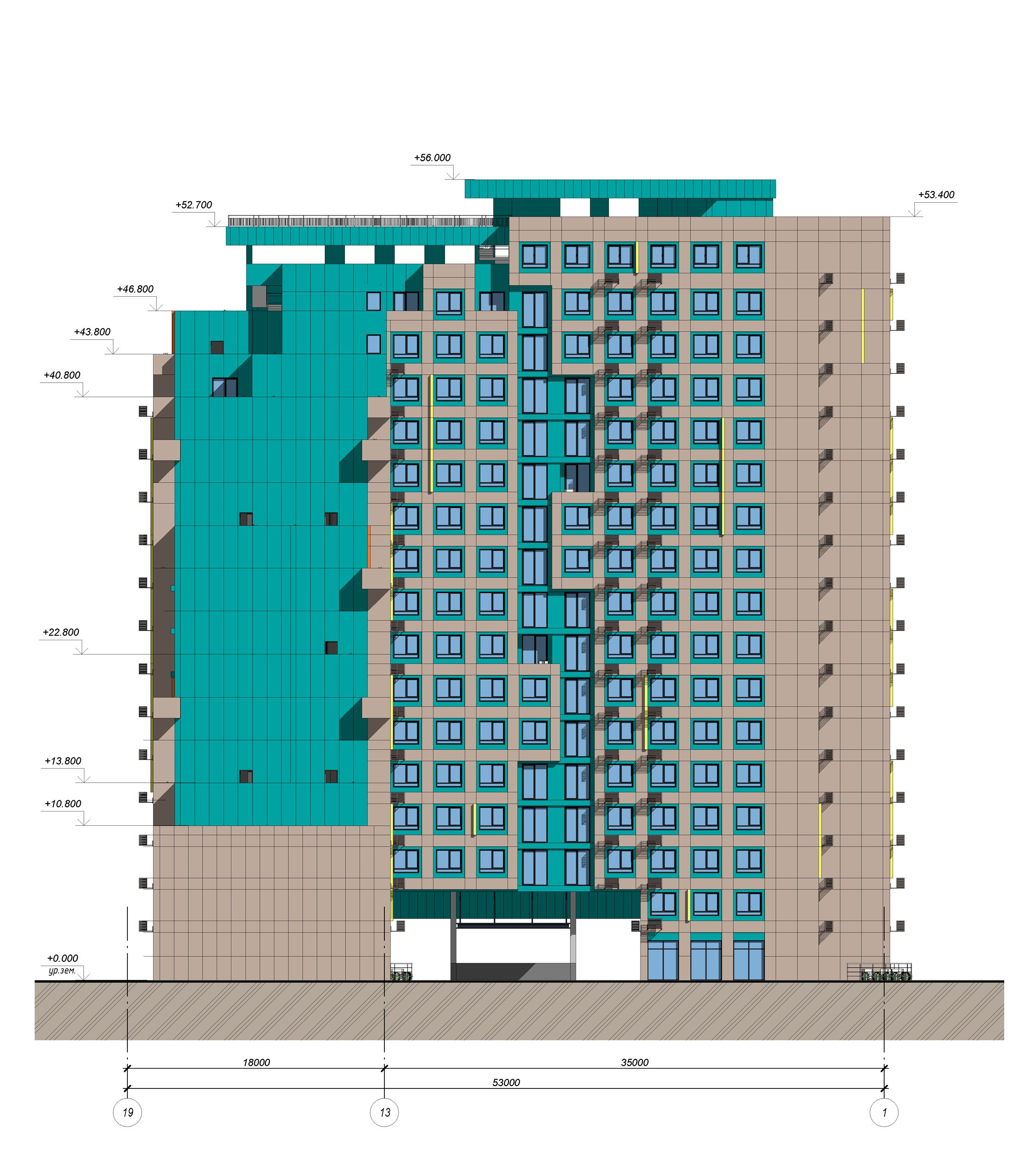 Цветовое решение подчинено архитектурной композиции. Палитра включает два основных цвета, сочетание которых акцентирует внимание на форме здания. Таким же лаконичным предполагается и декоративное оформление фасадов – его задачей является обеспечение цельности восприятия объекта.